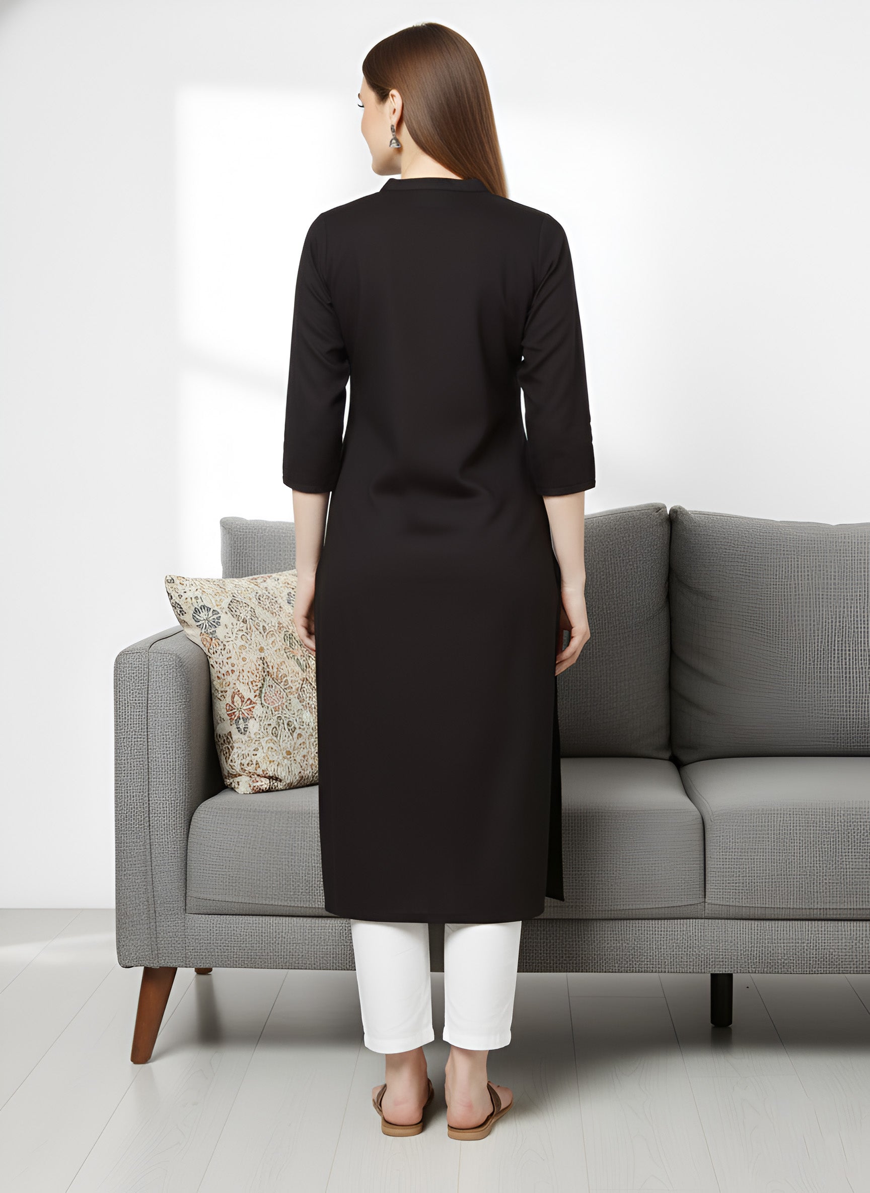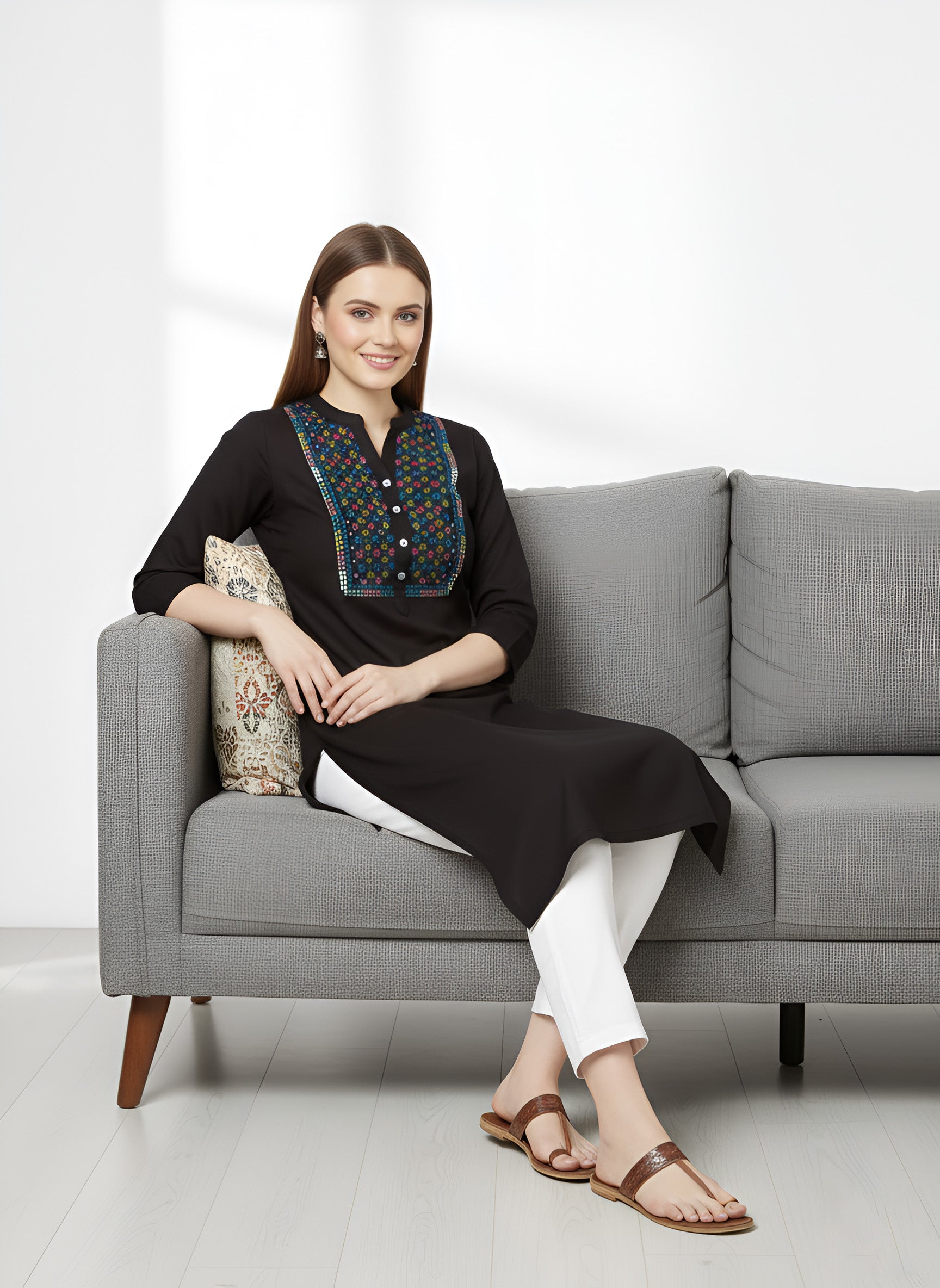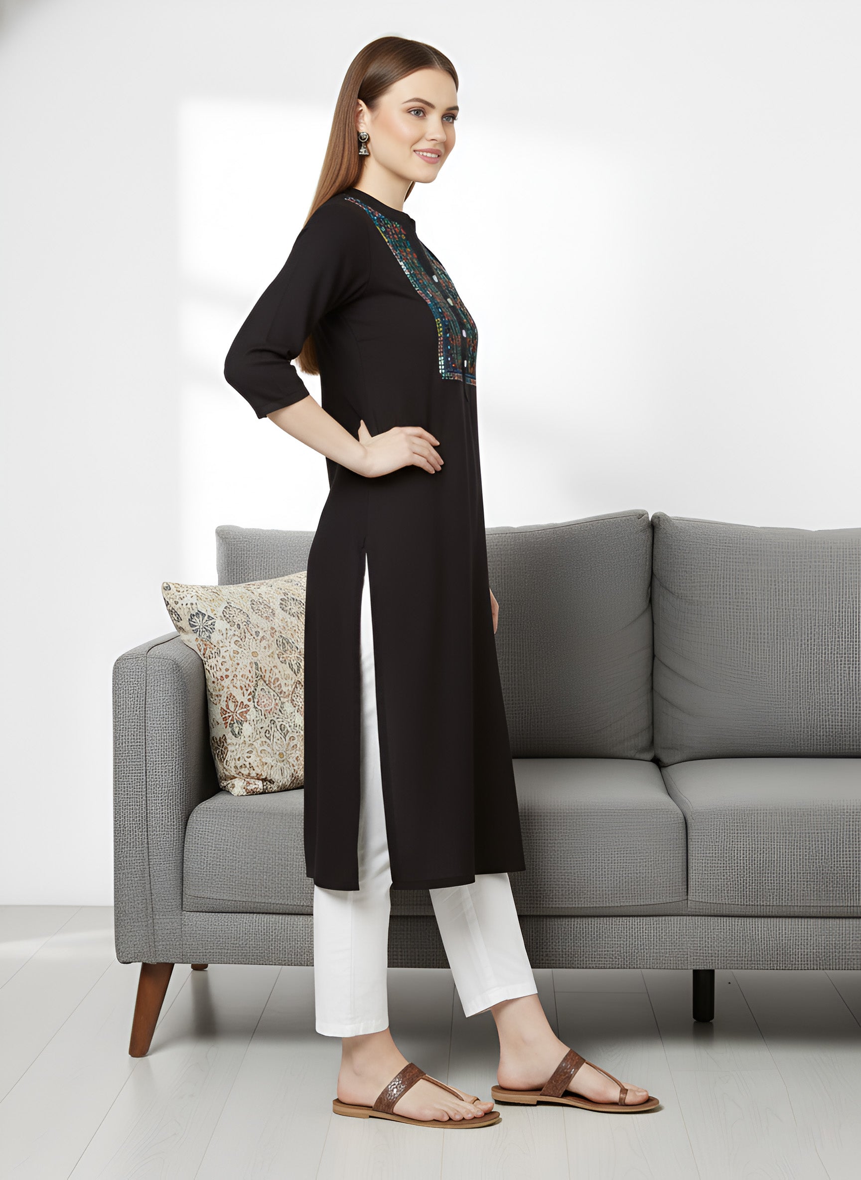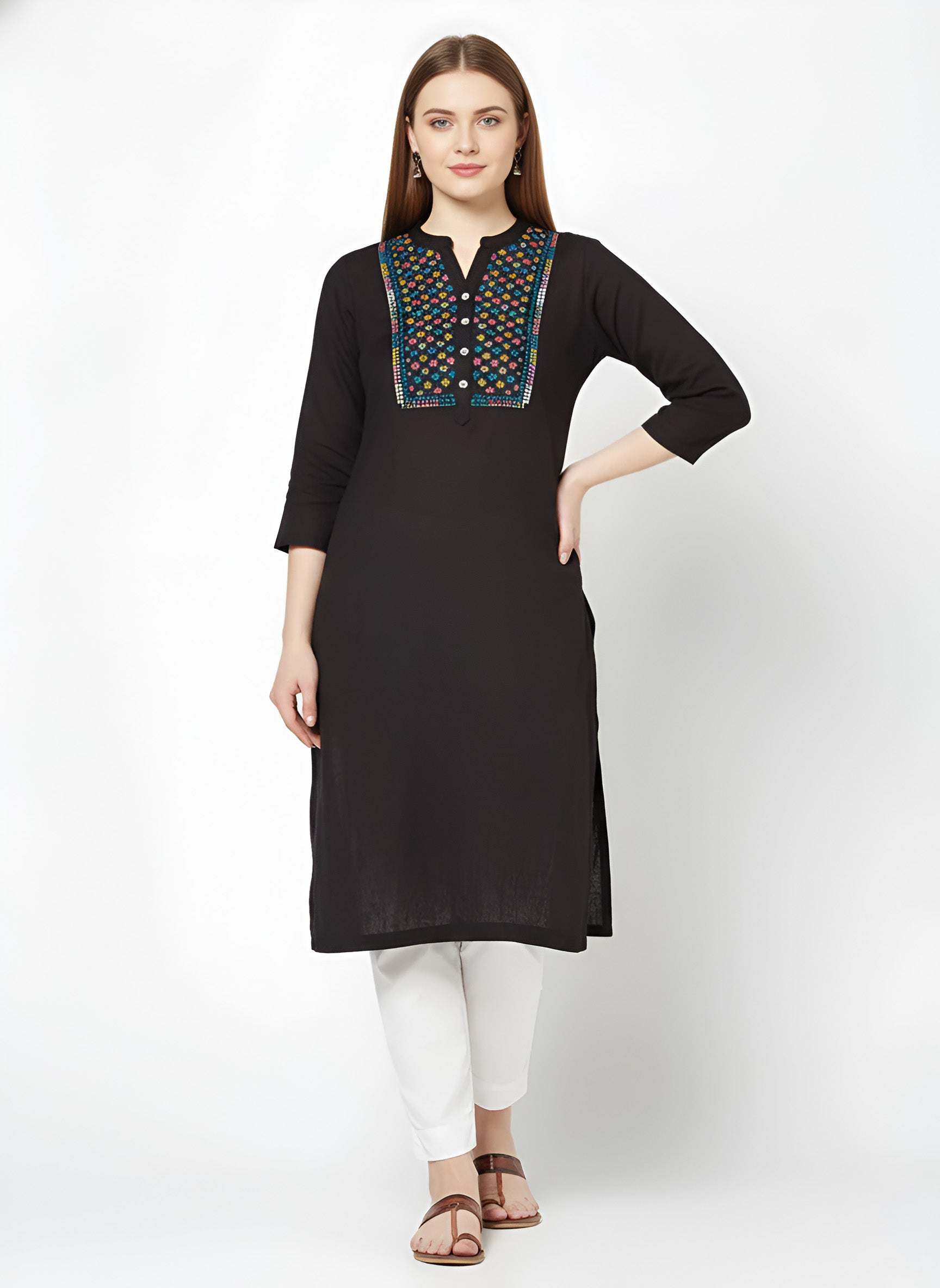 Heads are sure to turn as you step out in style by wearing this black embroidered straight kurta. designed from sumptuous lightweight cotton fabric for a breathable feel, this kurta features a stylish mandarin collar neck and 3/4th sleeves for a dash of contemporary charm. It has multicolor thread work on the yoke.