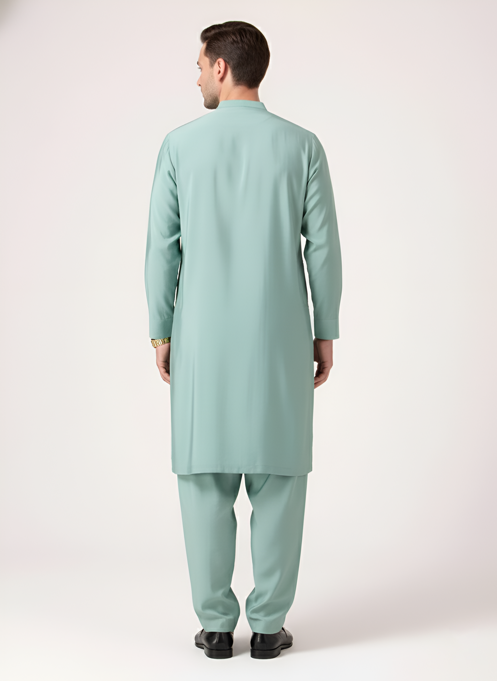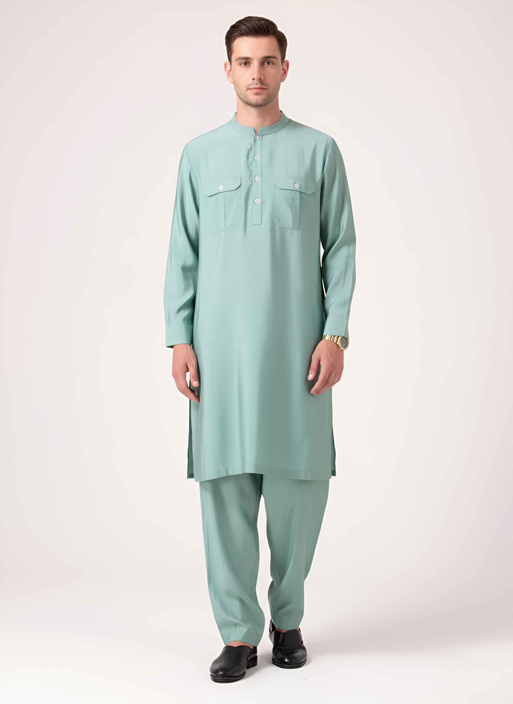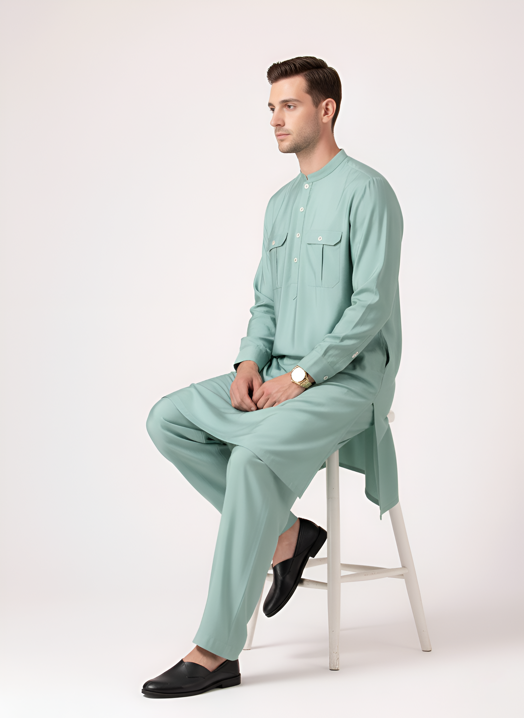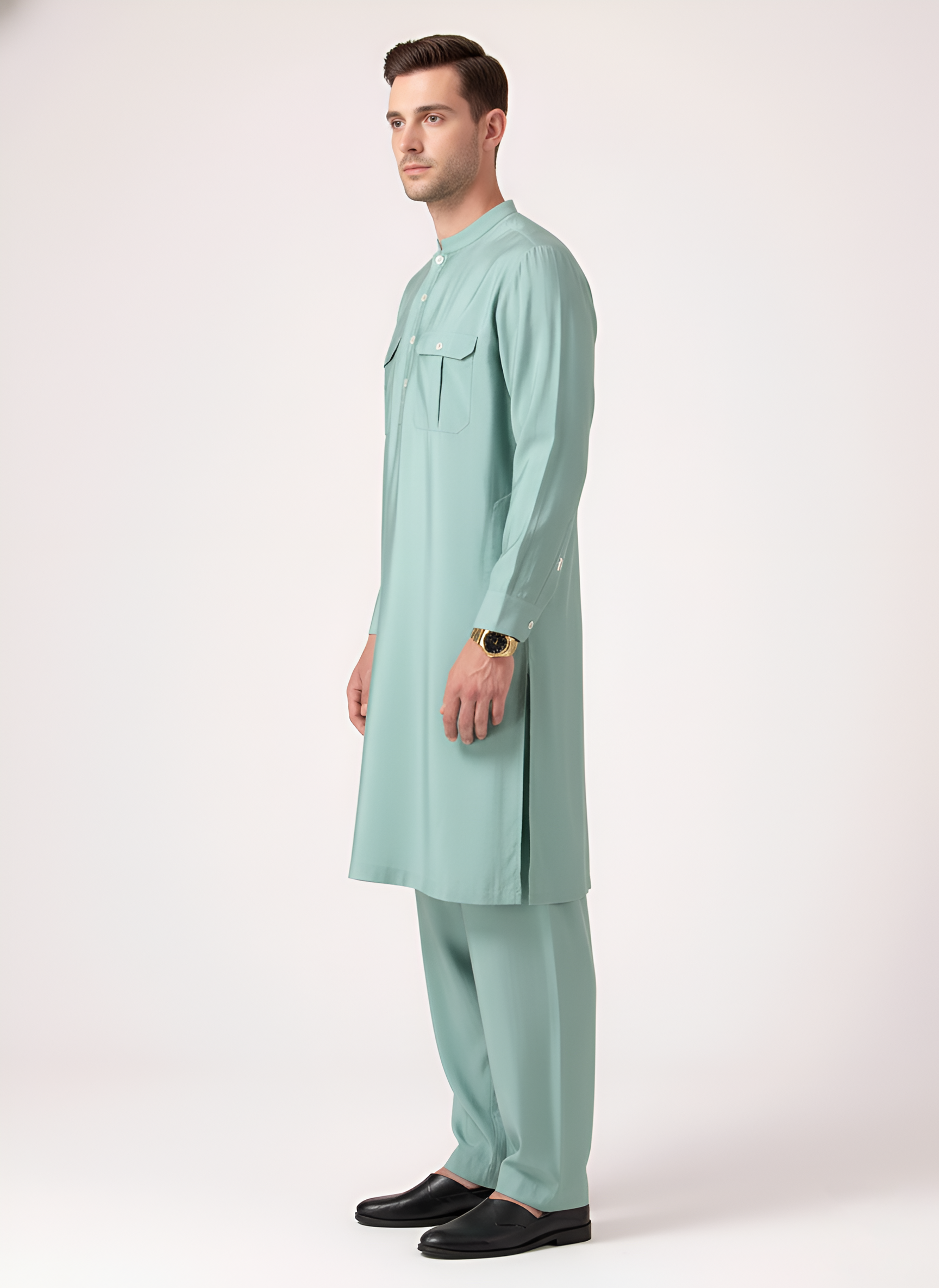 Exude timeless elegance with this pastel green classic kurta set, crafted for effortless style and comfort. The kurta features a mandarin collar with a buttoned placket and two front flap pockets, adding a structured yet minimalistic appeal. Designed with full sleeves and a straight-cut silhouette, this set is perfect for festive occasions, casual gatherings, or sophisticated ethnic wear. Paired with matching straight-fit trousers, this ensemble offers a refined and versatile look.