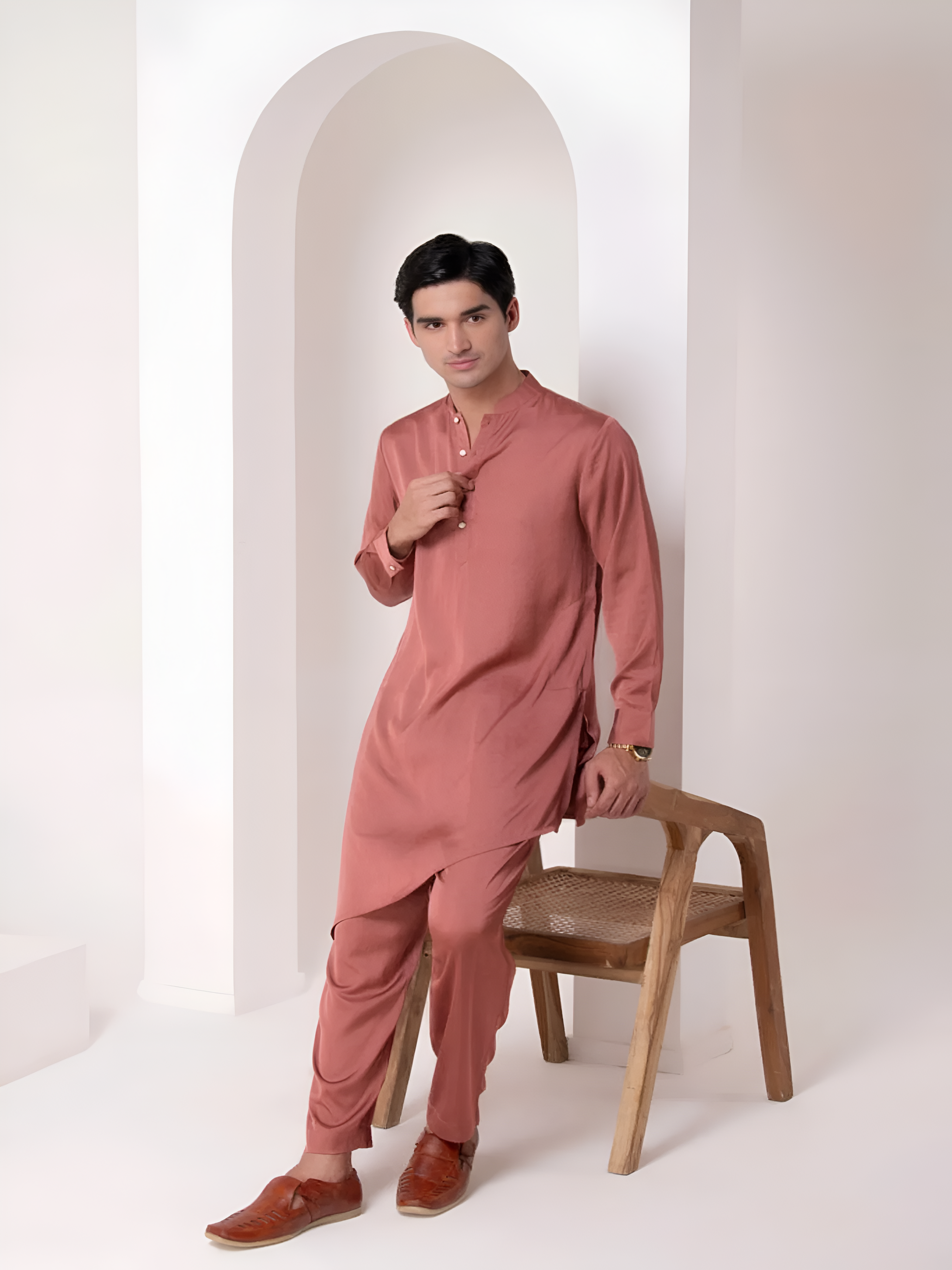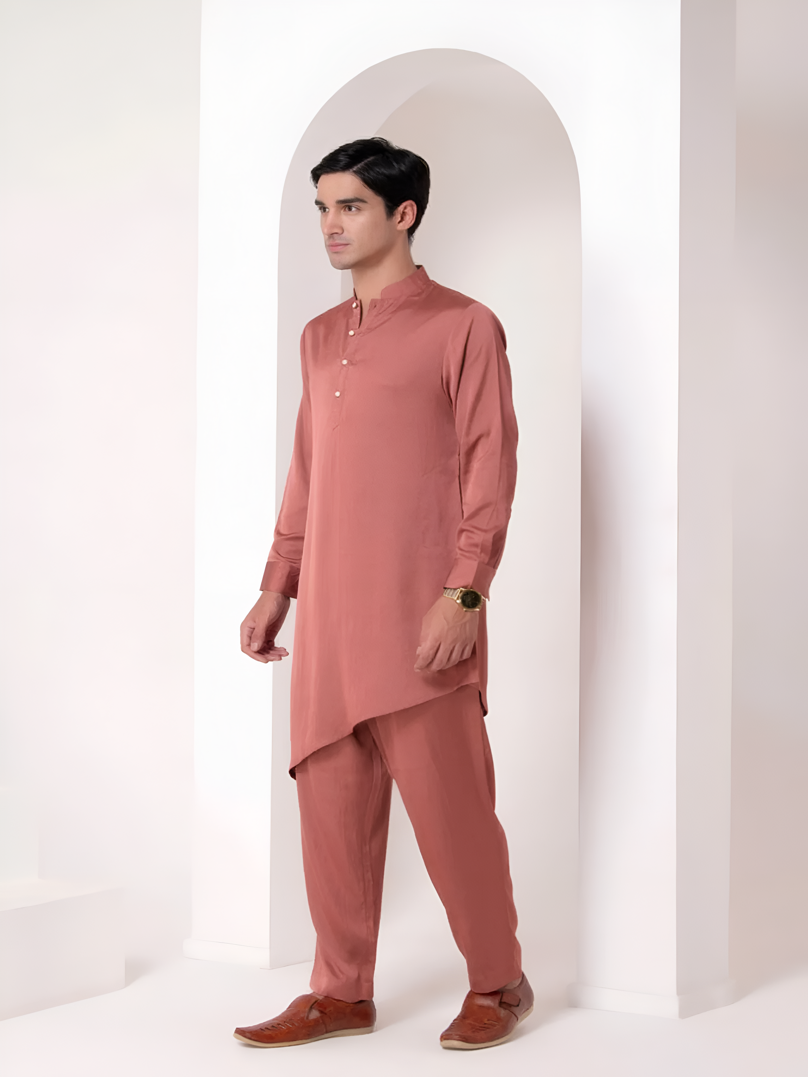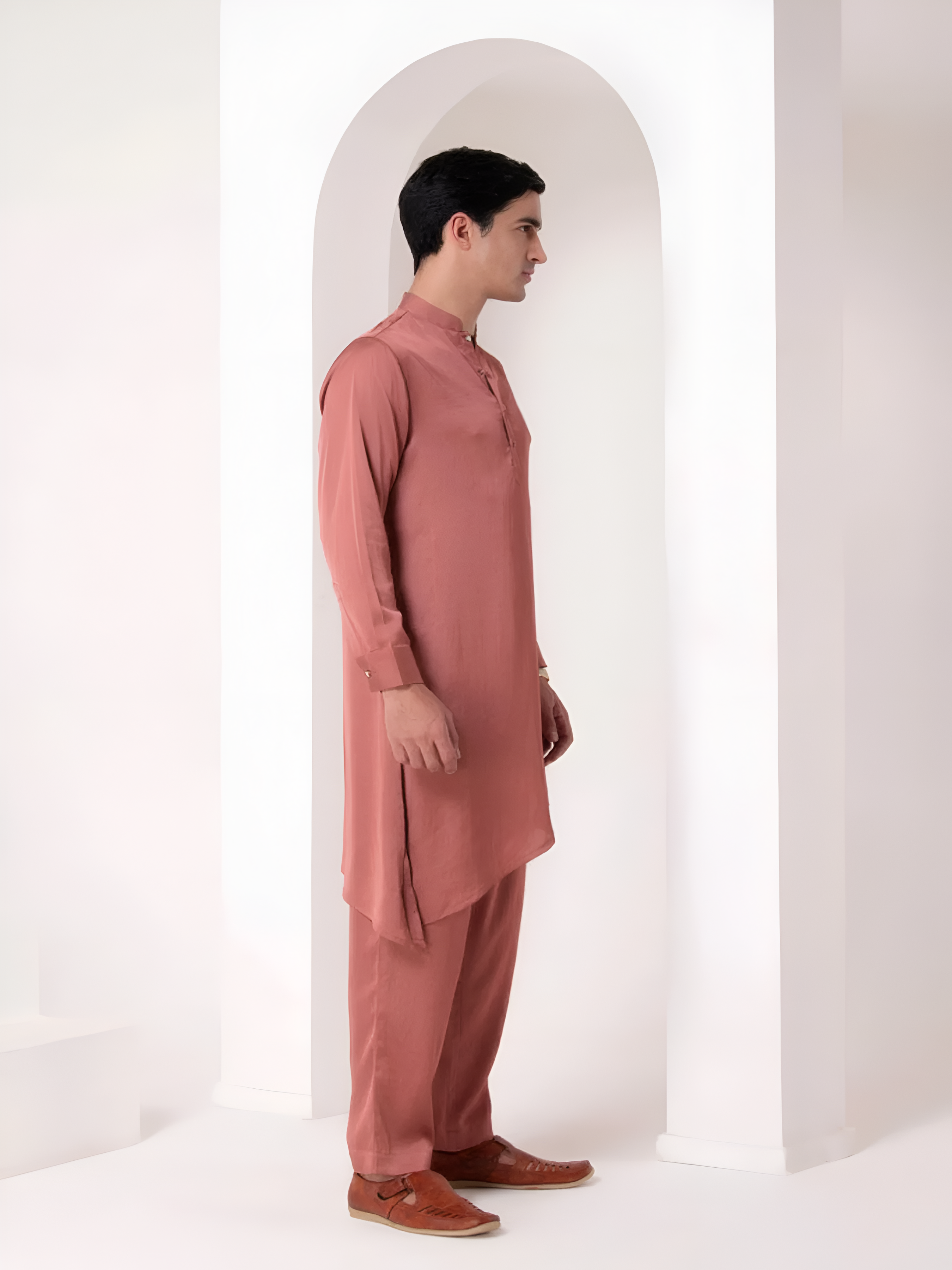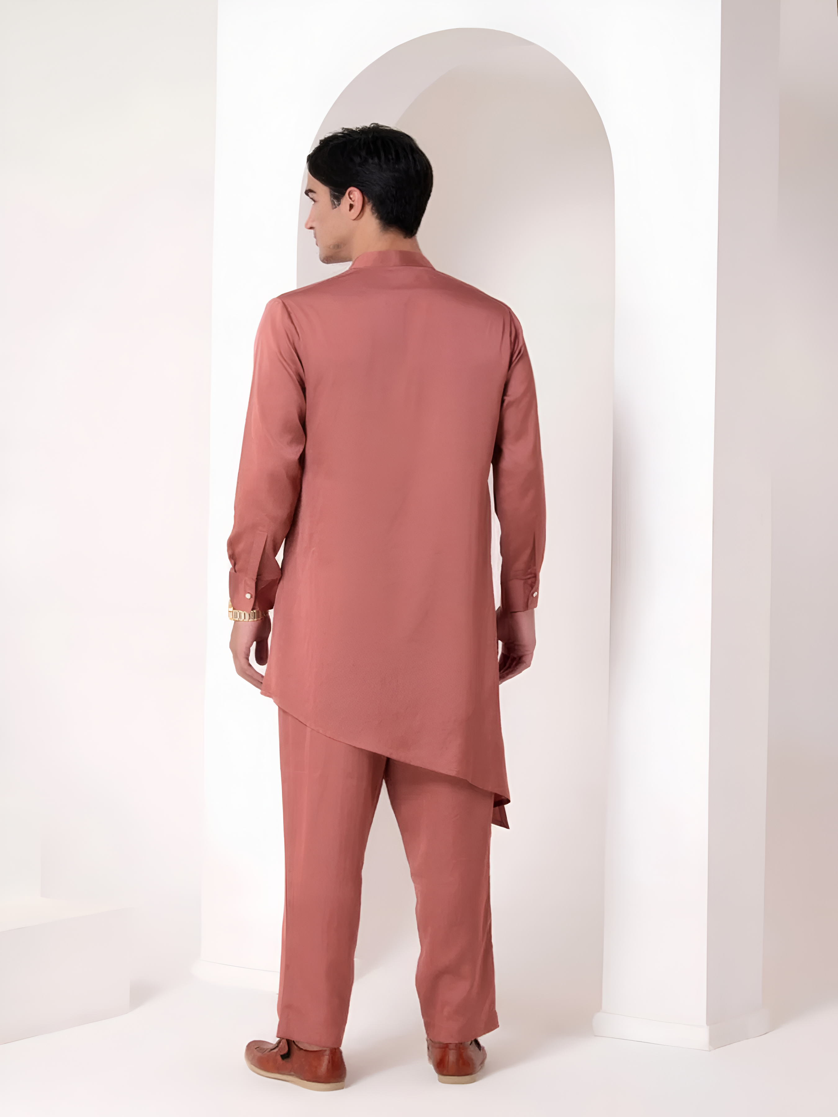 The straight-cut kurta features a mandarin collar, long sleeves, and an asymmetrical hemline. The pajama pants complement the kurta in the same terracotta shade, tailored for a slim fit.