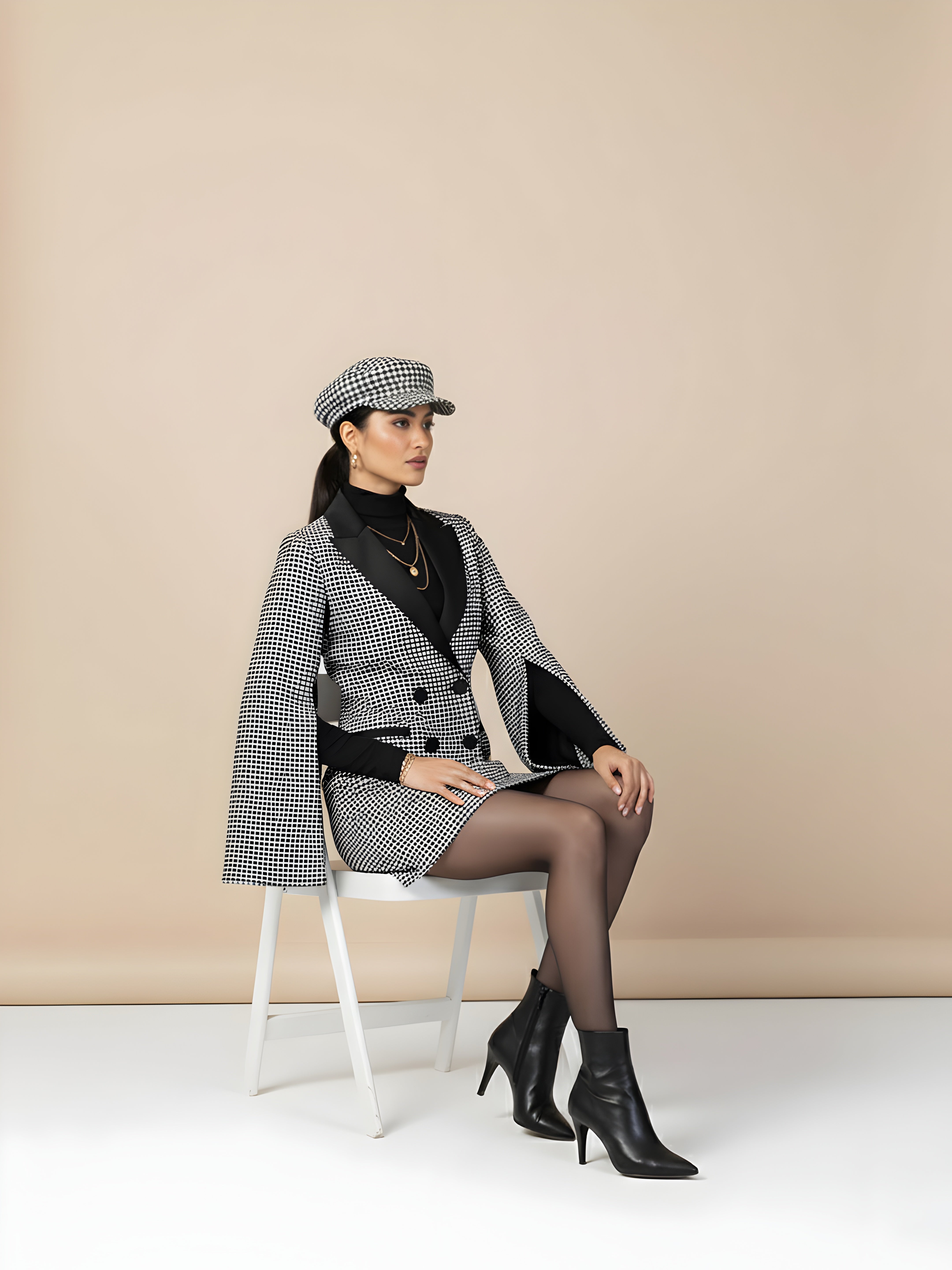 Pretty in flush is her vibe! anyone wearing this checked blazer dress will have a fun-loving fashion vibe for the day. beautifully knitted, this dress can shape any body type, ensuring a flattering fit for everyone. crafted from cozy, warm fabric, it combines style and comfort effortlessly. the asymmetric neckline adds a unique touch of sophistication. Pair it with a nice handbag and formal boots for that extra flair and embrace the season with confidence. style it with signature earrings for a complete look. whether it's a casual outing, dinner party, or office party, this dress promises to keep you both stylish and snug throughout the winter festivities.