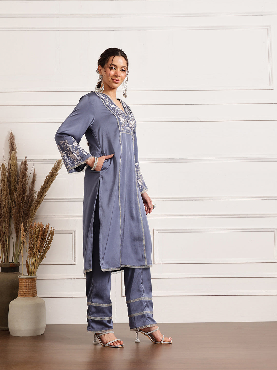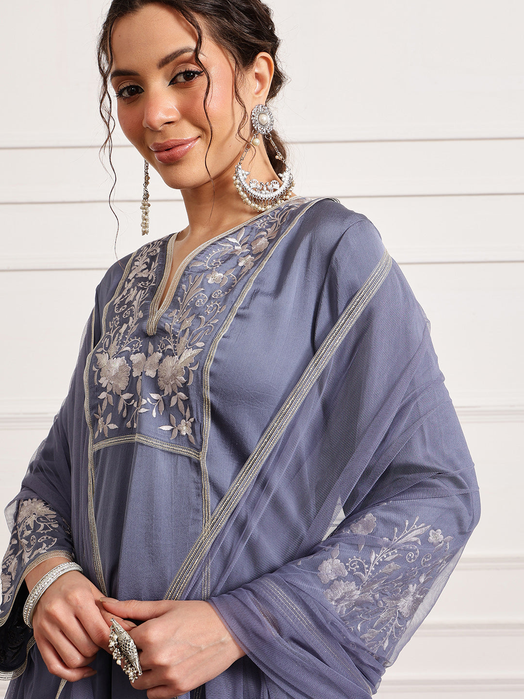 Pair this elegant ensemble with statement silver jewelry, embellished heels, and a sleek clutch for a refined ethnic look. Perfect for festive celebrations, formal events, and wedding functions, this outfit is a timeless addition to your wardrobe.