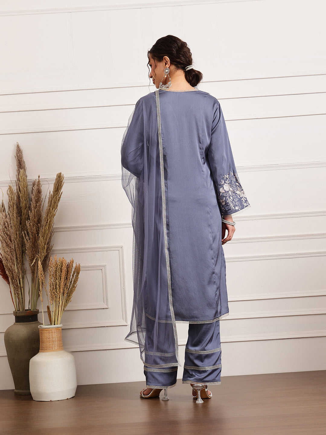 Exude grace and elegance with the Midnight Blue Embroidered Three-Piece Set, a perfect blend of sophistication and traditional charm. This set features a beautifully embroidered kurta with intricate floral patterns along the neckline and sleeves, enhancing its regal appeal. The straight-fit trousers with delicate lace detailing add a contemporary touch, while the lightweight organza dupatta completes the look with effortless grace. Ideal for festive occasions, wedding gatherings, or evening soirées, this set ensures you stand out in style.