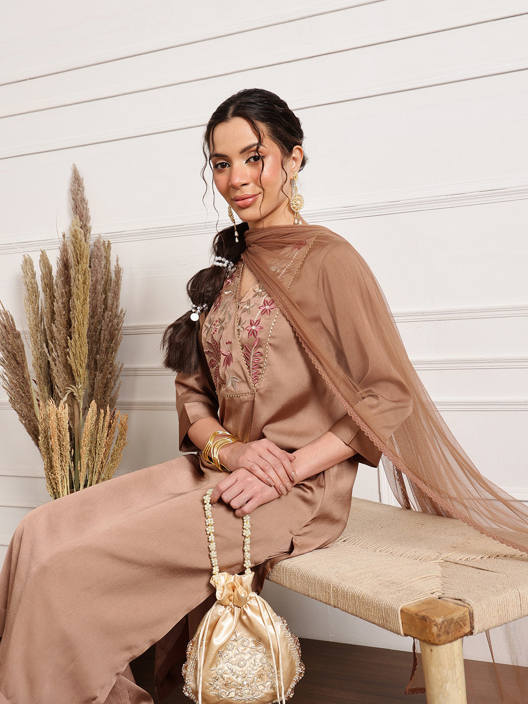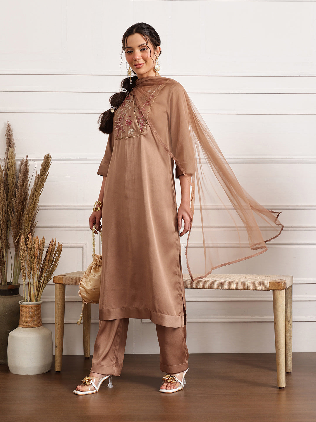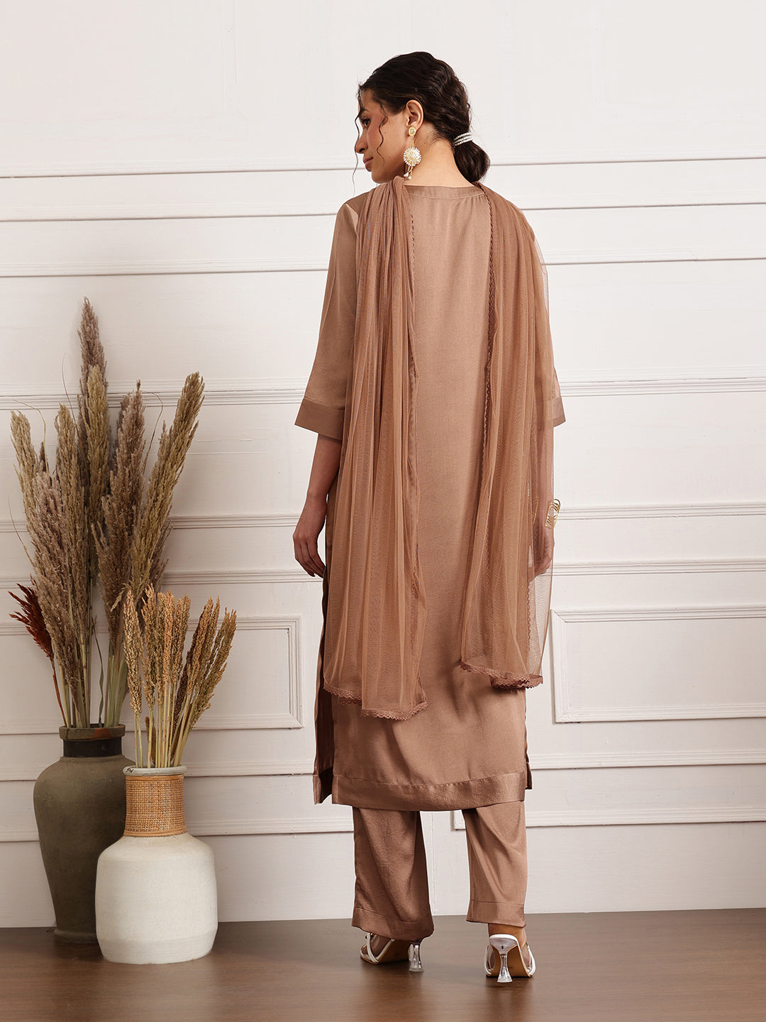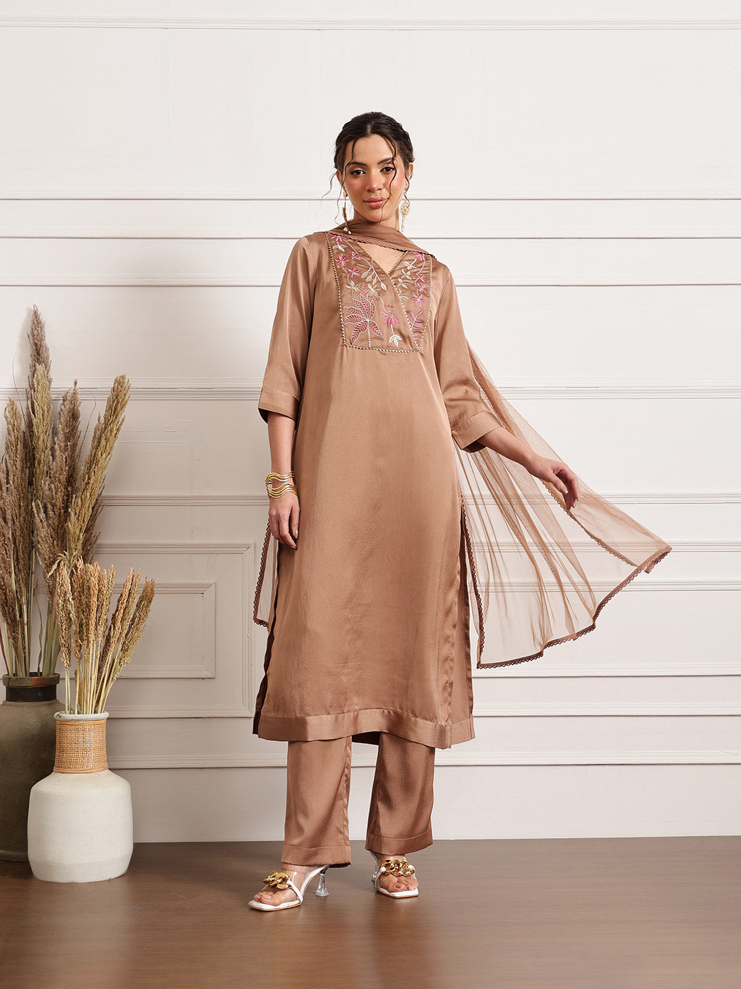 Indulge in understated luxury with the Mocha Elegance Embroidered Suit, a graceful ensemble perfect for any sophisticated occasion. This rich mocha-toned outfit features a long, straight-cut kurta adorned with intricate floral embroidery on the sheer neckline panel, adding a delicate feminine touch. The smooth, satin-like fabric enhances the outfit's fluid drape, ensuring comfort and style. The set is completed with tailored straight-fit trousers and a sheer, embroidered dupatta that adds an ethereal charm. Ideal for festive celebrations, formal gatherings, or evening soirées.