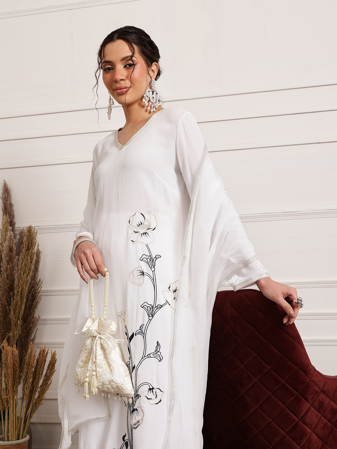 Step into effortless elegance with the Ivory Elegance Embroidered Three-Piece Set, a perfect blend of minimalism and sophistication. This set features a flowing ivory kurta with a delicate V-neckline, adorned with a stunning black floral embroidered motif along one side for a modern artistic touch. The straight-cut trousers ensure a sleek, flattering silhouette, while the airy organza dupatta with subtle lace detailing completes the ensemble with an ethereal charm. Ideal for festive gatherings, summer soirées, or elegant daytime events, this outfit embodies understated luxury.
