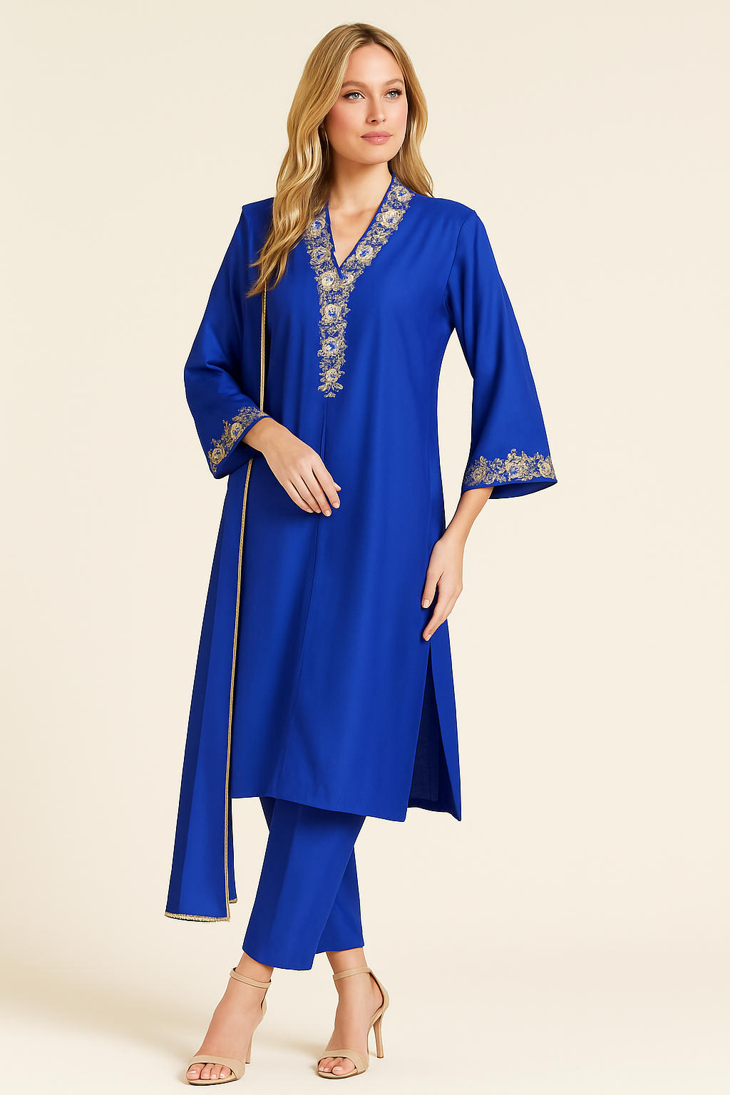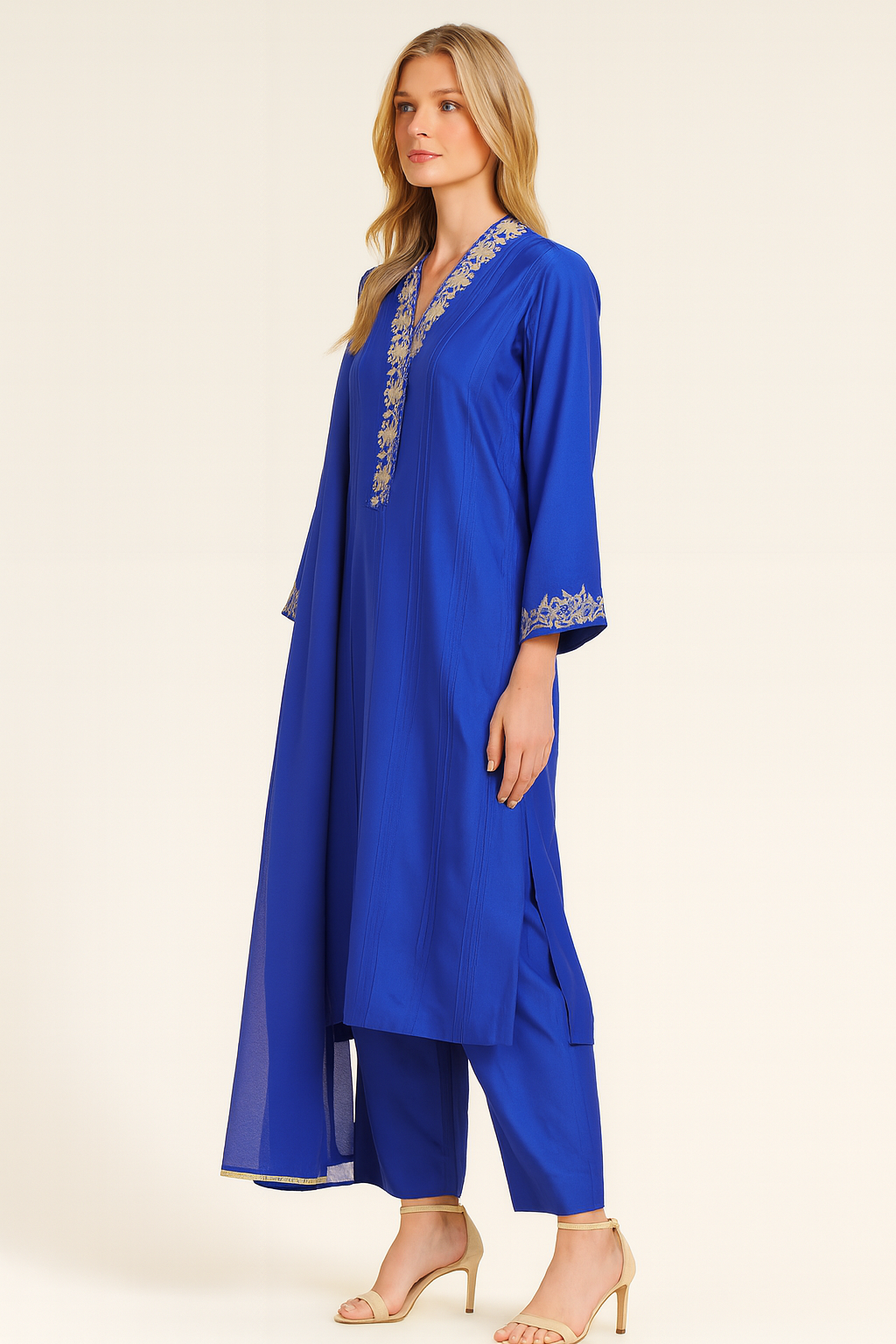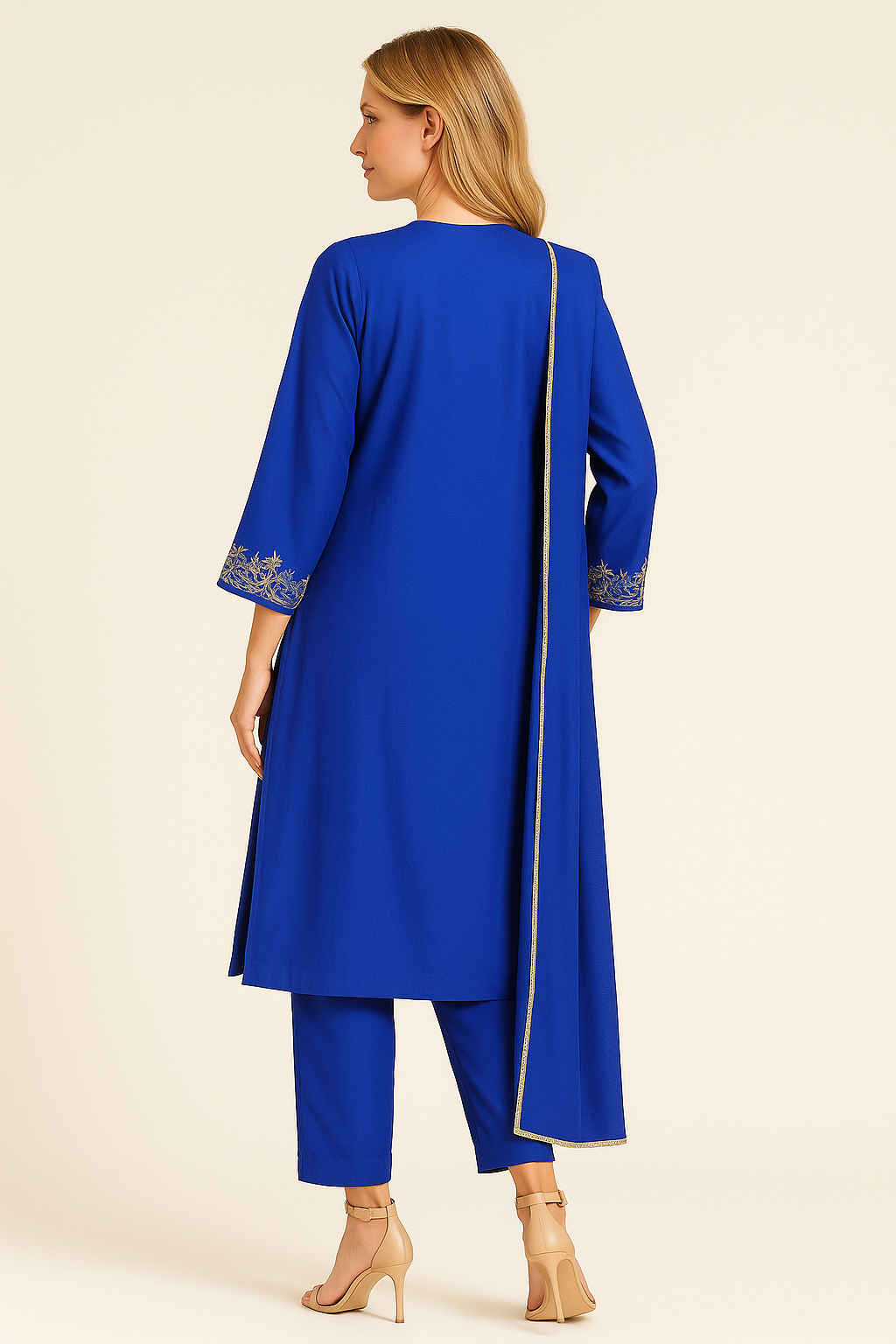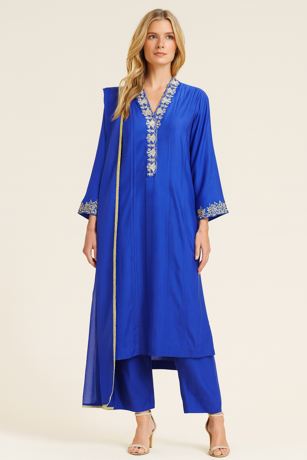 Elevated elegance meets effortless ease—this royal blue kurta set is defined by its sharp silhouette and intricate embroidery. Featuring floral-threaded detailing along the neckline and cuffs, it adds just the right amount of statement. The flowy kurta is paired with matching straight-fit pants and a coordinating dupatta, making it your go-to for refined daytime affairs or intimate evenings.