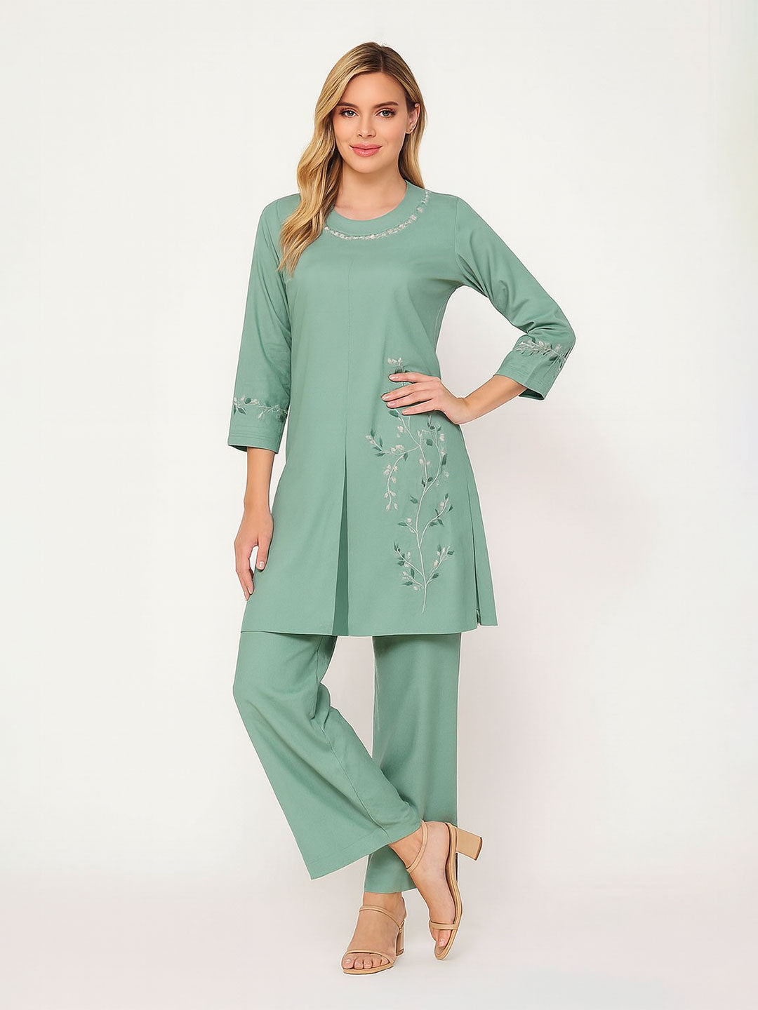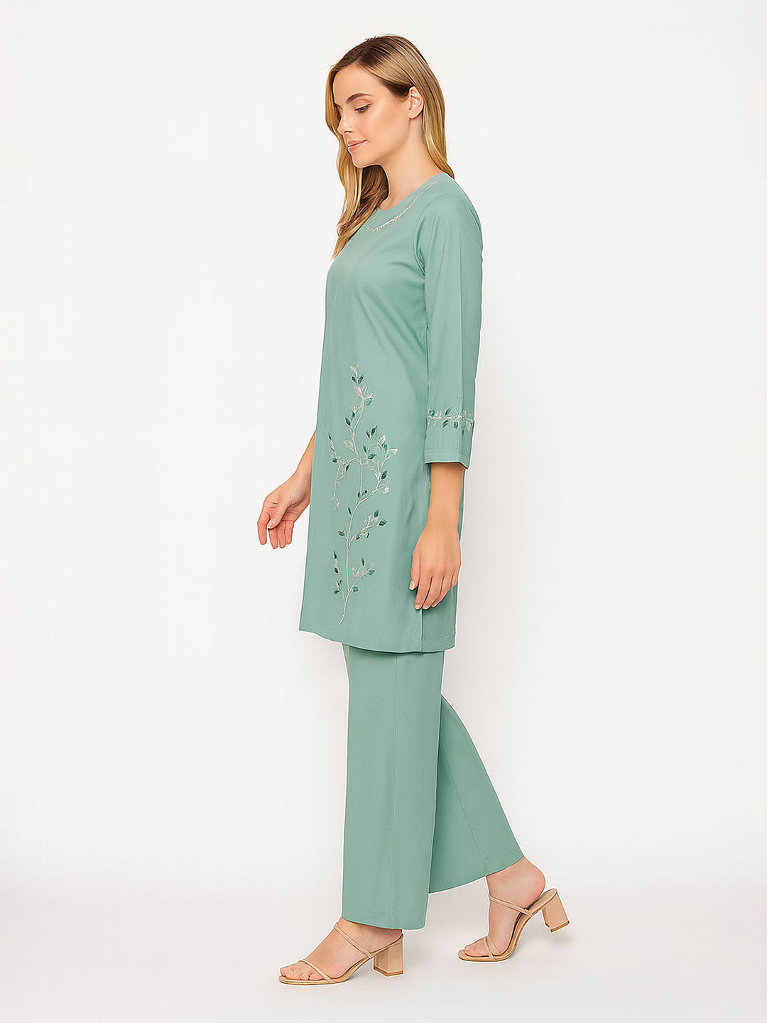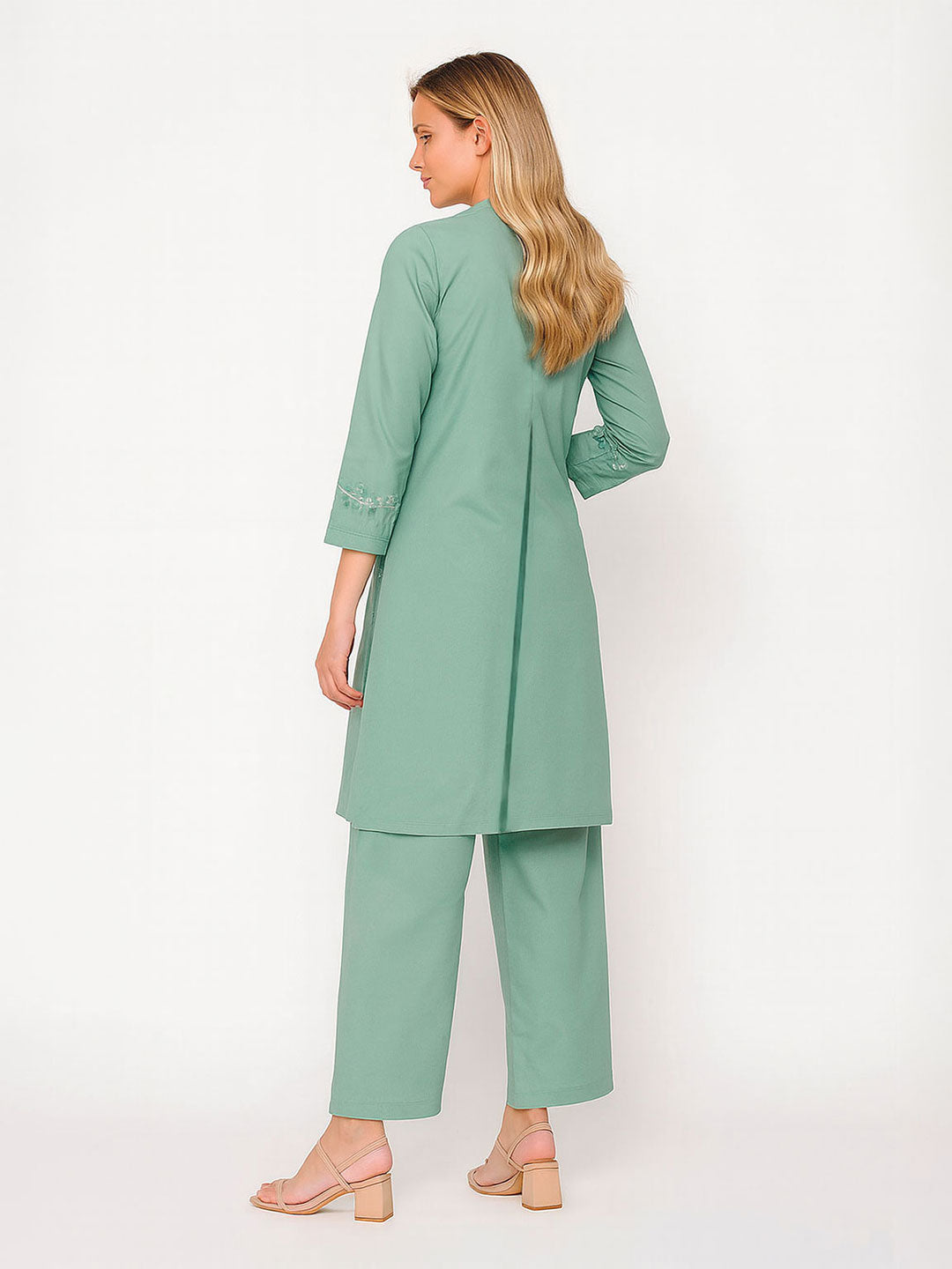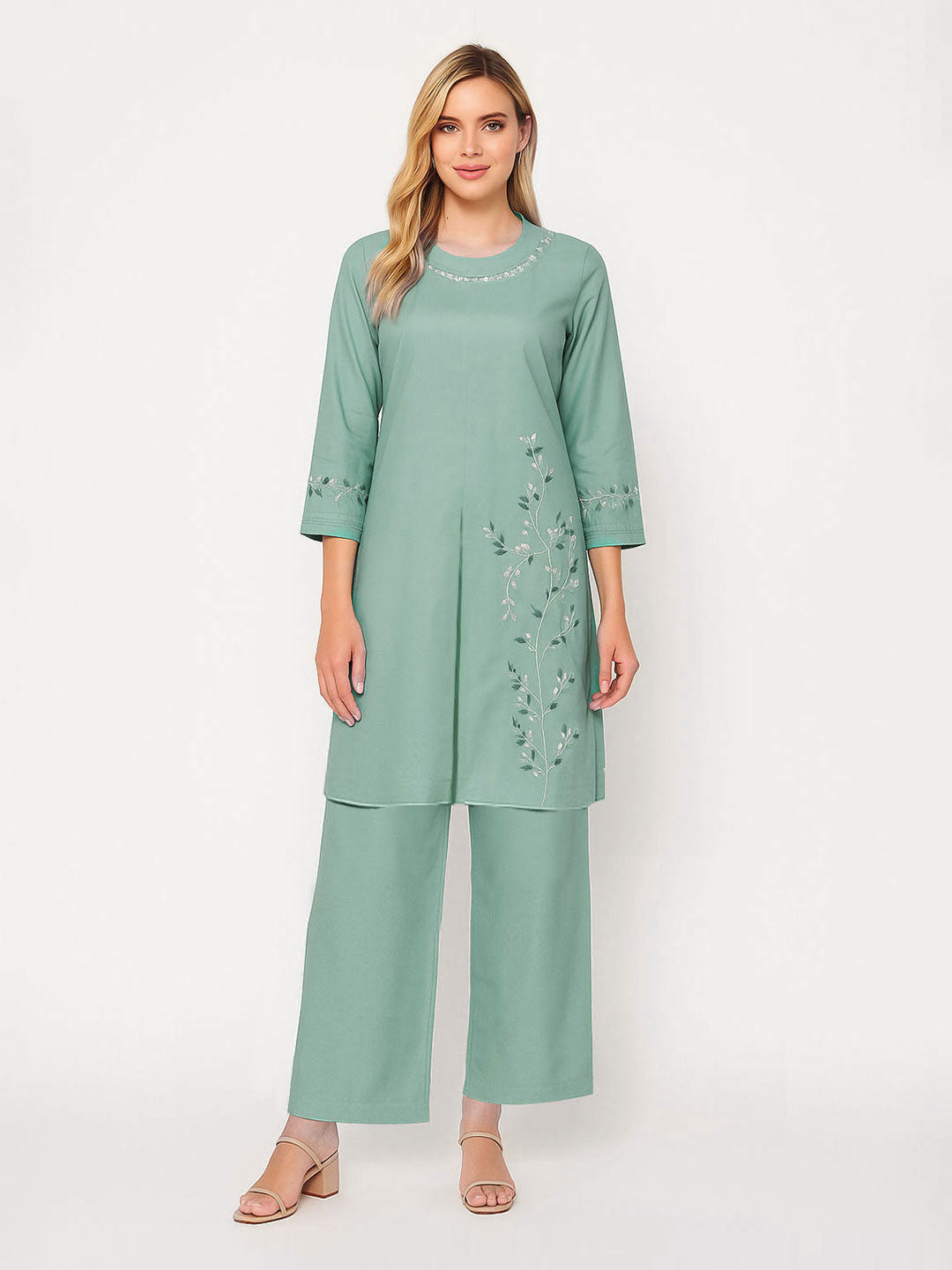 This is a beautiful seafoam green kurta and trouser set featuring delicate floral embroidery. The set is perfect for a casual or semi-formal occasion. The kurta has a V-neckline and long sleeves with a floral pattern on the cuffs. The trousers are slim-fitting and ankle-length.