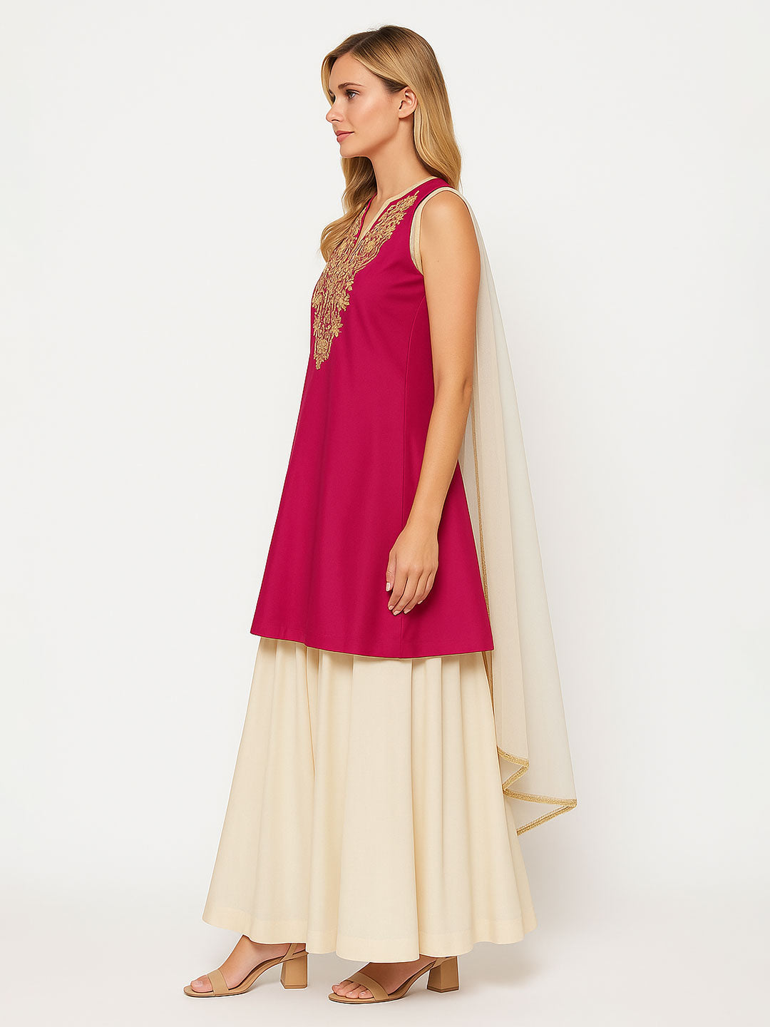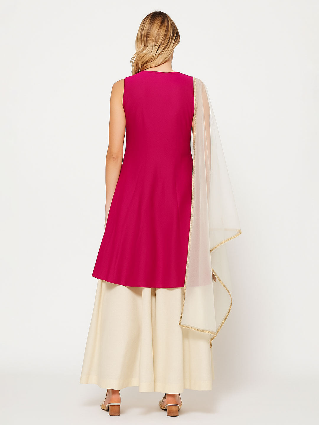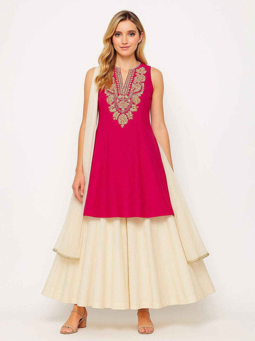 Graceful and festive, this Pink Embroidered Kurta Set is designed with intricate golden thread embroidery on the neckline and front panel, adding a rich touch of elegance. The sleeveless kurta features a notched round neckline and straight silhouette, paired with flowy ivory palazzo pants for comfort and movement. The sheer ivory dupatta with golden border completes the look, making it an ideal pick for festive occasions, celebrations, or traditional gatherings.