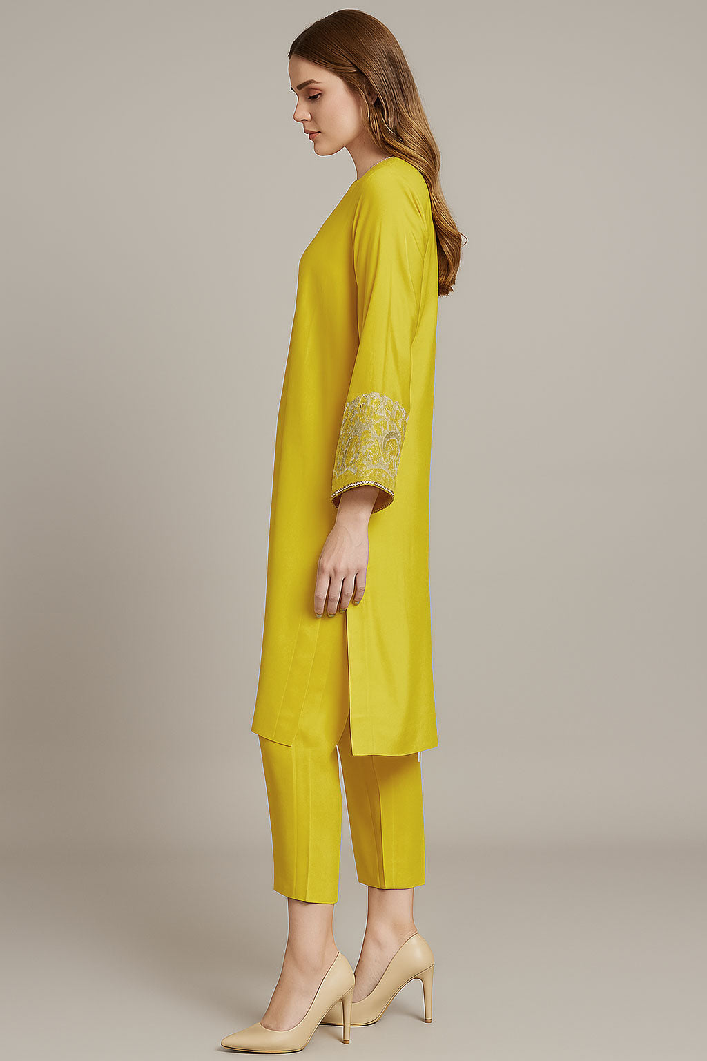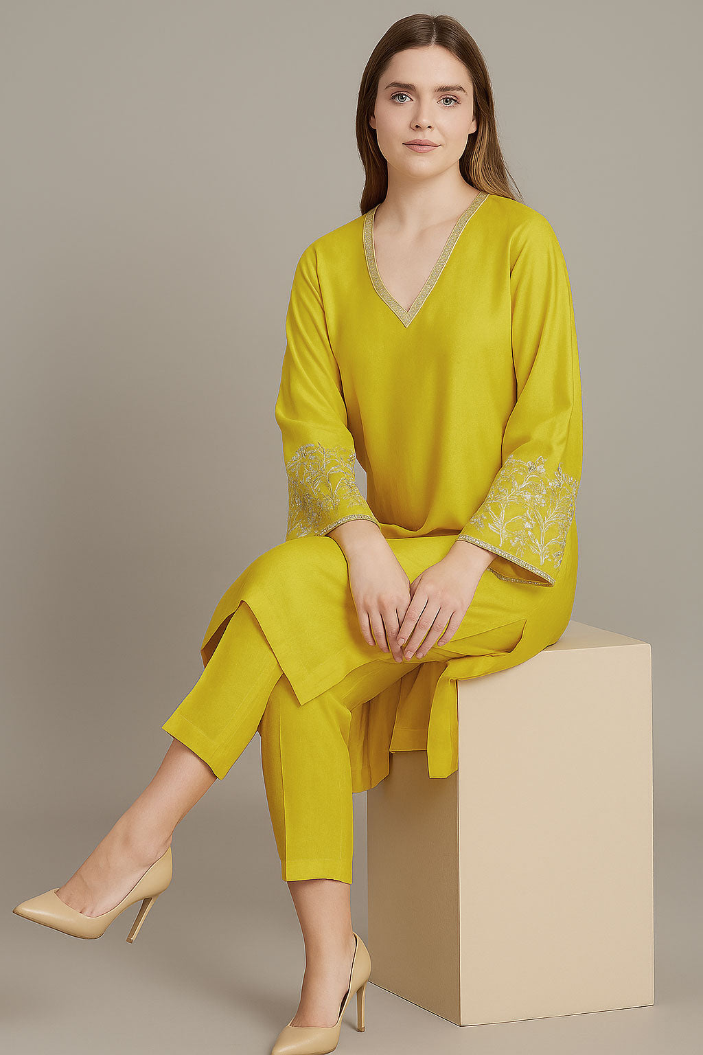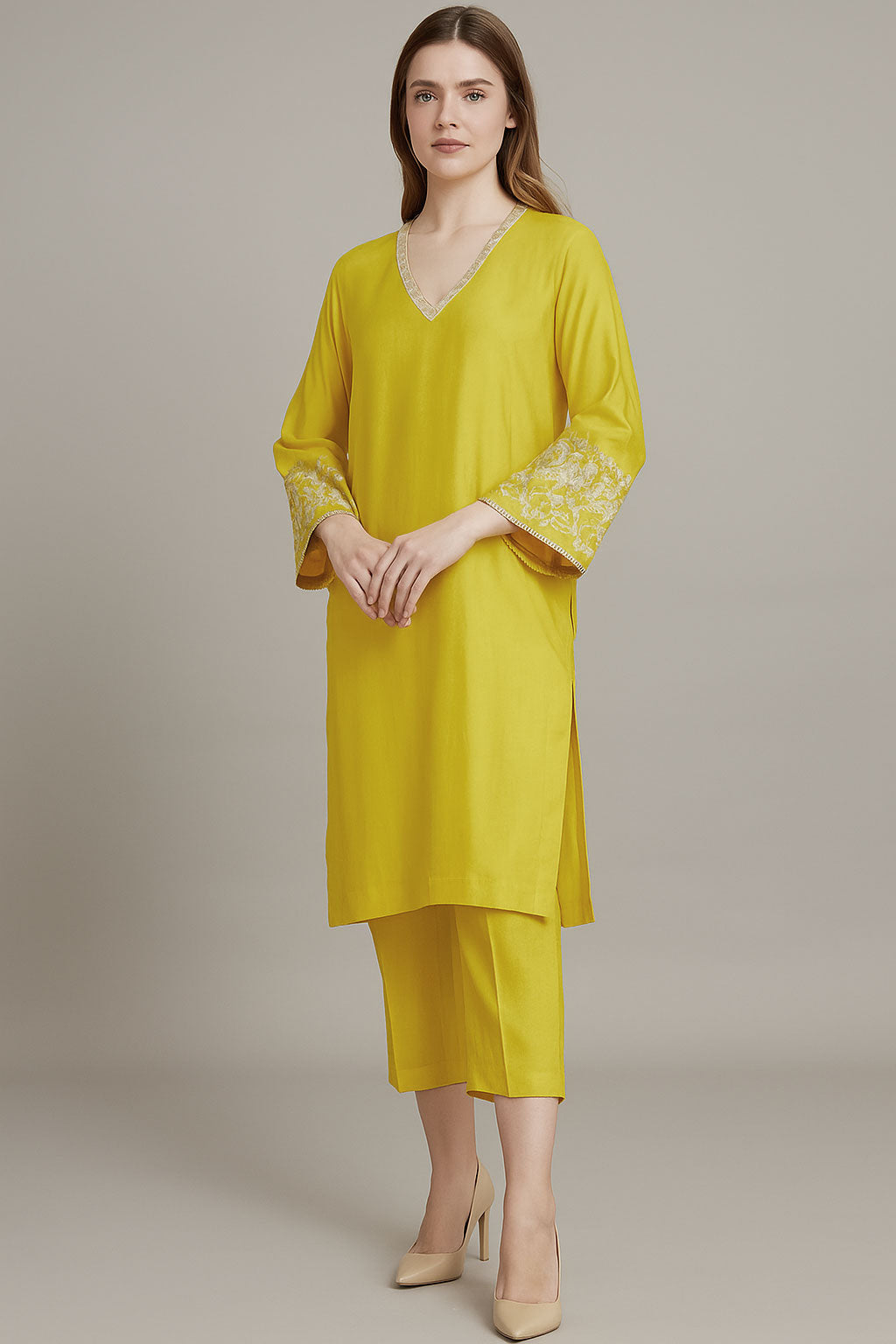 Brighten up your wardrobe with this radiant sunshine yellow kurta set. Crafted for both elegance and comfort, this ensemble features a straight-fit kurta with a flattering V-neckline and delicate silver embroidery on the neckline and sleeve hems. The 3/4th bell sleeves add a graceful touch, while the straight-fit pants offer effortless ease. Perfect for festive occasions, casual gatherings, or elegant daywear.
