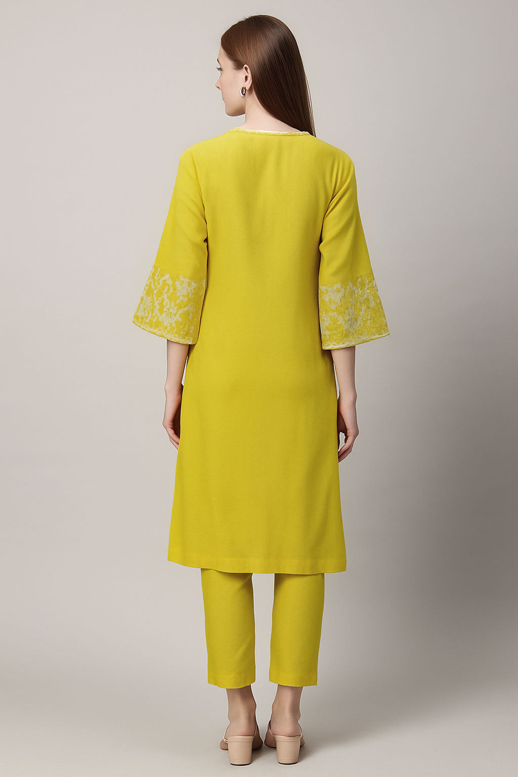 Barara Women’s Yellow Cotton Kurta Set with Pants | Embroidered Sleeve Straight Kurti, V-Neck Ethnic Wear for office & Festive