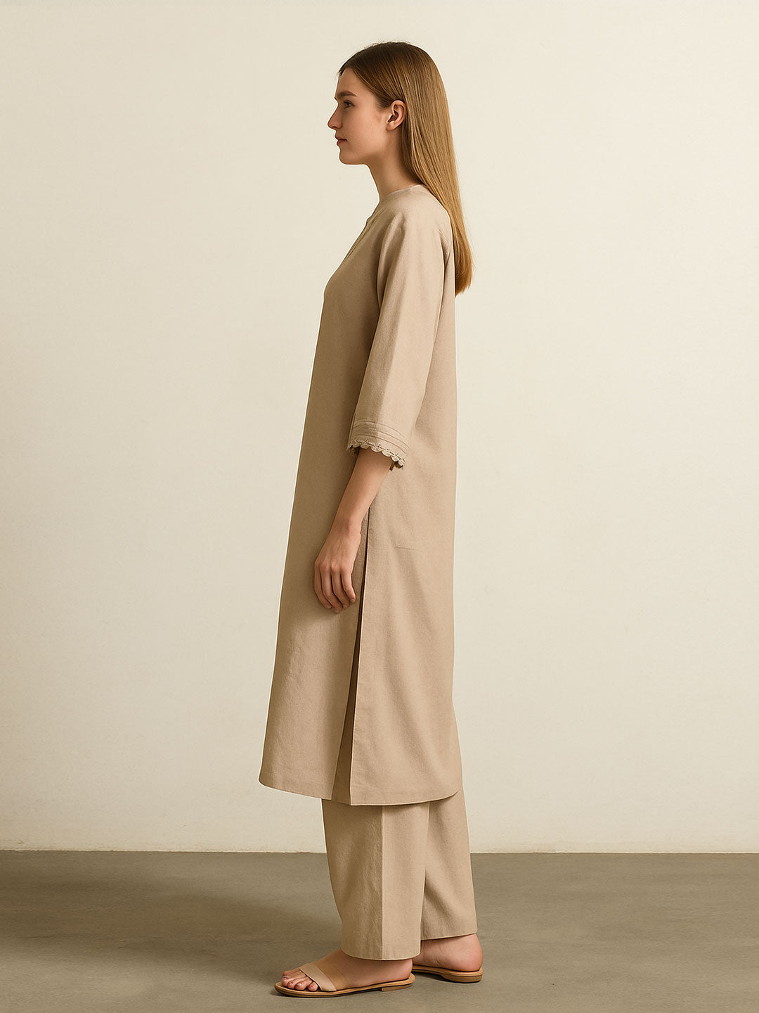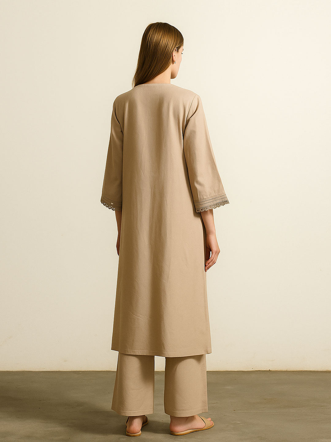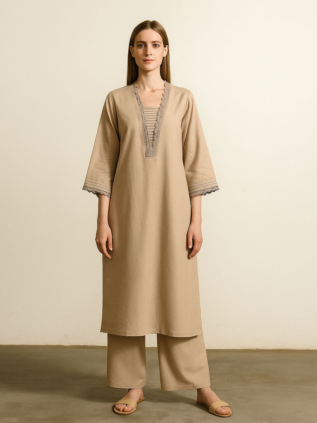 Minimal yet sophisticated, this earthy beige kurta set brings subtle charm to your ethnic wear collection. The straight kurta features intricate crochet lace detailing along the neckline and sleeve hems, adding an artisanal touch to the clean silhouette. Paired with matching wide-leg pants, it offers both comfort and understated elegance — perfect for work, small gatherings, or relaxed festive moments.