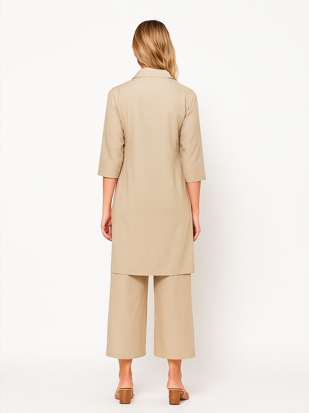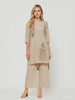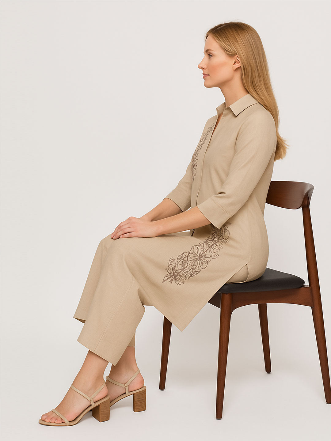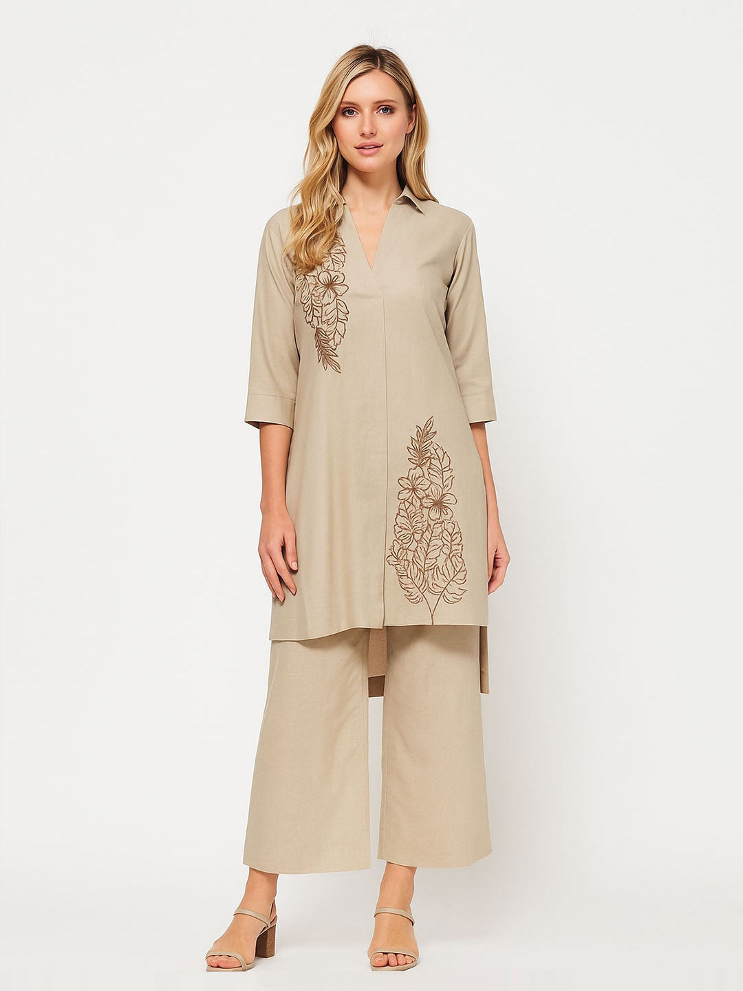 Graceful and minimal, this natural beige A-line kurta set features delicate floral embroidery in warm brown tones, placed artfully along the front. The collared neckline and structured silhouette give it a contemporary feel, while the soft cotton-blend fabric ensures breathable comfort. Paired with matching wide-leg pants, it’s a refined pick for brunches, casual Fridays, or festive simplicity.