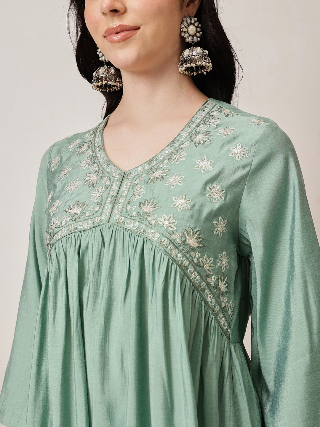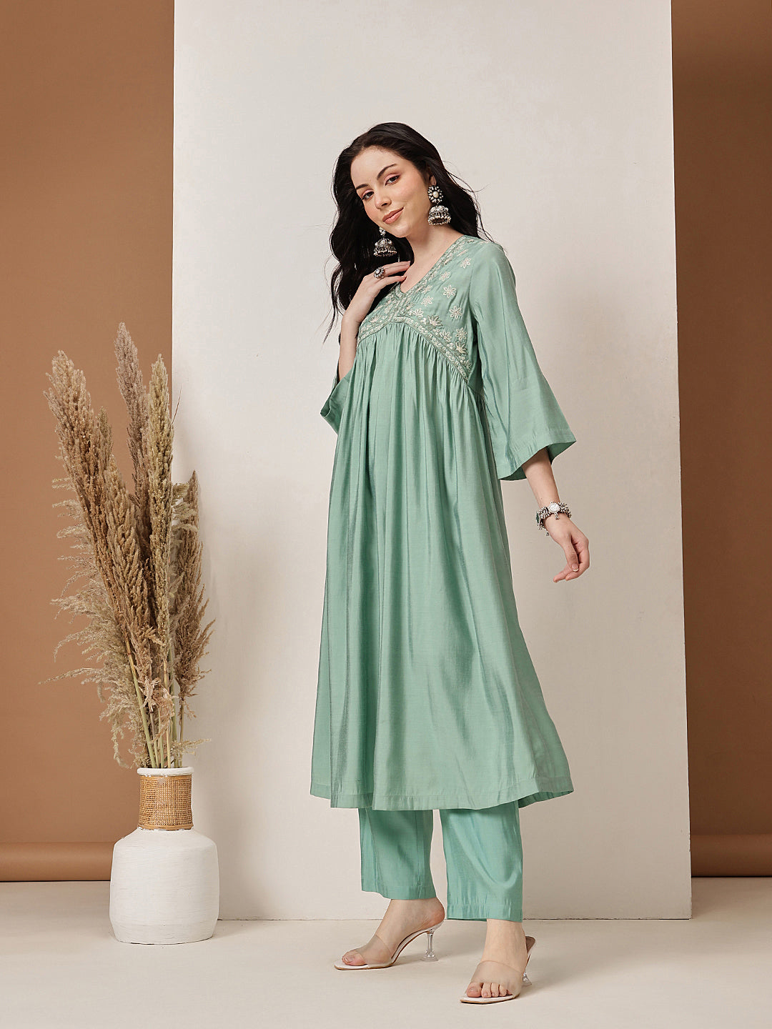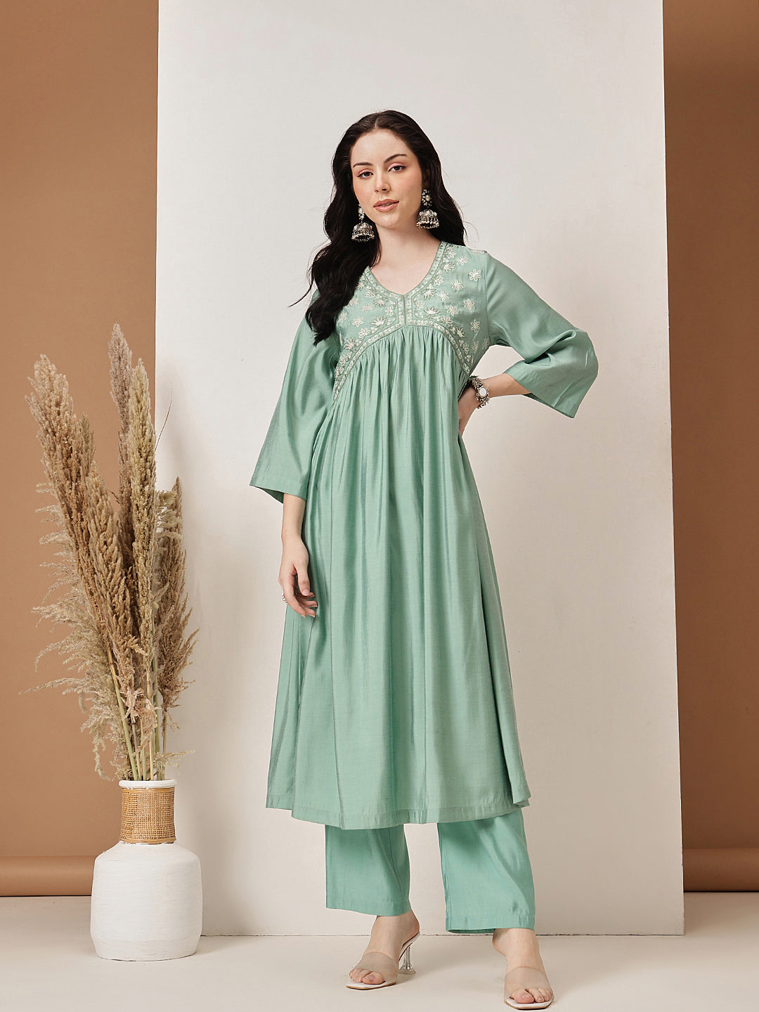 Exude grace and sophistication with the Sage Green Embroidered Kurta Set. This elegant ensemble is crafted from a soft, flowy fabric that ensures both comfort and style. The kurta features intricate floral embroidery on the yoke, enhancing its feminine appeal, while the gathered waistline adds a flattering silhouette. The three-quarter bell sleeves provide a touch of modernity, making it perfect for casual and festive occasions alike. Paired with matching straight-cut trousers, this set is an effortless blend of tradition and contemporary elegance.