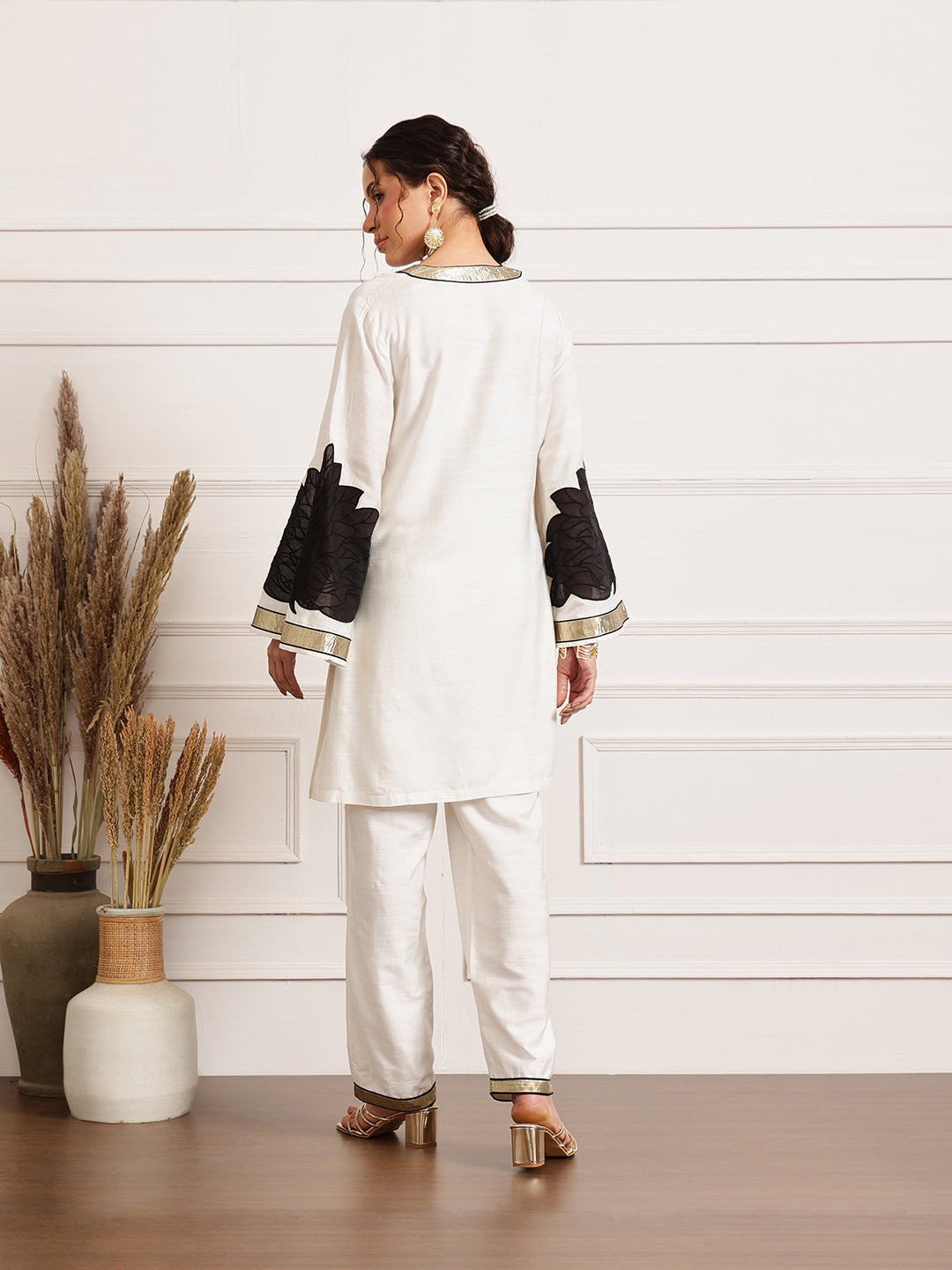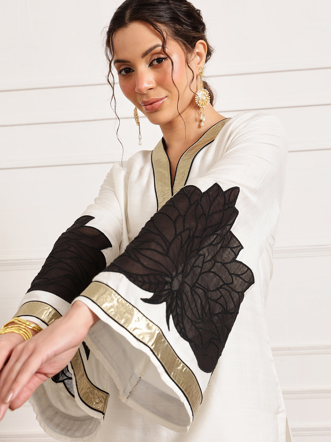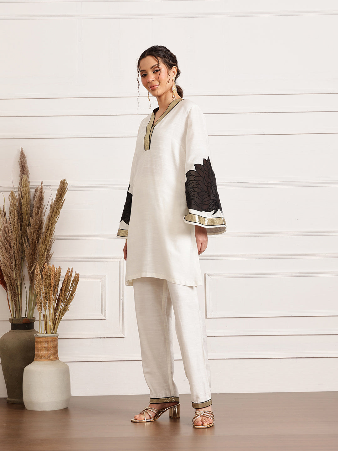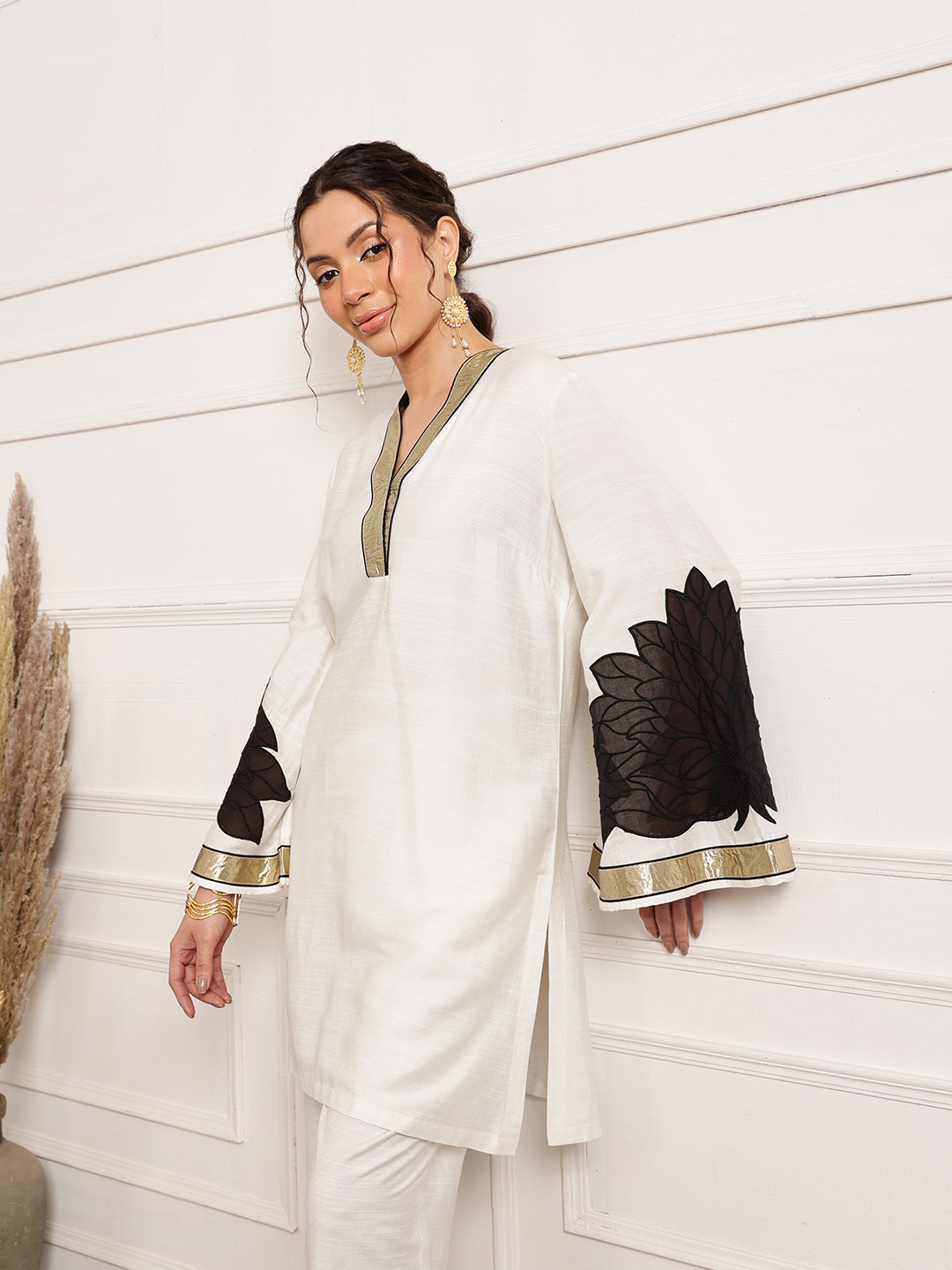 A statement in minimal sophistication, this ivory kurta set features dramatic lotus-inspired black embroidery on the flared sleeves, accentuated with shimmering gold edging. The V-neckline is framed with matching gold detailing, adding subtle festivity to the look. Paired with straight ivory pants with coordinating gold trim, this ensemble offers a perfect blend of elegance and contemporary style, ideal for festive luncheons or evening gatherings.