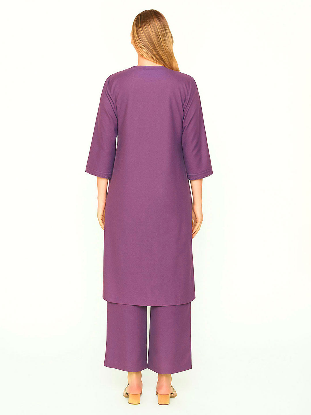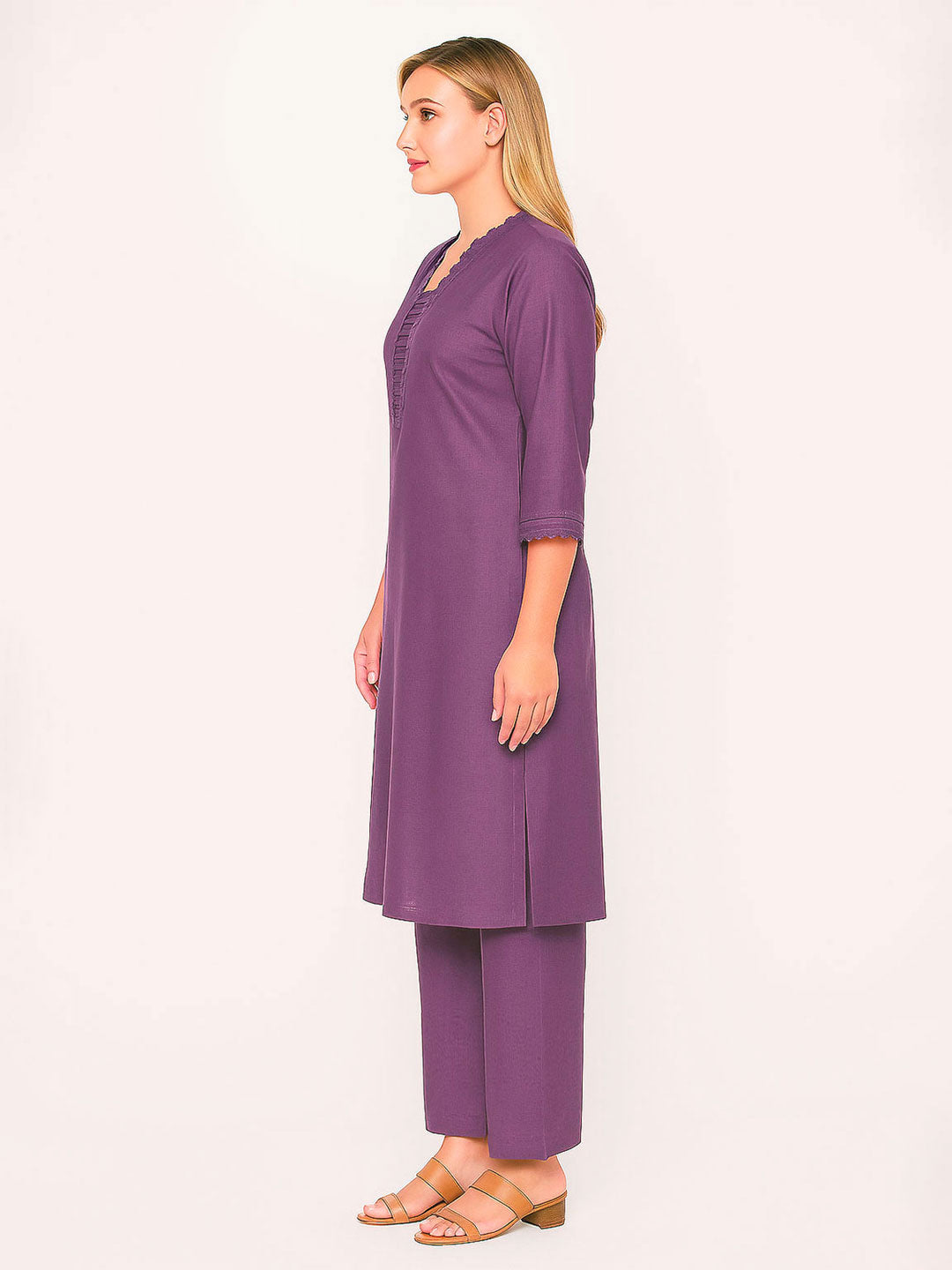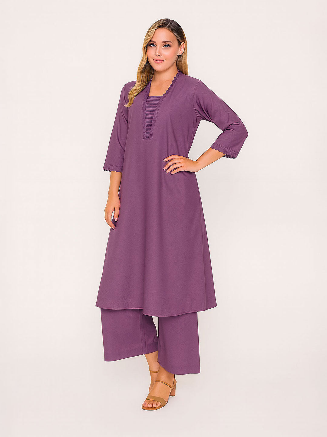 Striking in its simplicity, this deep plum purple kurta set combines traditional craftsmanship with modern structure. The straight kurta features a delicate crochet lace neckline and panel detailing, giving the silhouette a handcrafted charm. Paired with wide-leg matching pants, this set is ideal for elegant day dressing, casual festive wear, or refined office looks.