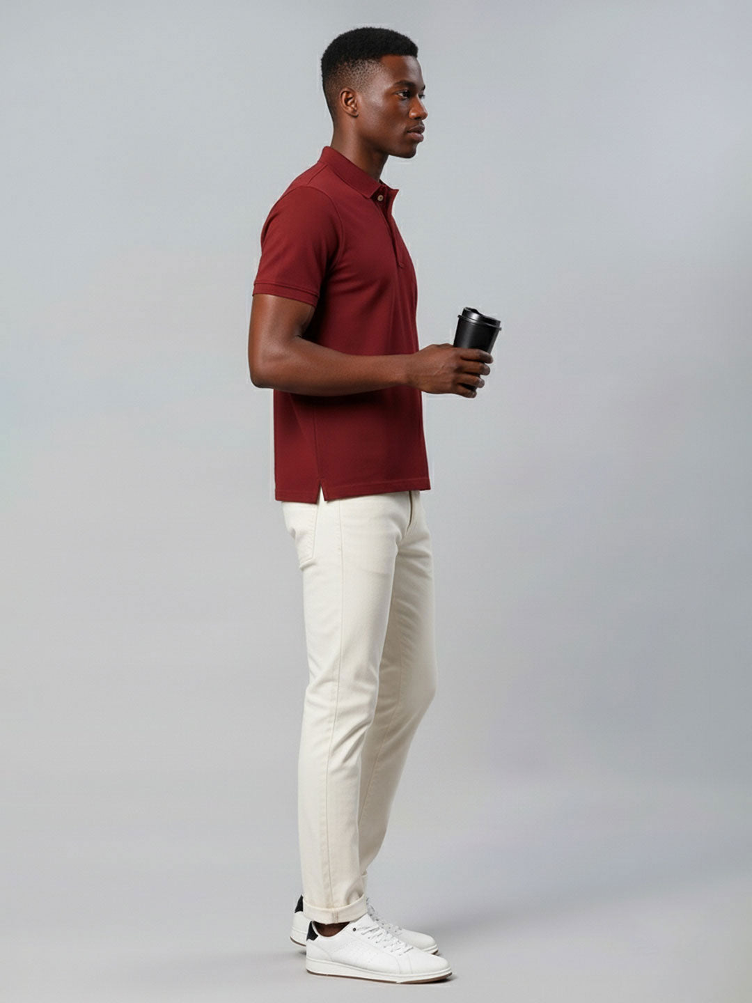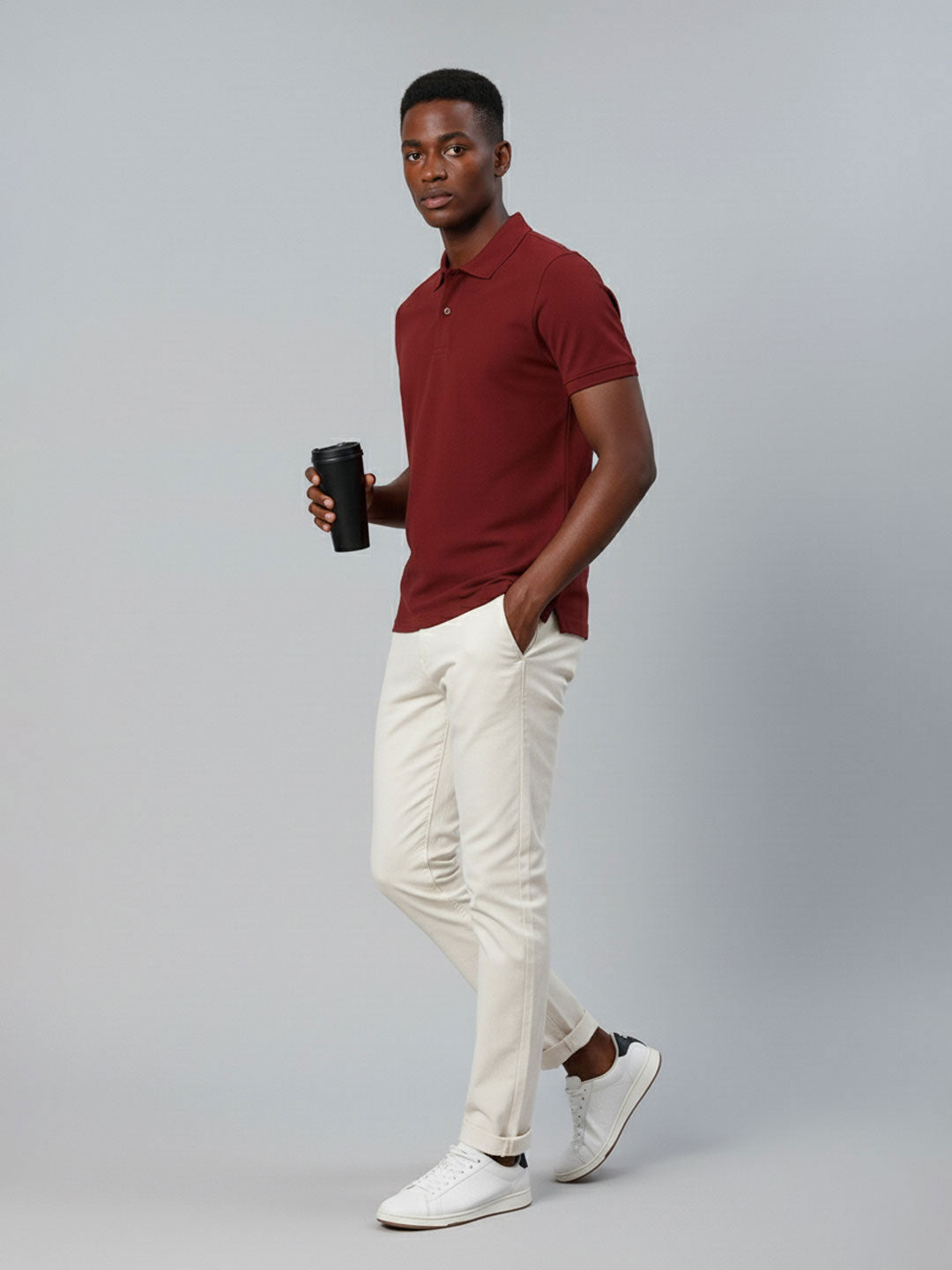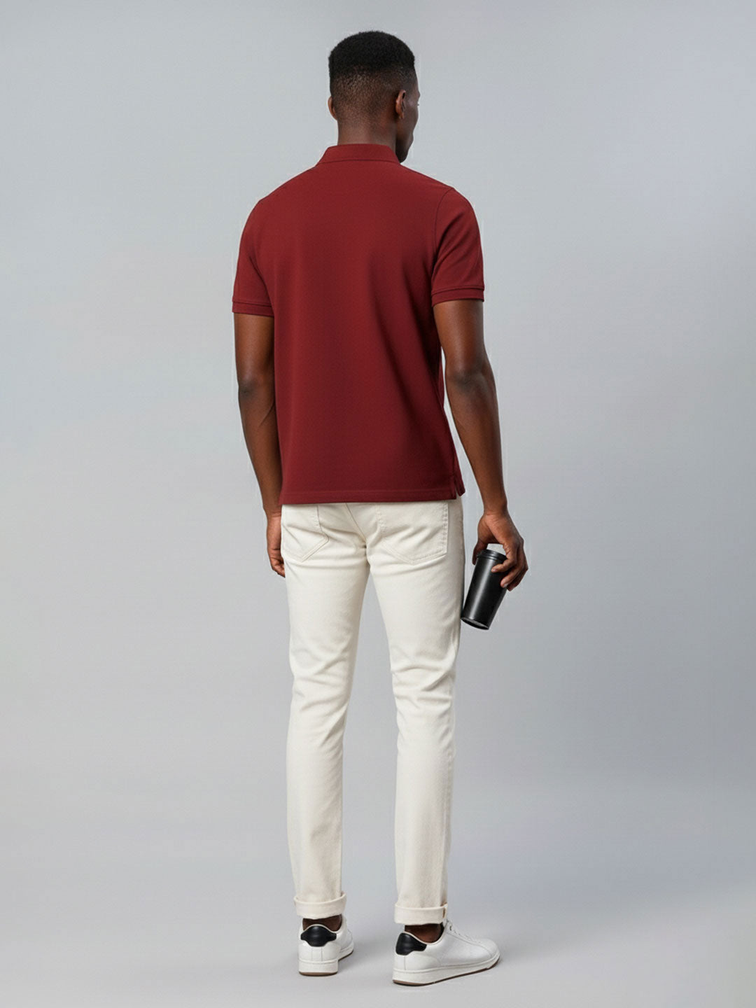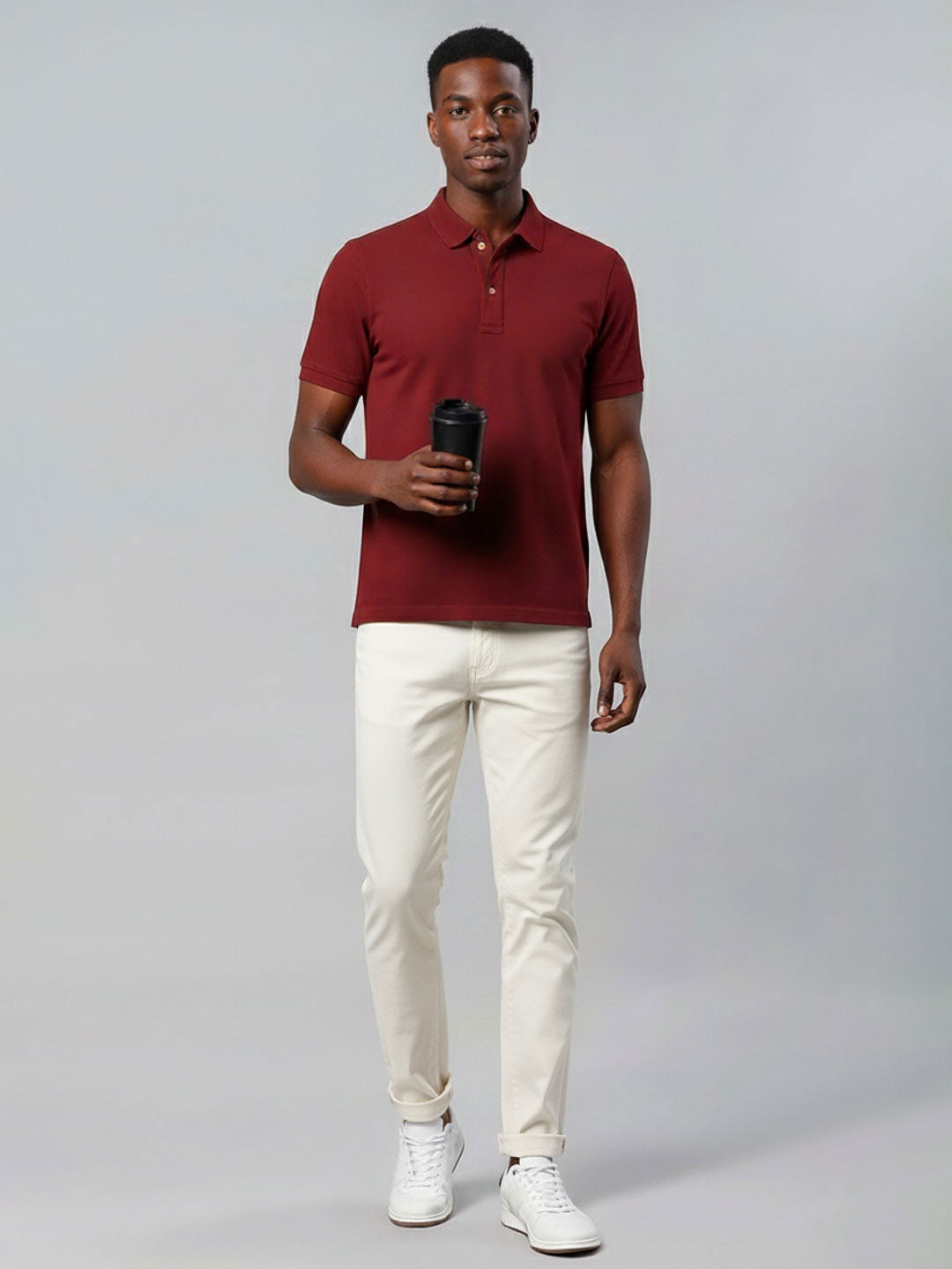 Maroon solid slim fit polo collar t-shirt has a half placket with coconut button detailing to give it a casual glance. Half sleeves and subtle fabric make it easier for you to wear them all day long.