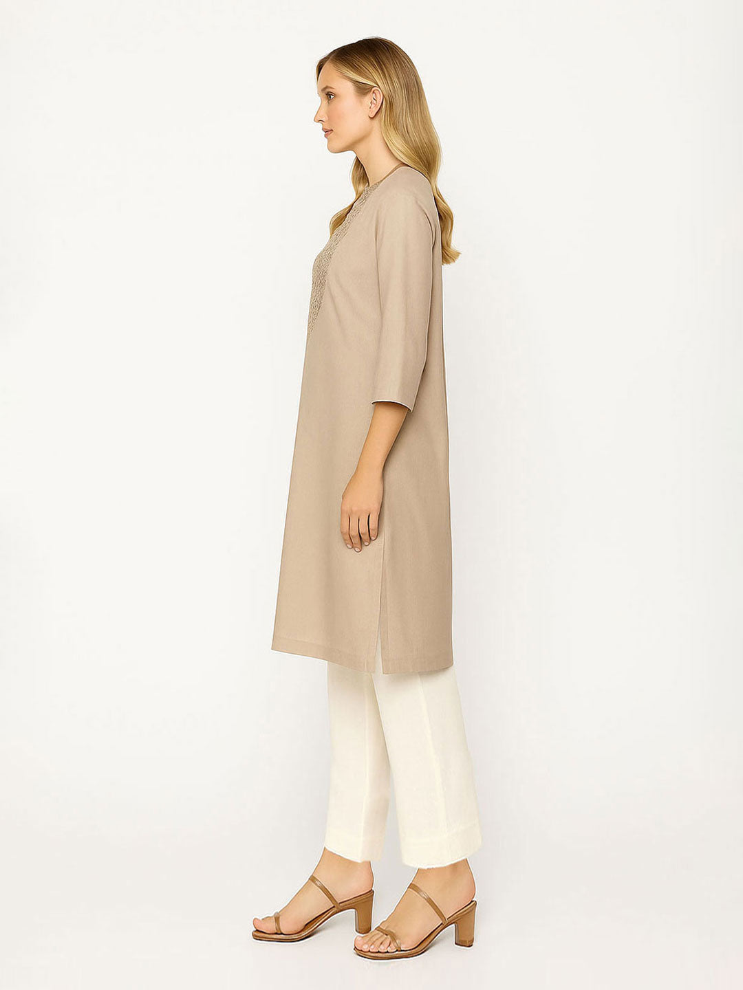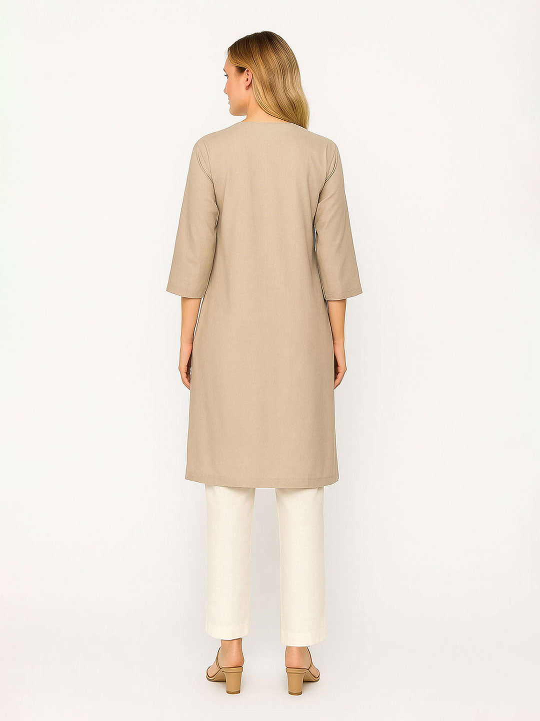 Pair this elegant beige kurta with matching straight pants for a minimalist, refined look. Add simple gold hoop earrings and nude sandals to keep the ensemble graceful. Finish with a sleek low bun and soft nude makeup for effortless sophistication.