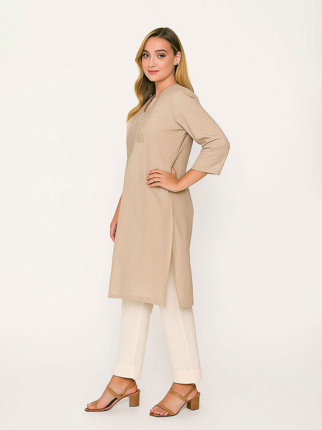 Minimal and elegant, this Natural Beige Straight Kurta is crafted from breathable cotton-blend fabric. Featuring delicate tonal thread embroidery along the neckline, a split round collar, and a straight-cut silhouette, it blends understated charm with everyday comfort. Designed with side slits and 3/4th sleeves, the set is ideal for workwear, festive gatherings, or casual outings.