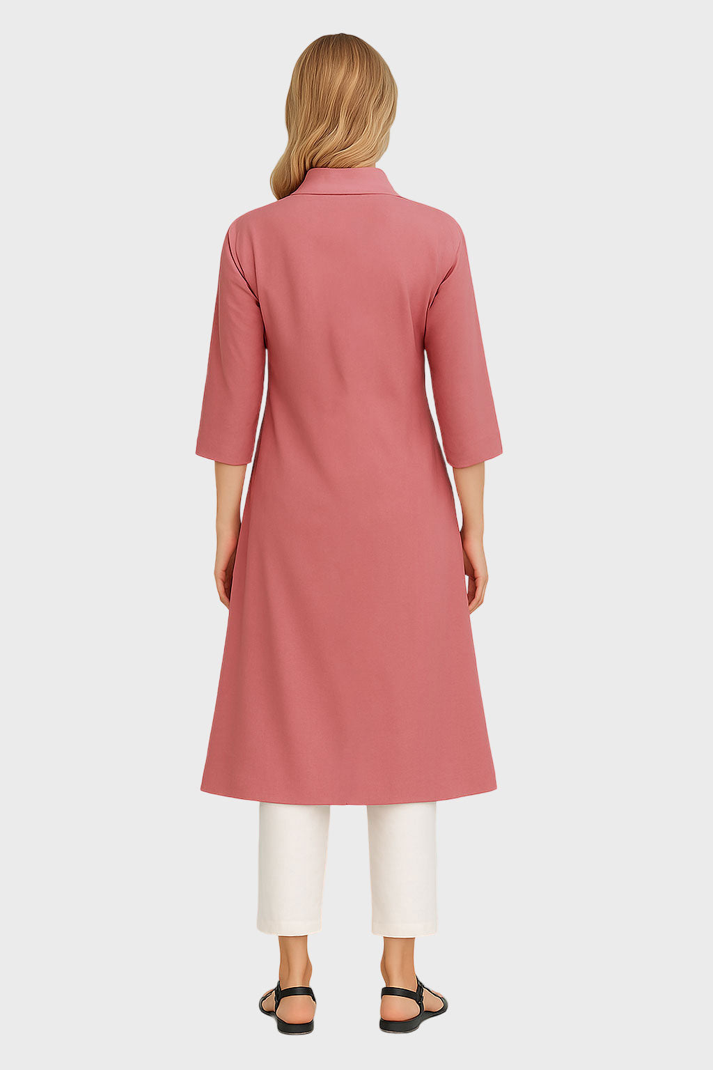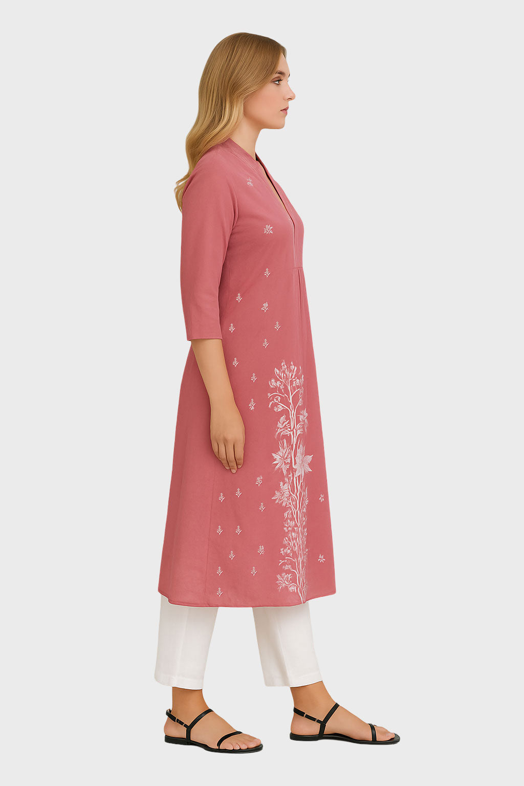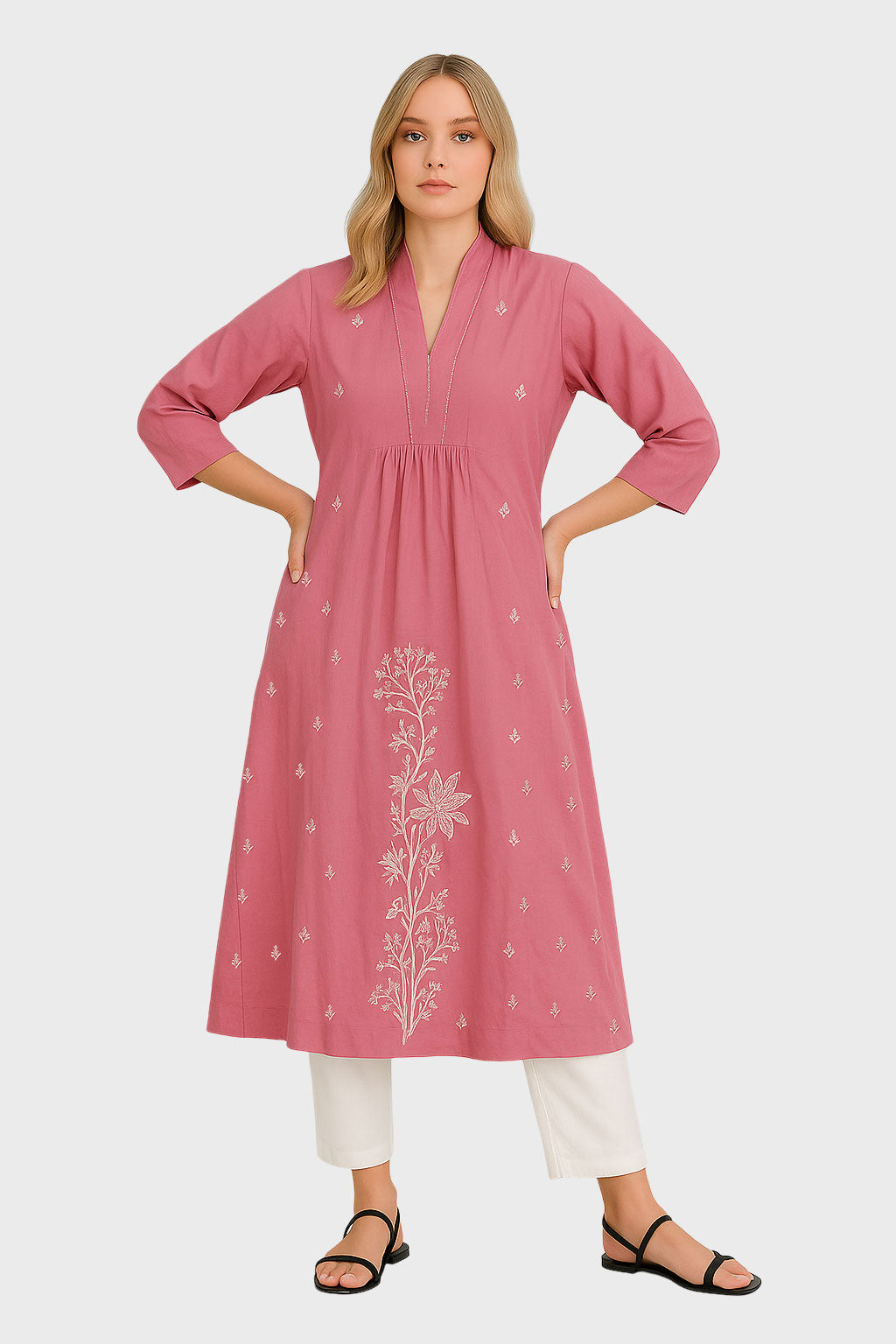Elegant and graceful—the Rose Pink Embroidered Kurta Dress is crafted from soft breathable fabric, detailed with delicate thread embroidery. Featuring a flattering V-neckline with a structured collar, 3/4th sleeves, and front pleats for ease and flow, this A-line silhouette balances comfort with sophistication. The floral embroidery cascading along the front adds artisanal charm, making it perfect for festive wear, workdays, or casual gatheringss.