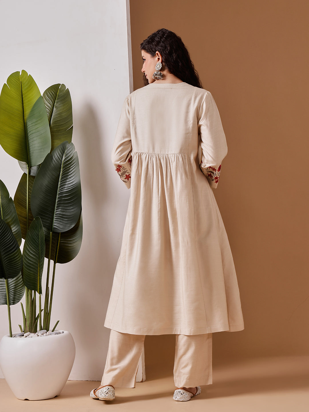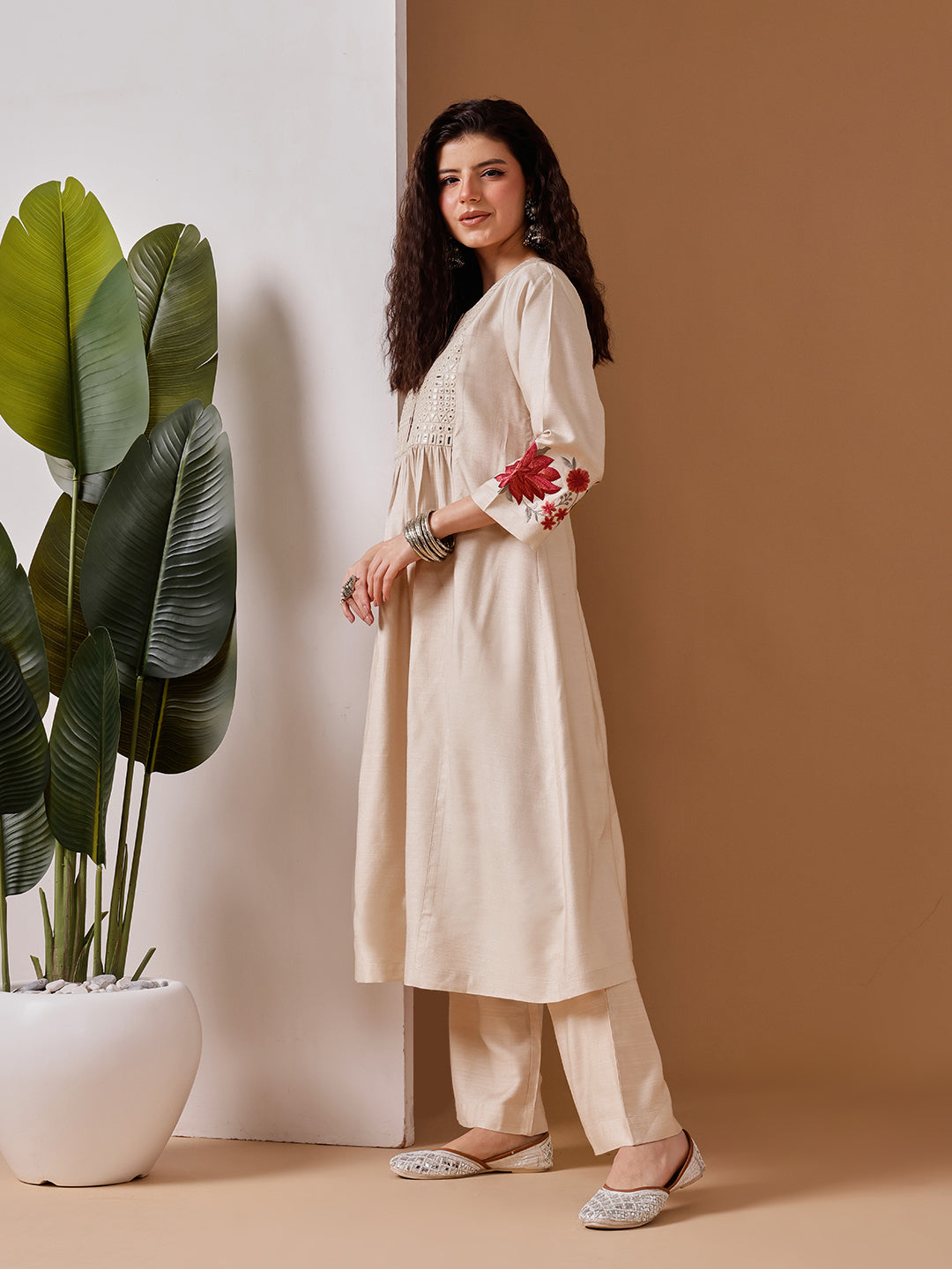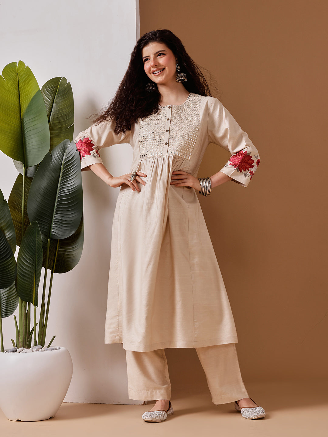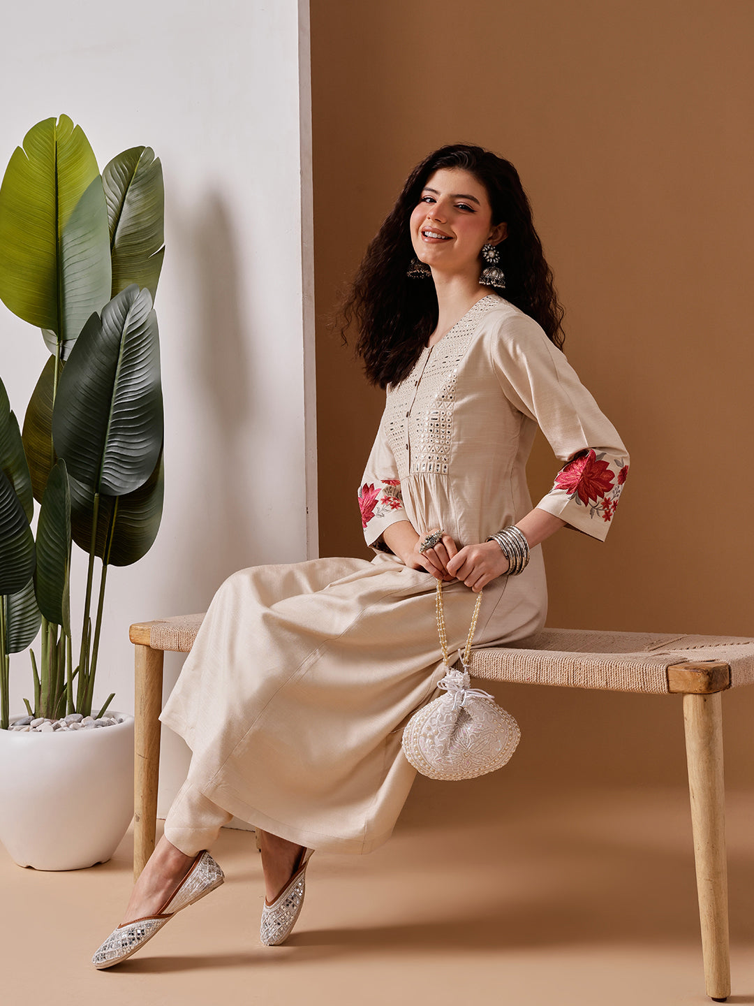Bring a burst of sunshine to your ethnic wardrobe with this bright Beige kurta. Crafted in a breezy A-line silhouette, it features intricate mirror-thread embroidery on the yoke and vibrant floral embroidery on the 3/4th sleeves. Gentle gathers under the yoke add graceful volume and movement, making it a stylish yet comfortable choice for all-day wear.