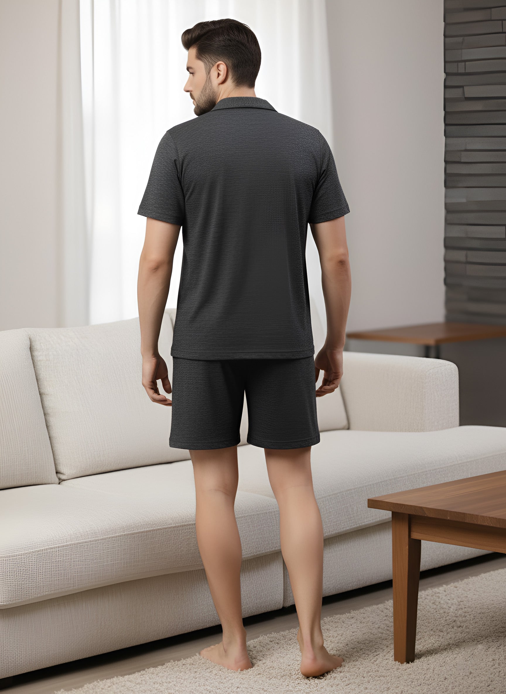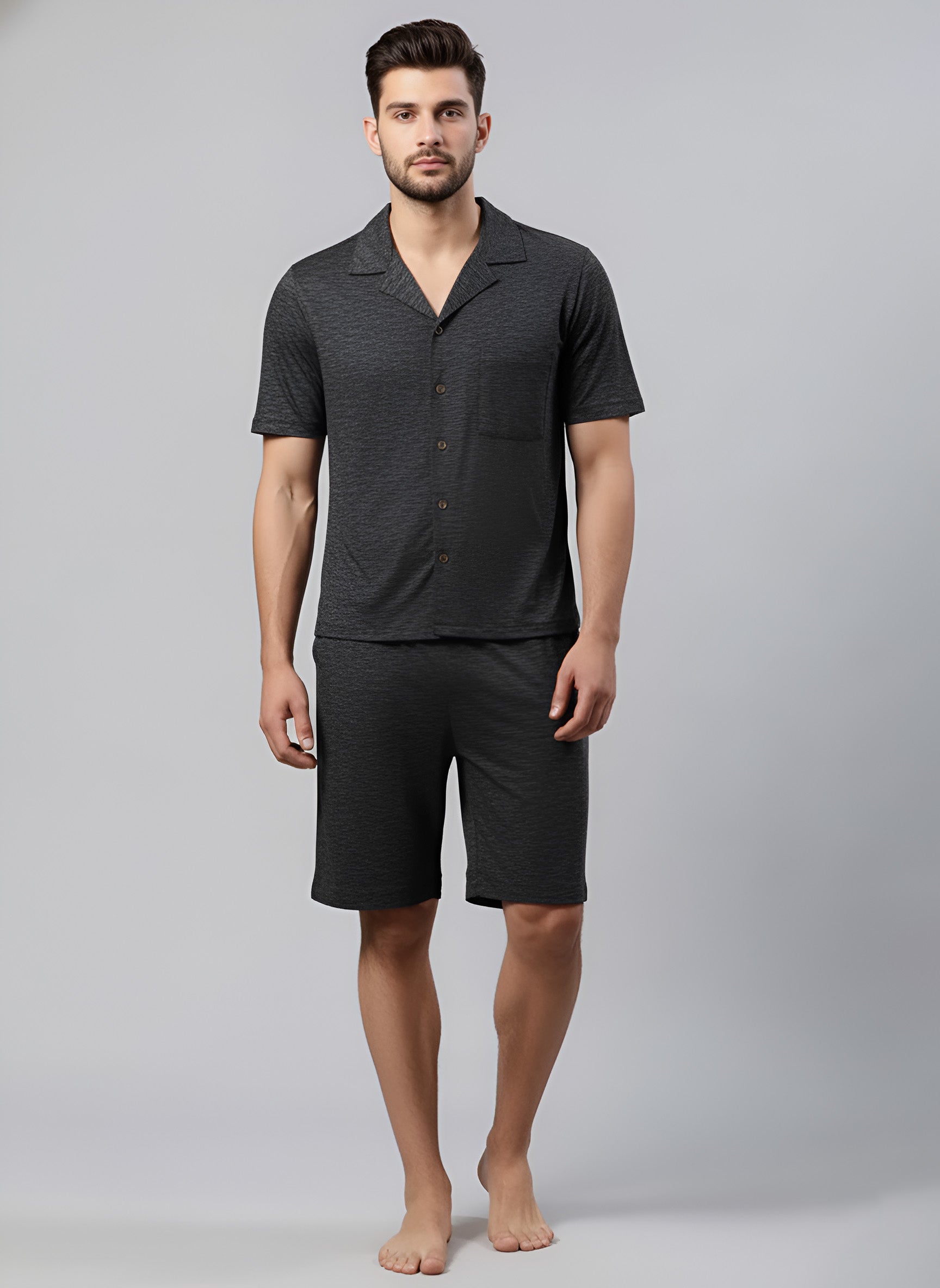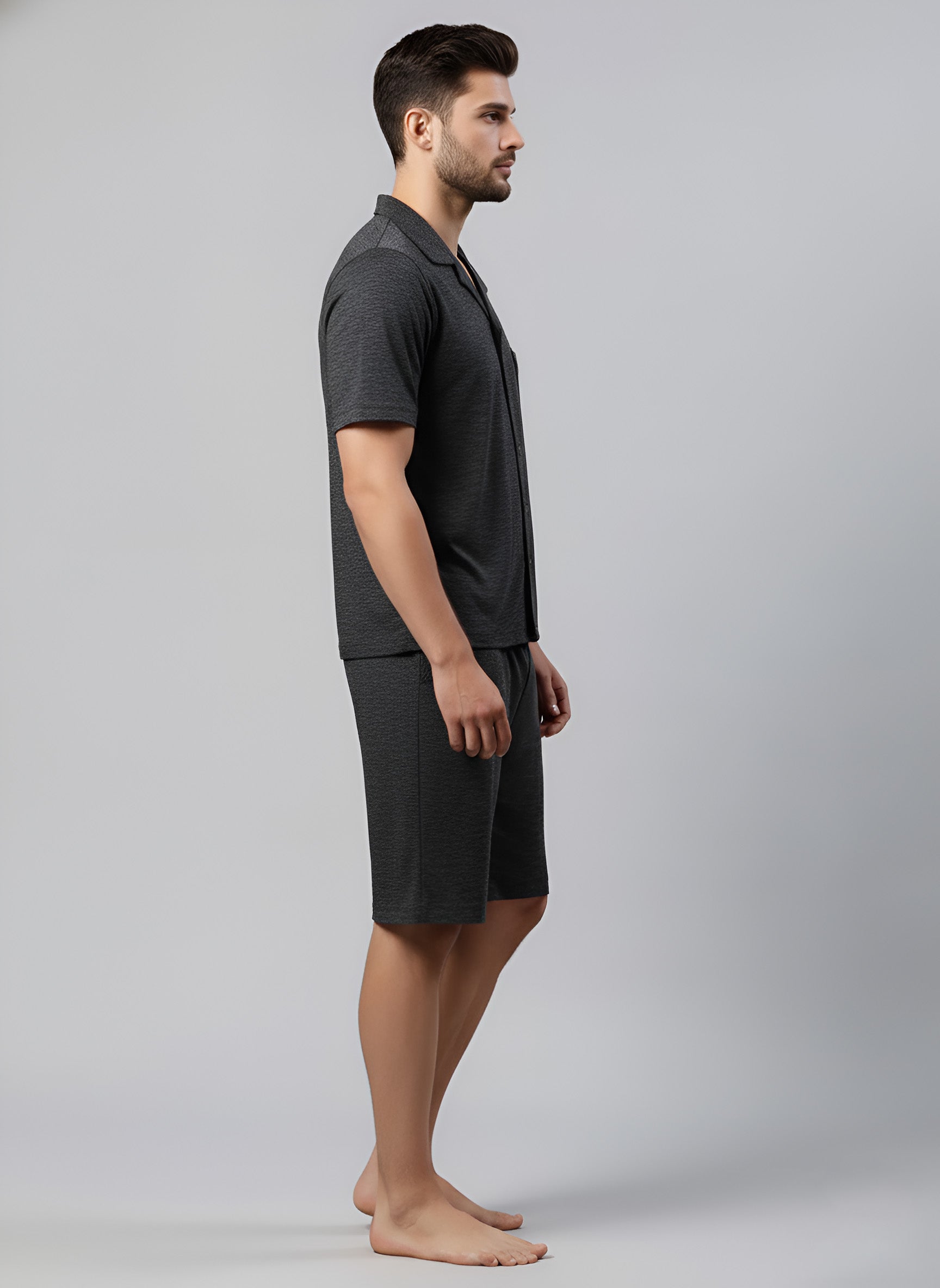 This trendy and simple dark grey solid matching loungewear set has a Cuban collar with a front placket, coconut buttons, and half sleeves. Paired up with shorts that have an elasticated waistband and side pockets.