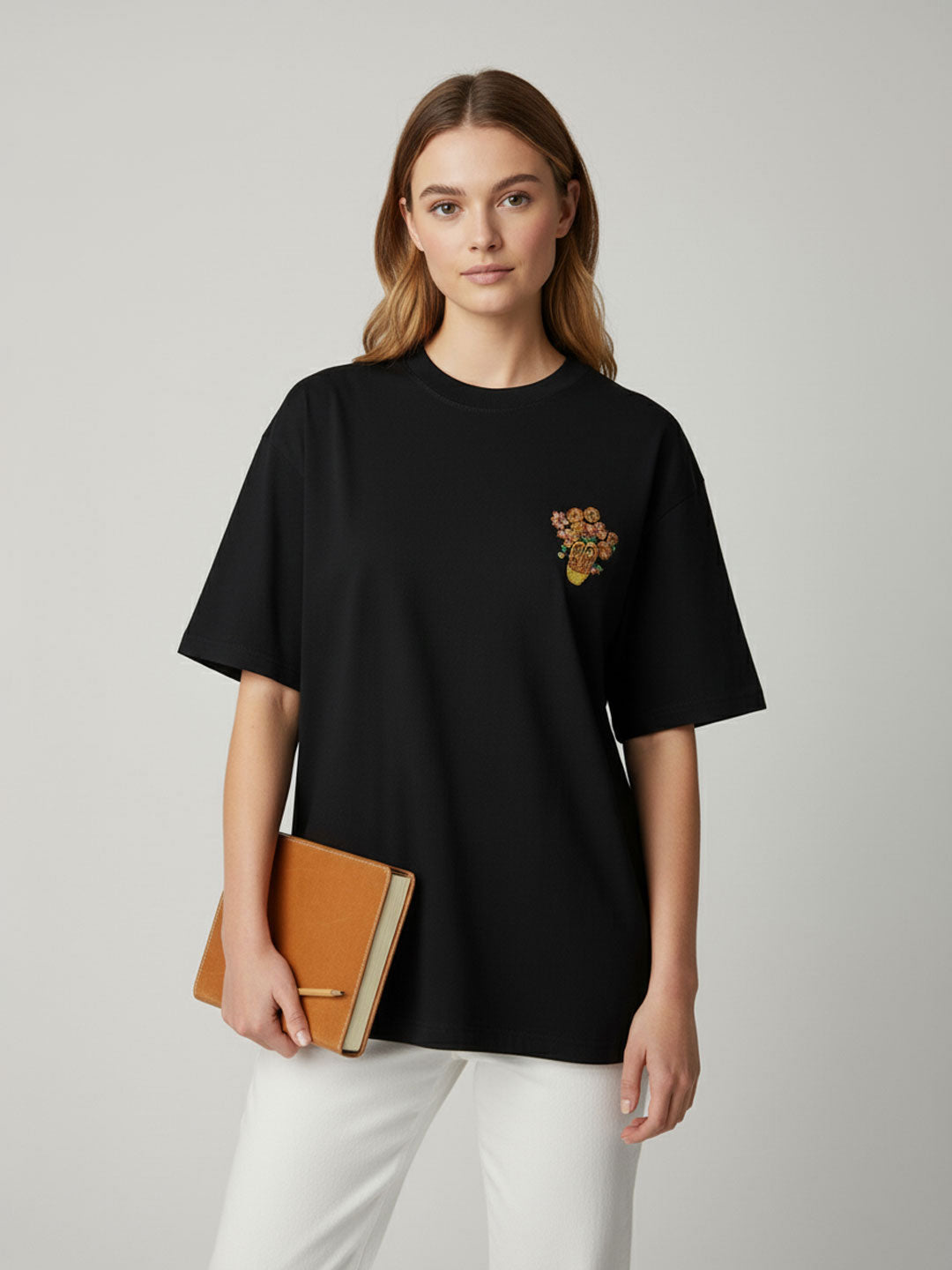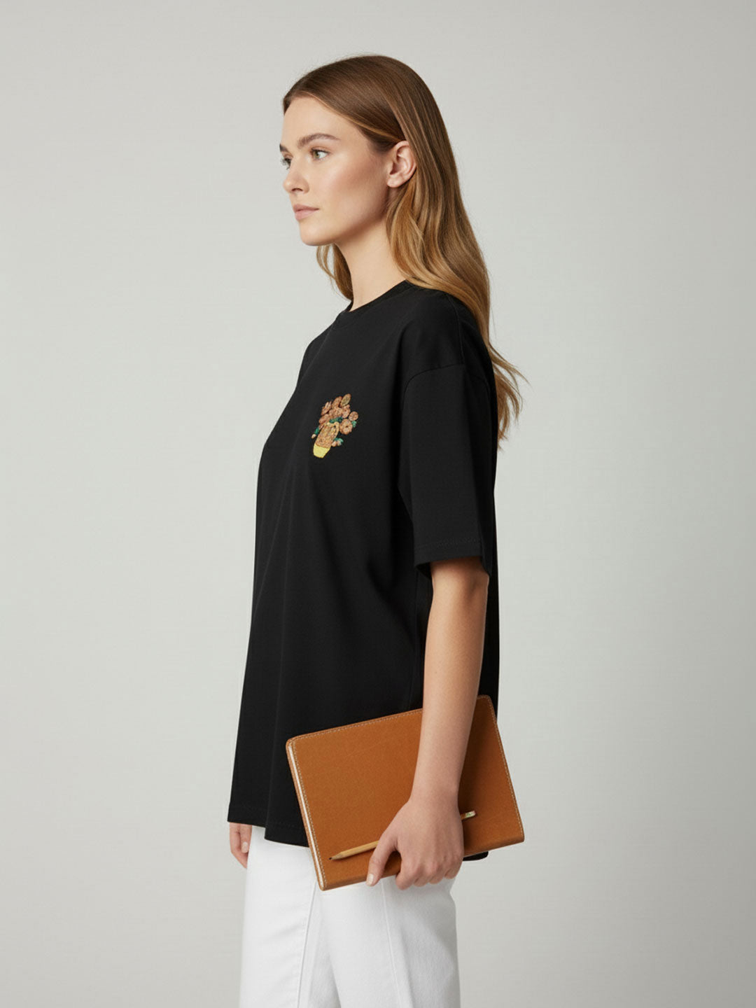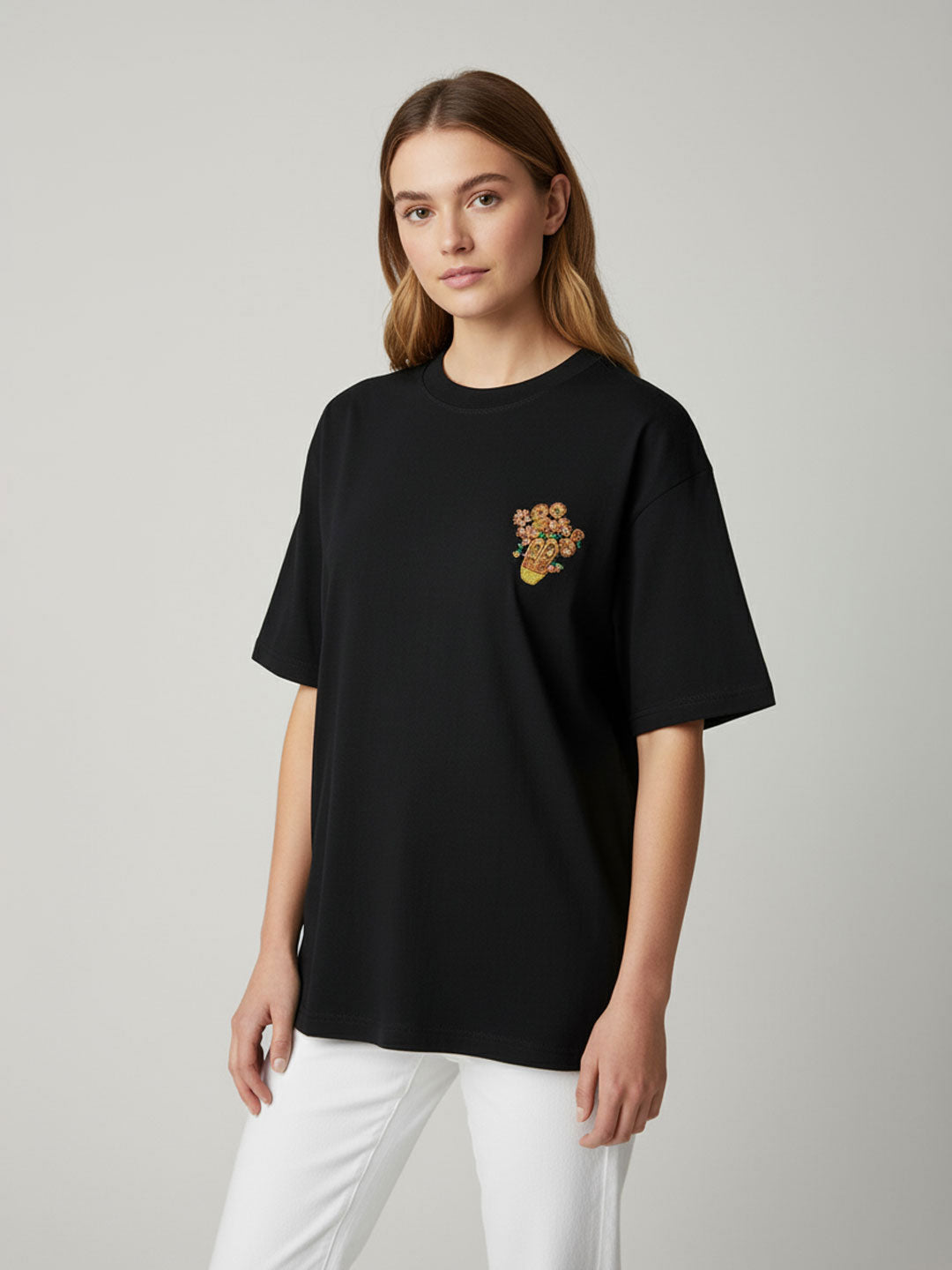 Effortless cool meets playful detailing in this black oversized t-shirt. Featuring a minimal silhouette with a standout abstract patch graphic at the chest, this tee adds a touch of artistic attitude to your everyday look. Made in soft, breathable cotton for all-day comfort, it's your go-to for relaxed styling with a creative edge.