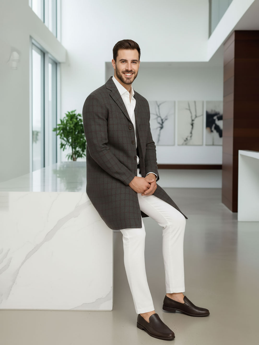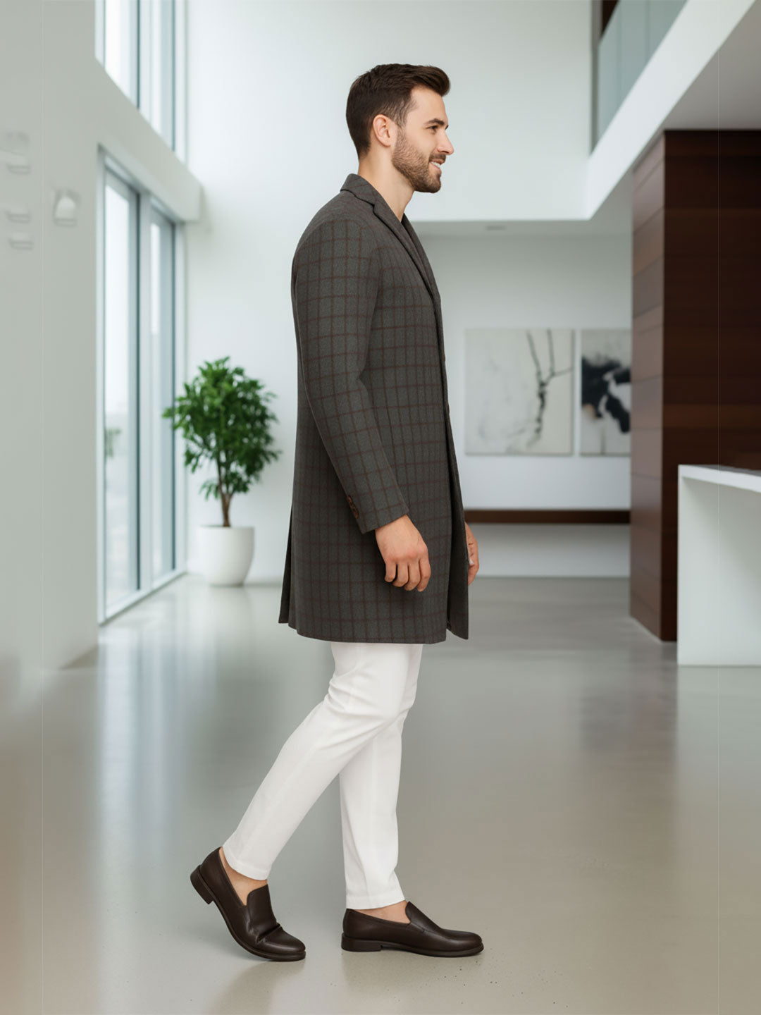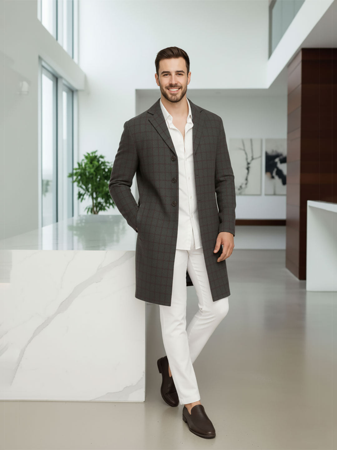 Elevate your cold-weather wardrobe with the Ridge Blazer, a refined take on classic menswear. Featuring vertical chestnut stripes against a textured charcoal base, this blazer blends structure with softness. Crafted in a wool-blend fabric for warmth, it’s designed with a relaxed yet tailored silhouette perfect for smart-casual styling.