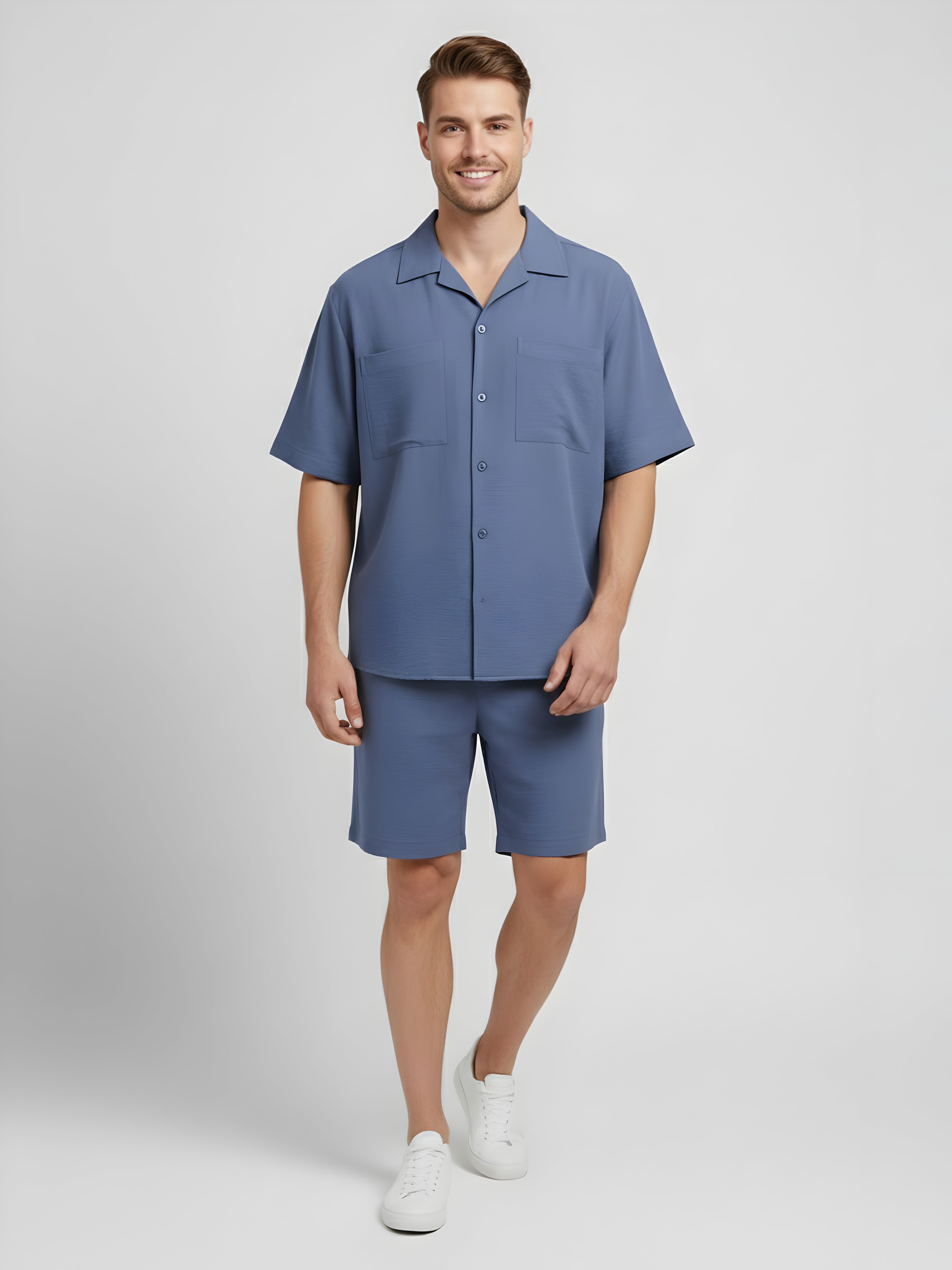 Laid-back days meet smart-casual style in the Co-Ord, crafted from a lightweight and breathable textured cotton blend. This two-piece features a short-sleeve Cuban-collar shirt with dual patch pockets and relaxed-fit shorts. Whether you're headed for a brunch or a bearded stroll, this co-Ord delivers effortless summer polish.