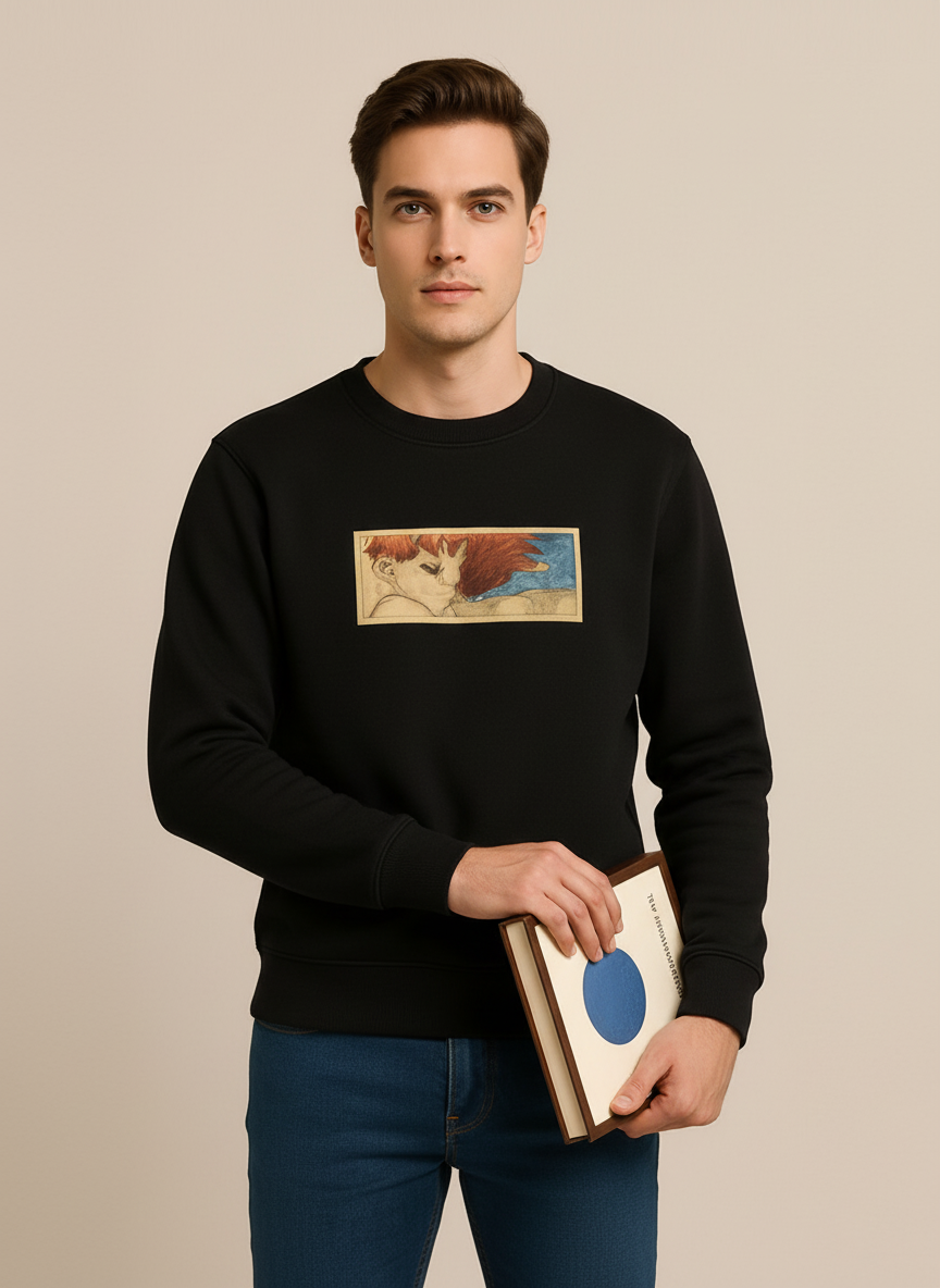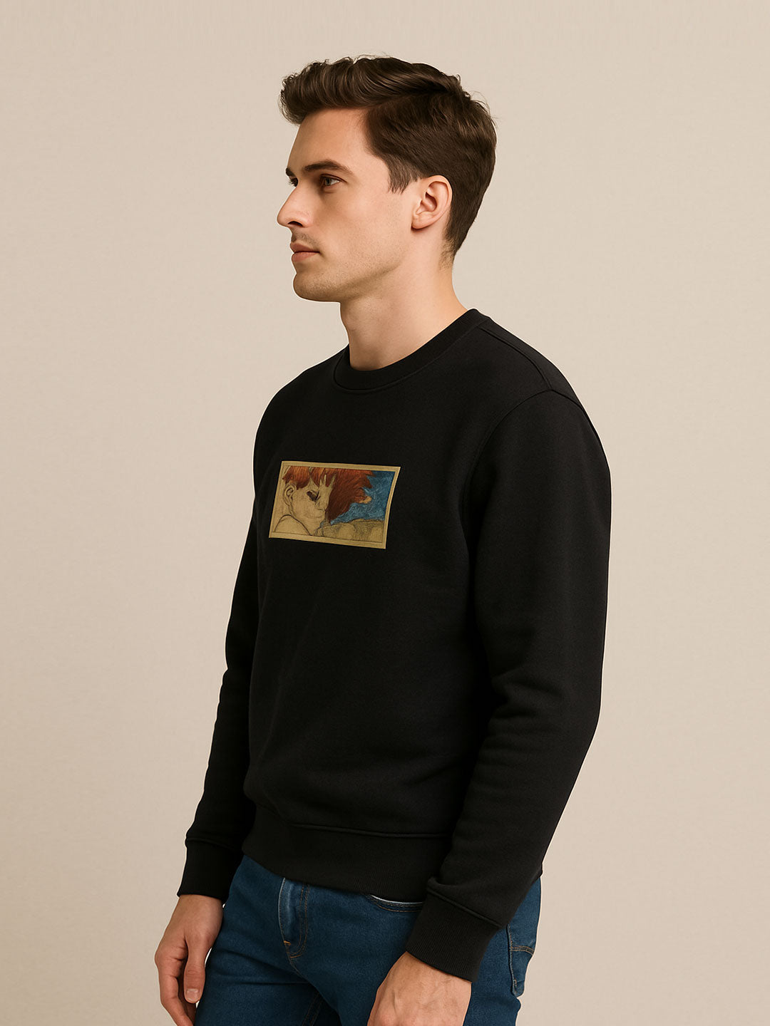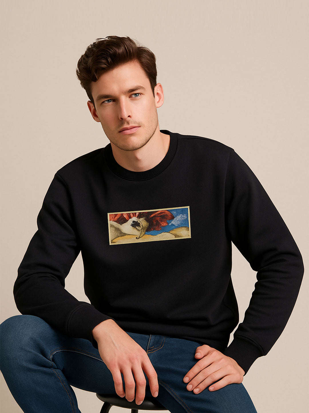 Art meets attitude in this jet black sweatshirt featuring a painterly Renaissance-style graphic on the chest. The design captures a dramatic close-up scene in rich, moody tones perfect for expressing individuality with a cultured edge. Crafted from a soft cotton-blend fleece, the sweatshirt is finished with a classic crew neck and ribbed trims for everyday comfort with a bold artistic twist.