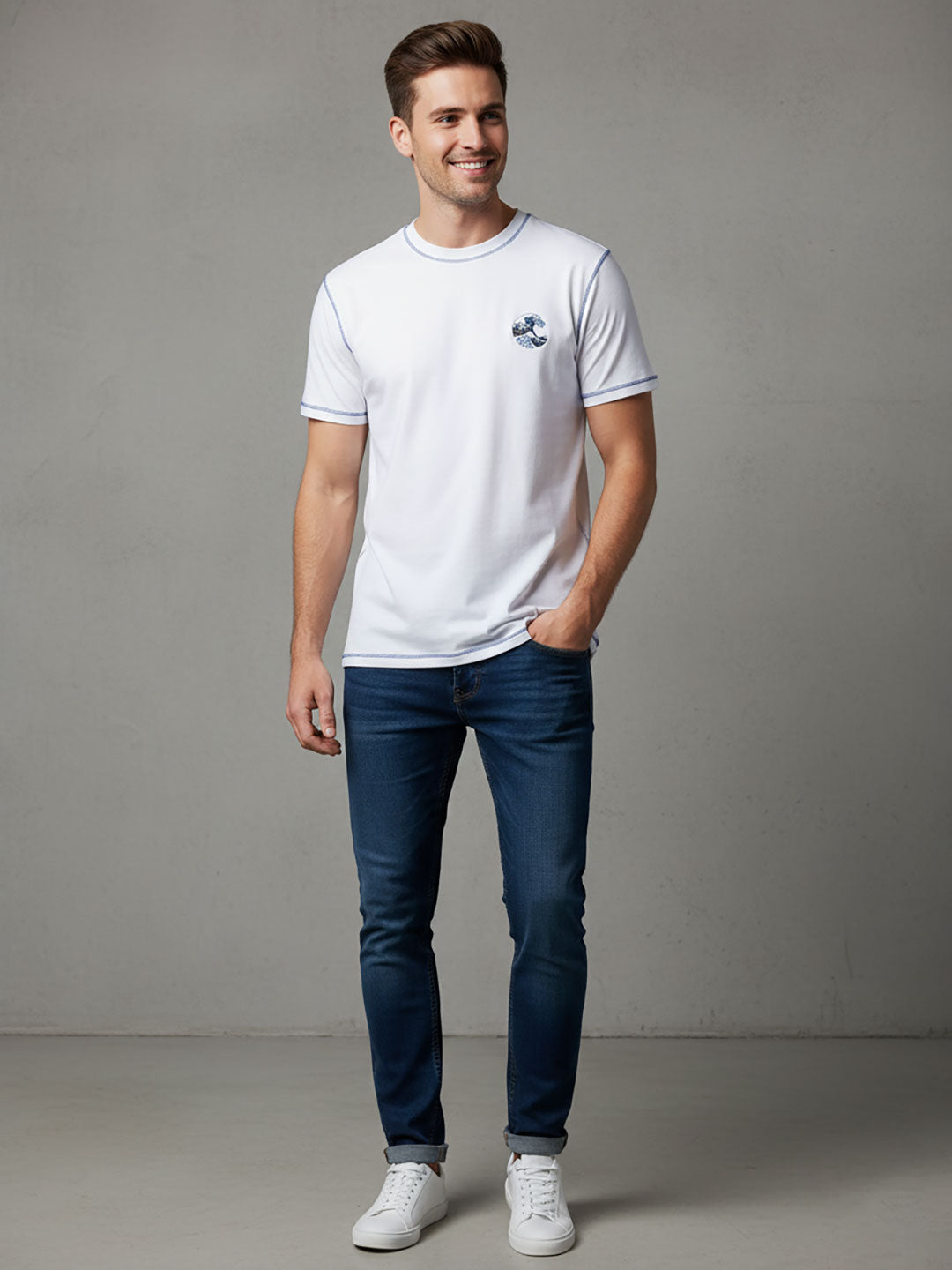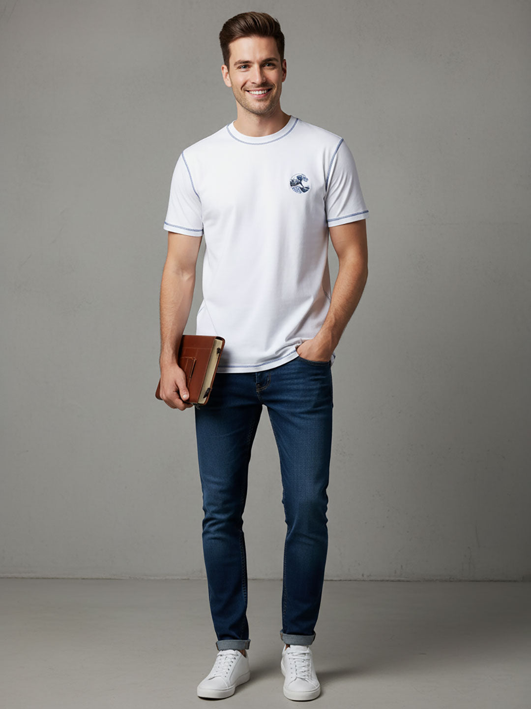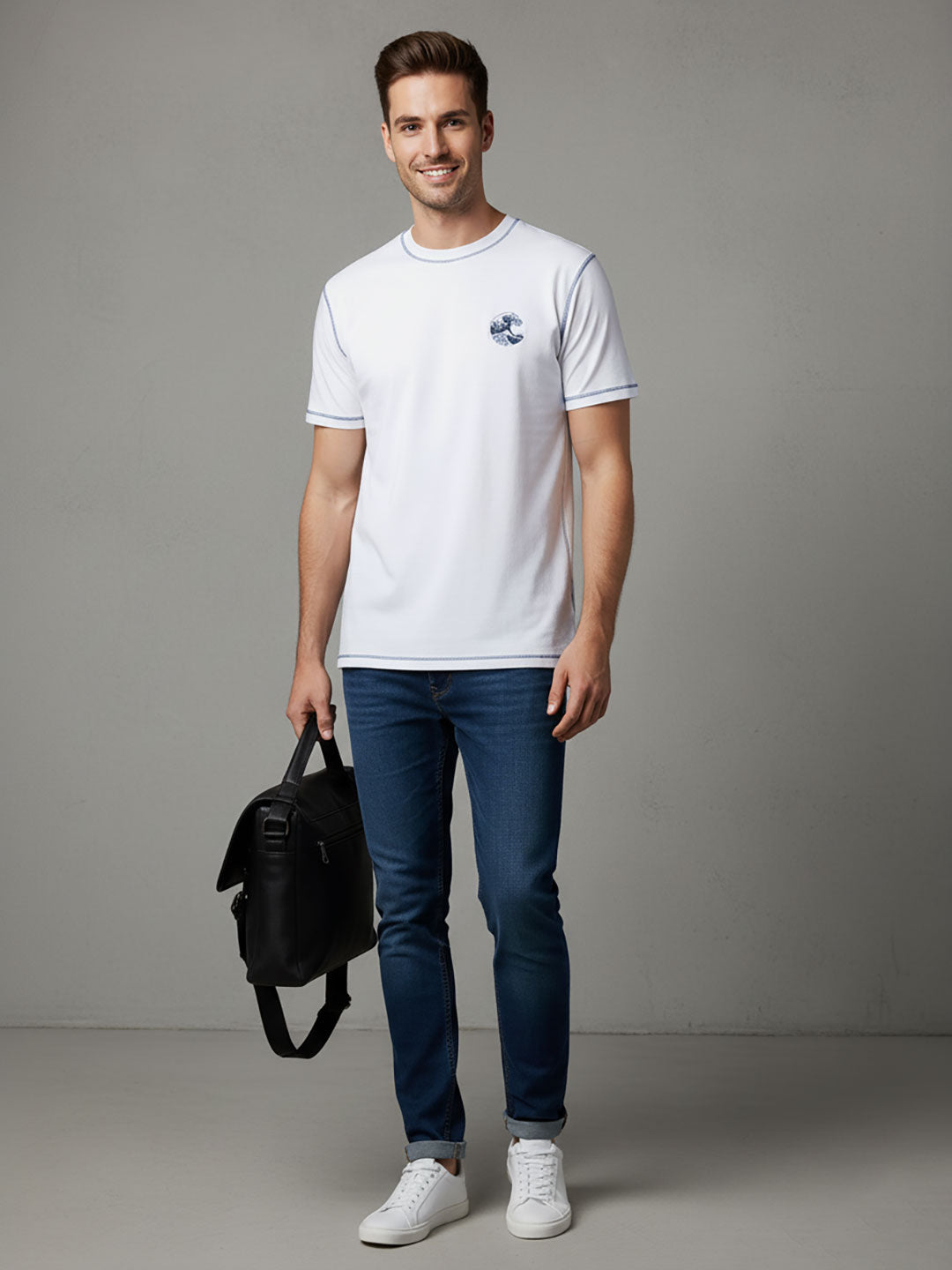 Effortlessly cool with a retro-modern twist, the Global Emblem Tipped Tee features contrast tipping on the collar, sleeves, and hem, adding a refined edge to a casual staple. Made from mid weight cotton knit, this tee is breathable and structured. The subtle globe insignia printed on the left chest brings a minimal yet distinctive detail perfect for everyday wear with a touch of personality.
