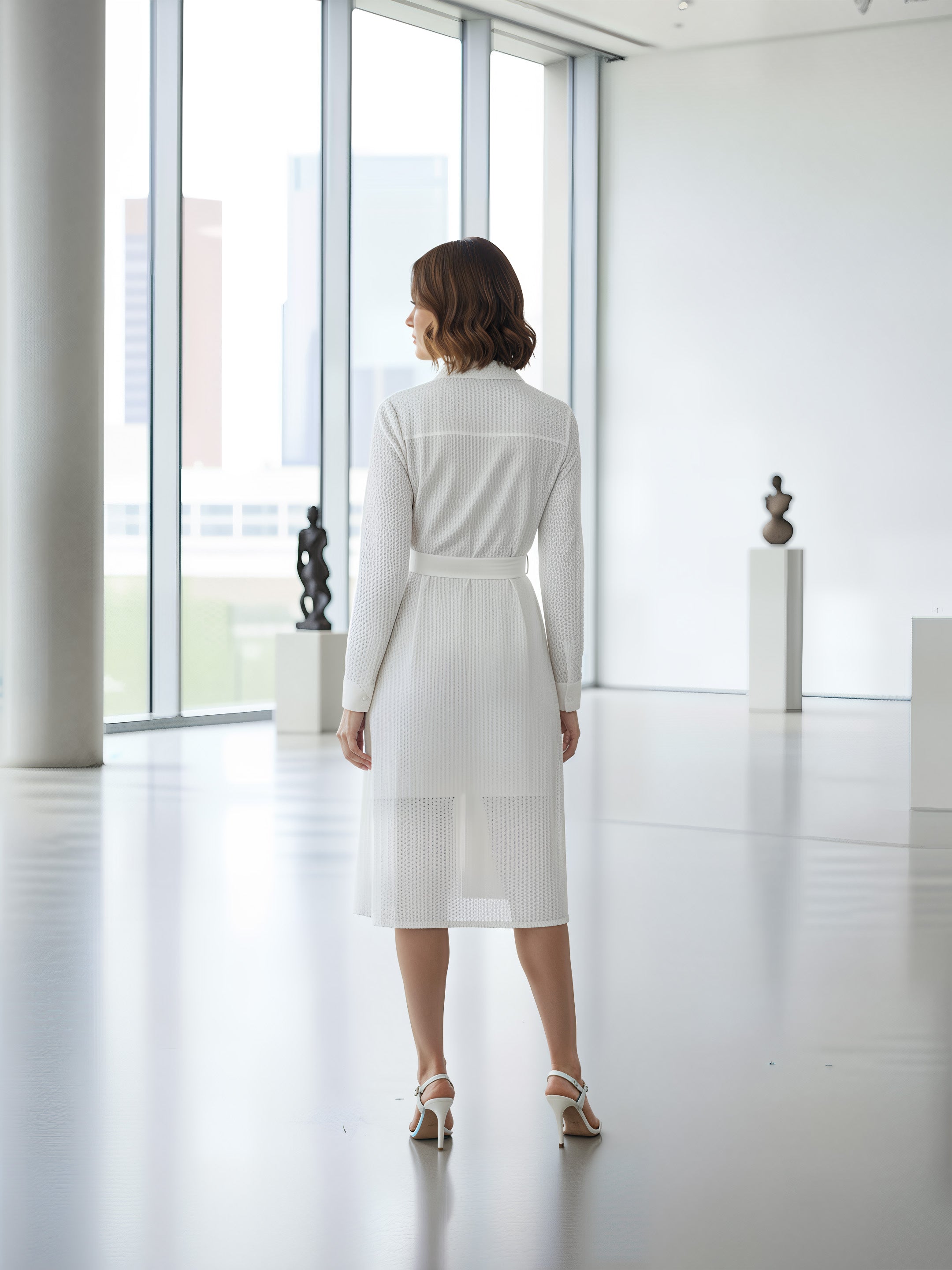 Sophisticated and versatile, this Natural Beige Belted Shirt Dress is tailored from a textured knit fabric with a structured finish. Designed with a classic shirt collar, button-down closure, and long sleeves with cuff detailing, it exudes polished elegance. The belted waist flatters the silhouette, while the dual front flap pockets add a functional yet chic touch. Falling above the knee, this dress is perfect for both work-wear and elevated casual outings.