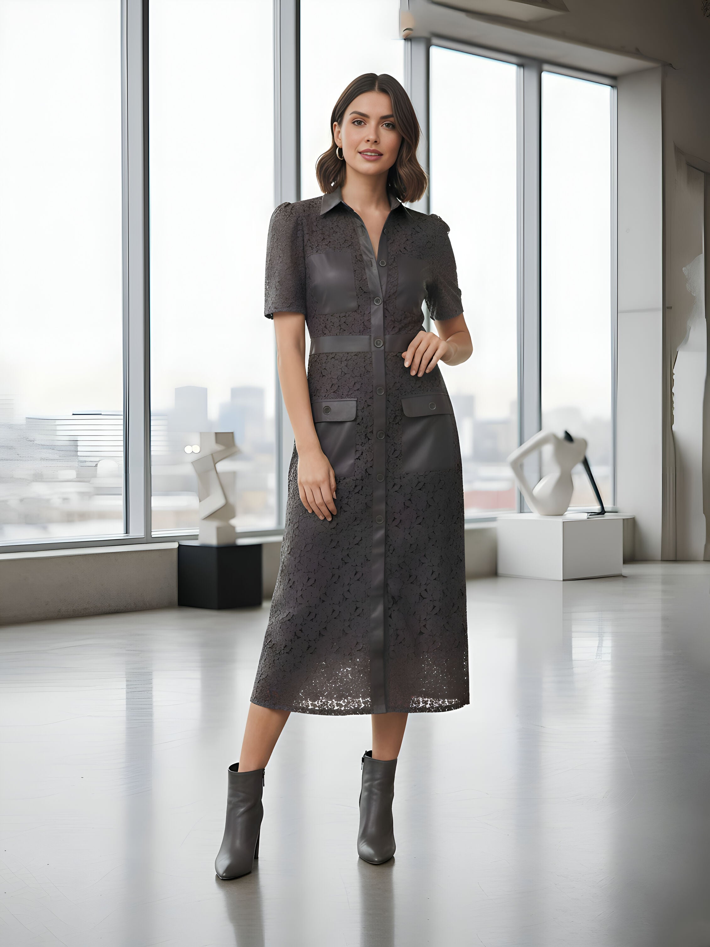 Where sophistication meets structure—the Noir Utility Lace Dress is tailored in a textured lace-inspired fabric with sleek faux-leather trims. Featuring a button-down front, sharp shirt collar, and four utilitarian flap pockets, this pencil silhouette offers a polished edge for work-to-evening dressing. Its knee-length cut with a subtle front slit ensures elegance with ease.