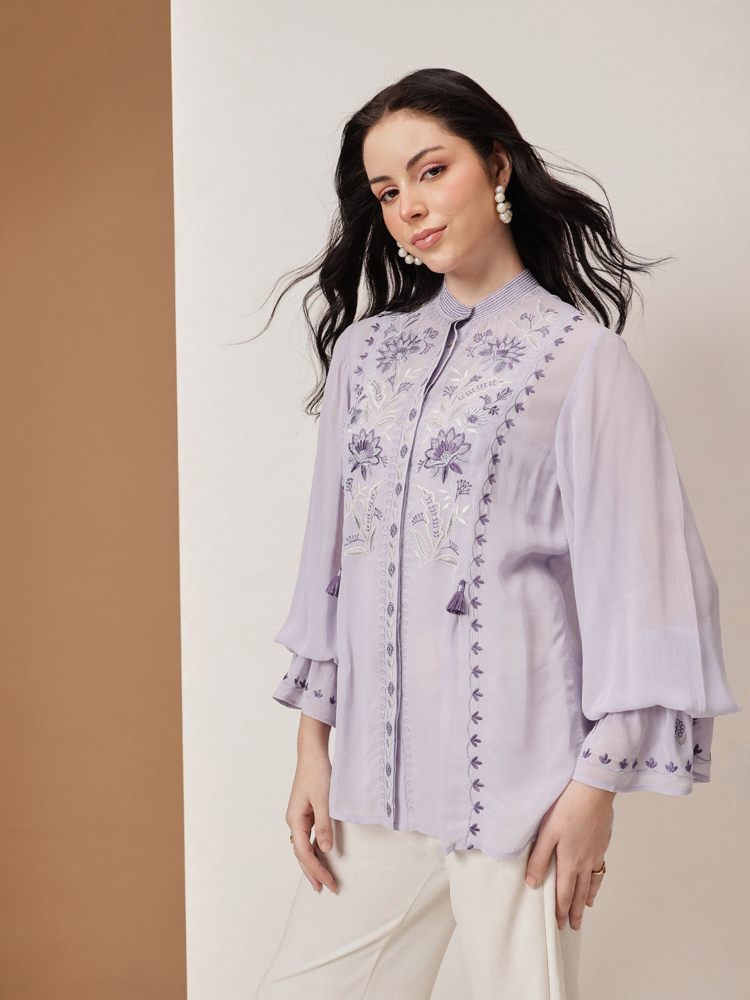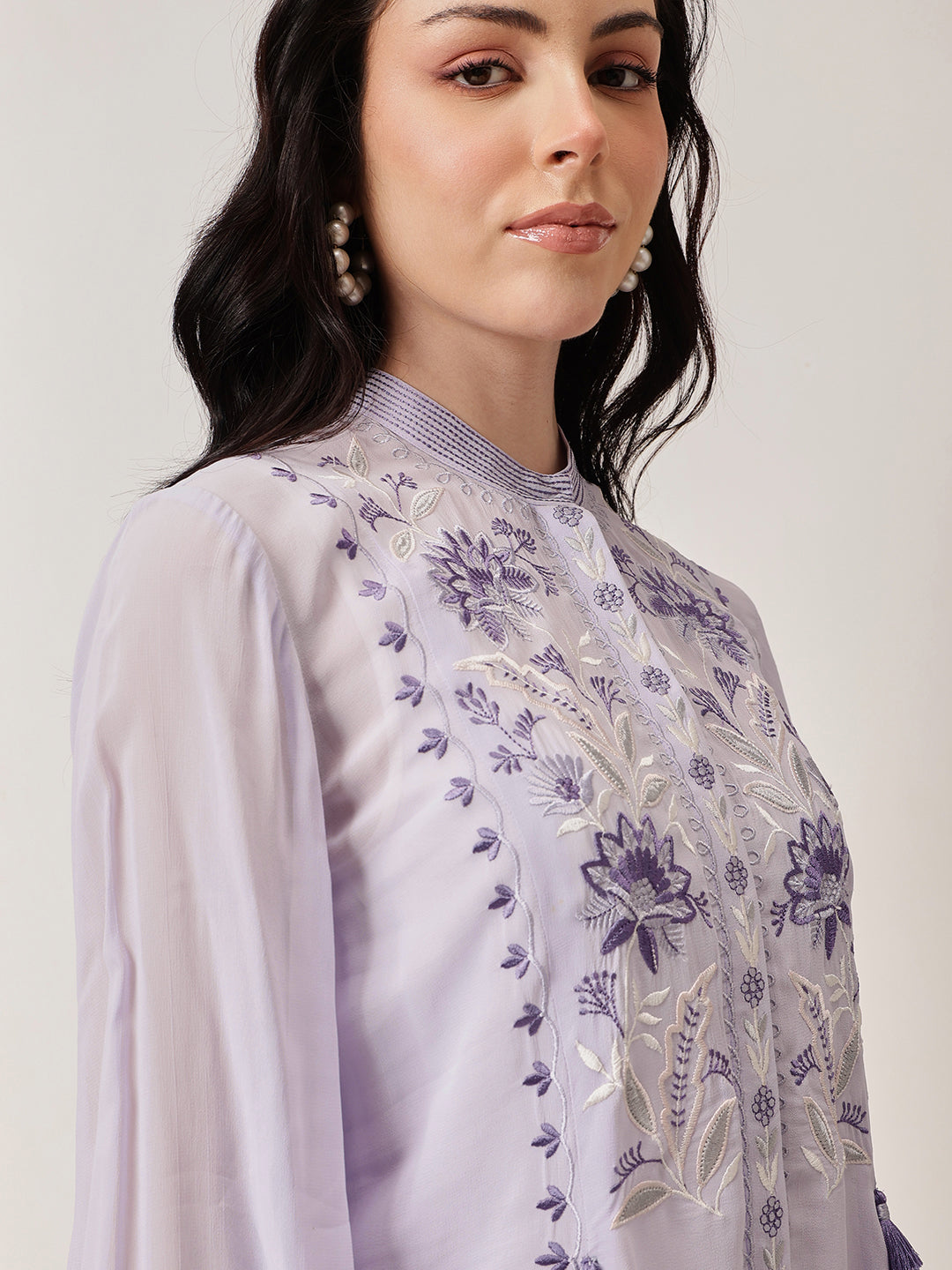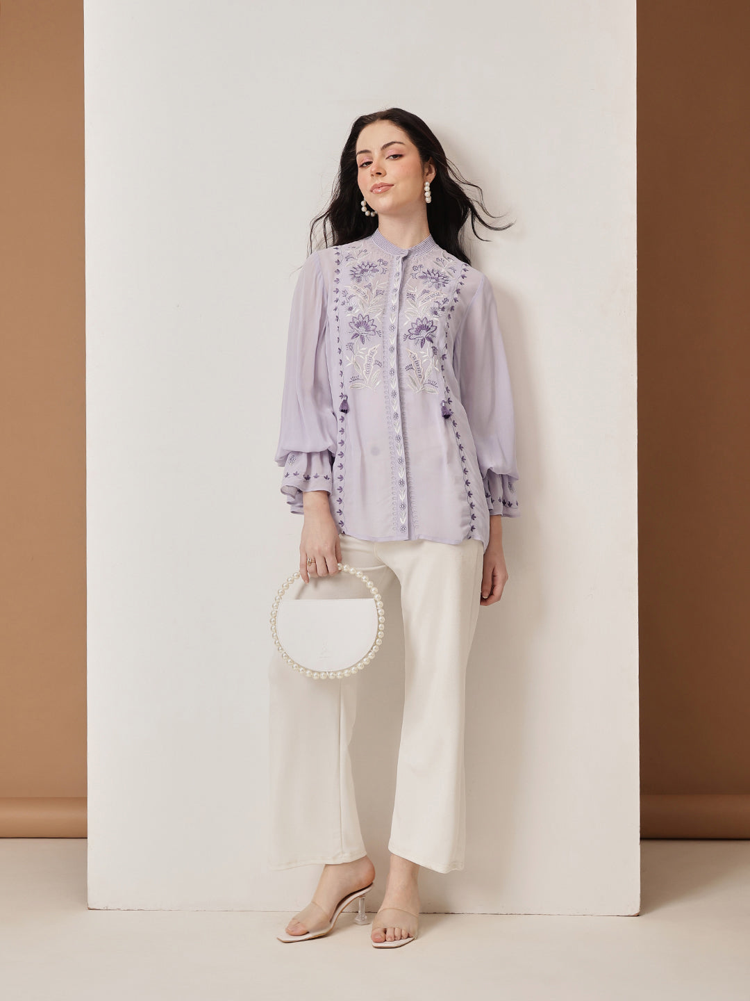 Delicate and feminine, the Lavender Elegance Embroidered Tunic brings a touch of sophistication to your wardrobe. Crafted from a lightweight, sheer fabric, this tunic features intricate floral embroidery in soft lavender and white hues, adding a graceful charm. The