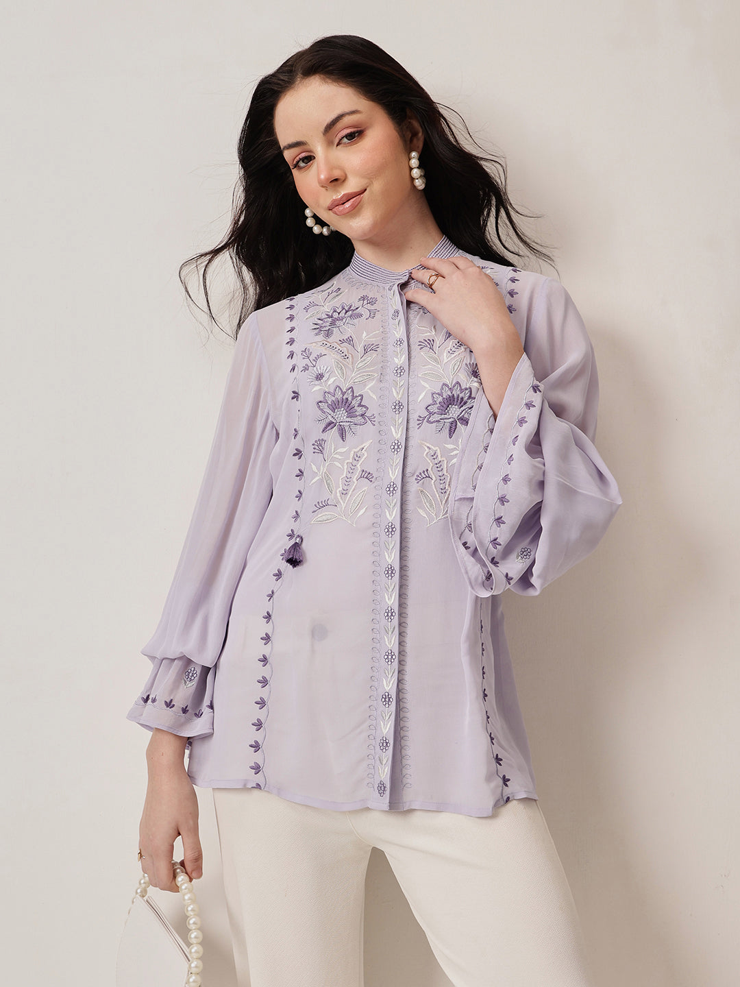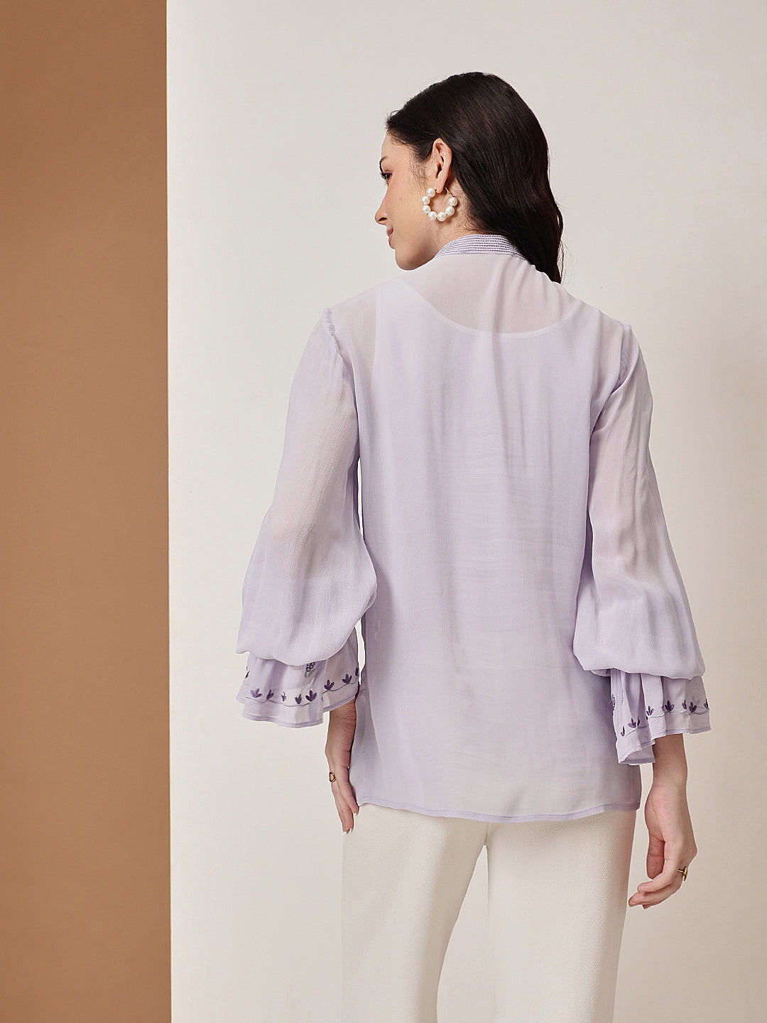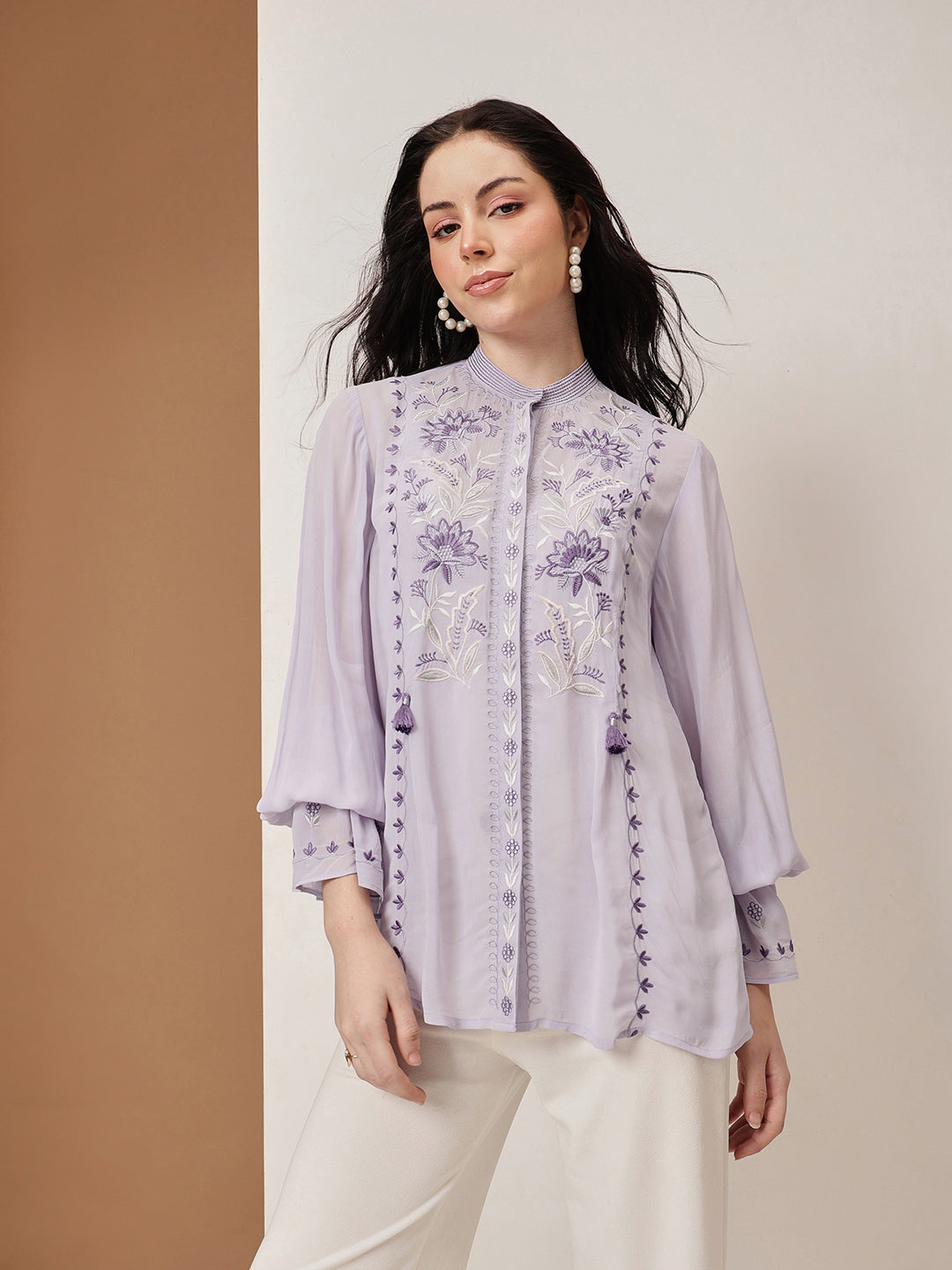 Delicate and feminine, the Lavender Elegance Embroidered Tunic brings a touch of sophistication to your wardrobe. Crafted from a lightweight, sheer fabric, this tunic features intricate floral embroidery in soft lavender and white hues, adding a graceful charm. The