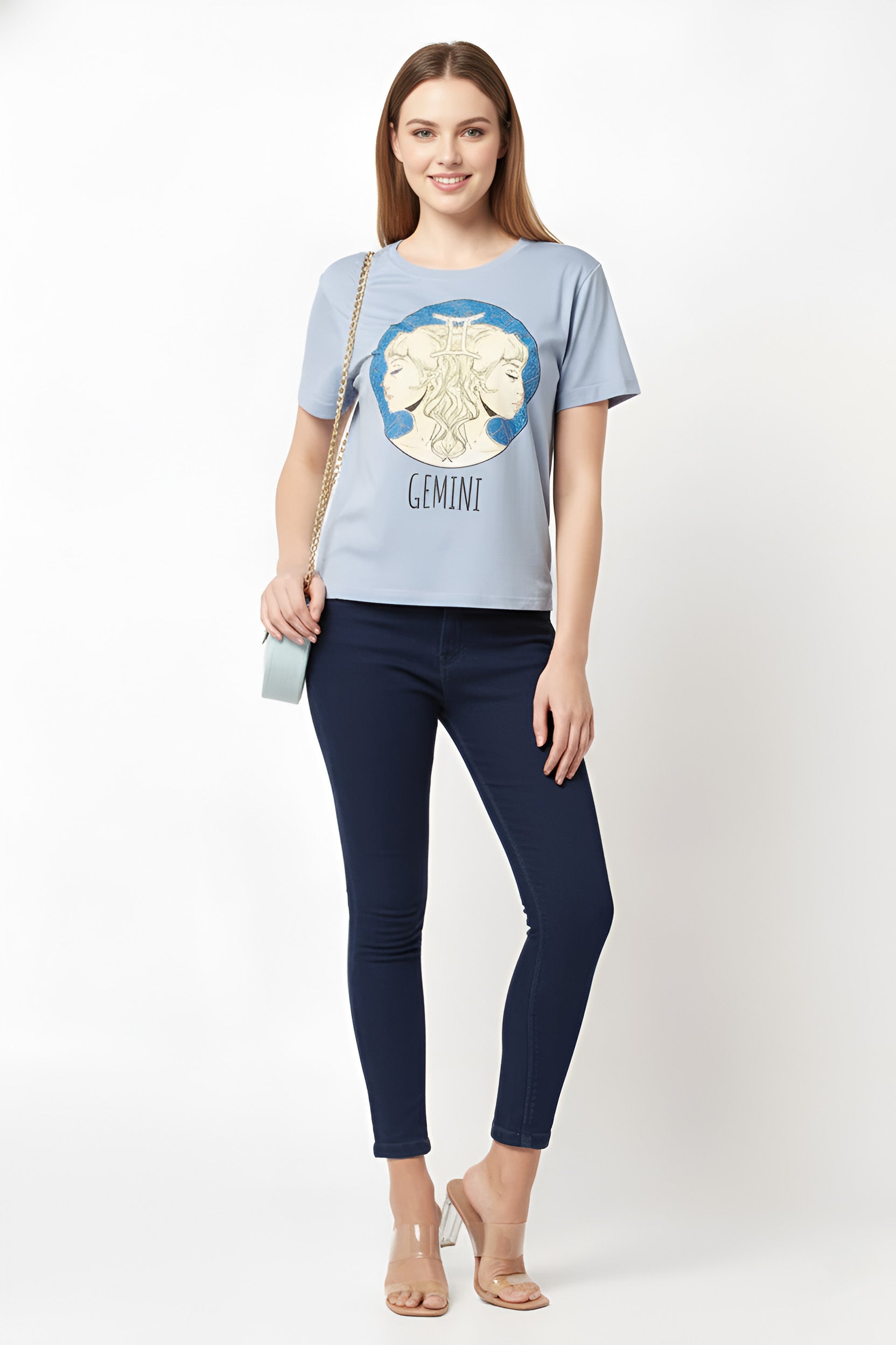 Keep things casual with this loose-fit light blue gemini zodiac sign printed t-shirt. versatile and comfortable, this t-shirt is a great pick for casual wear. it is cut into a comfortable fit, round neck, and half sleeves. quirky print makes it look more attractive.