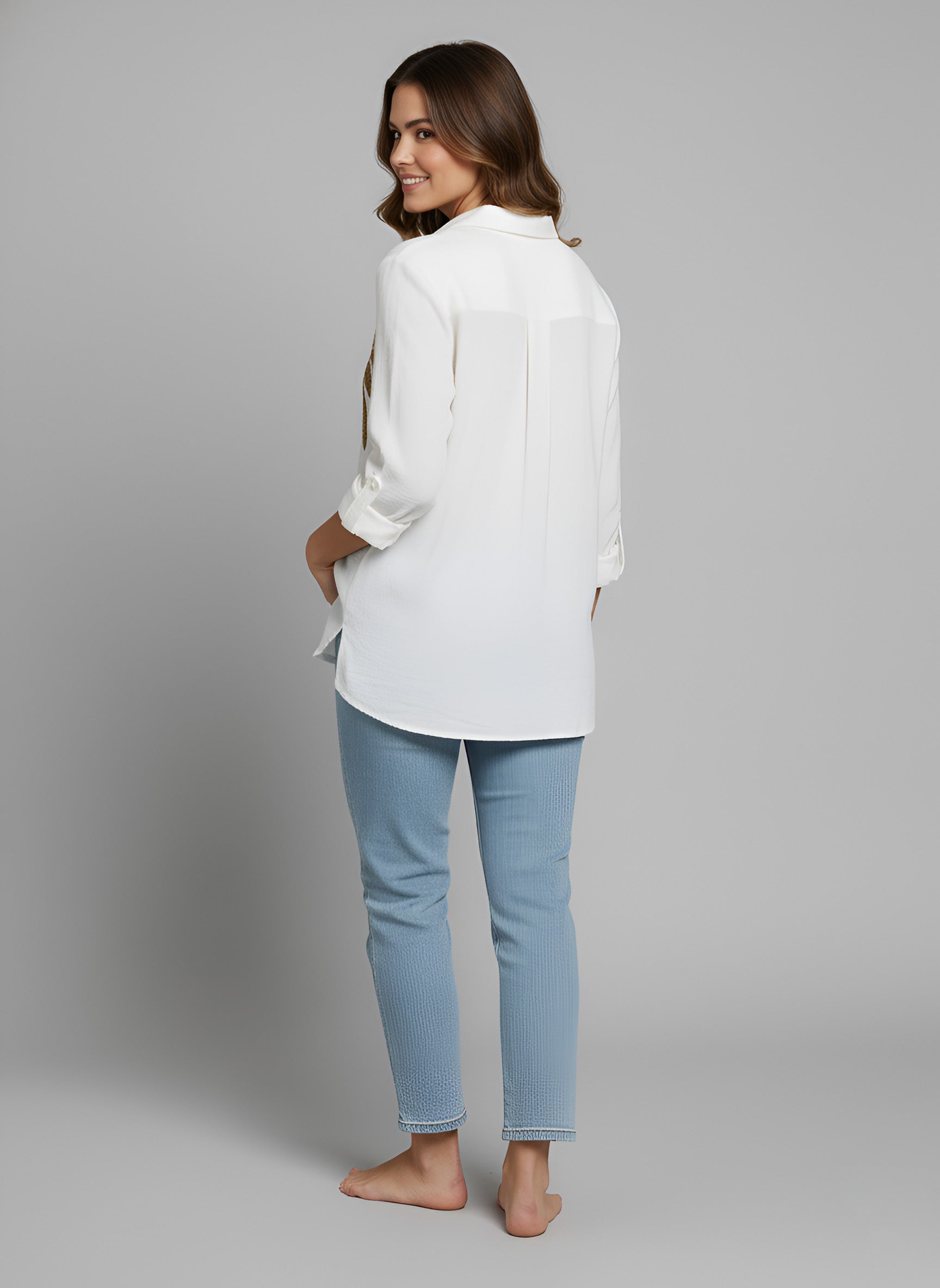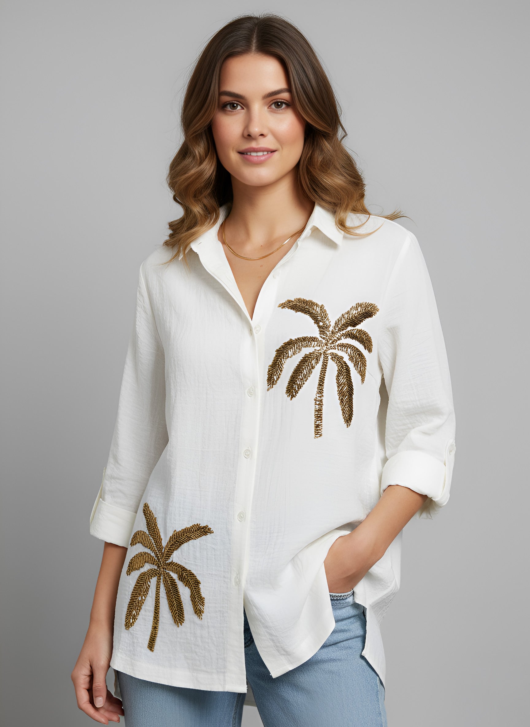 Upgrade your vacation wardrobe with this stylish cream linen shirt palm sequins design, crafted in breathable linen or cotton blend fabric for all-day comfort. This elegant sequin palm tree button-down shirt features eye-catching palm tree motifs highlighted with gold sequin and embroidered embellishments, making it a perfect embellished cream shirt for modern women.
