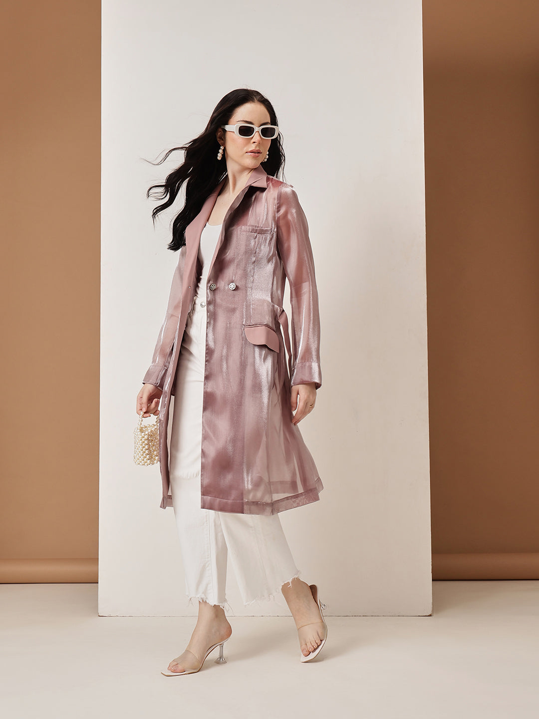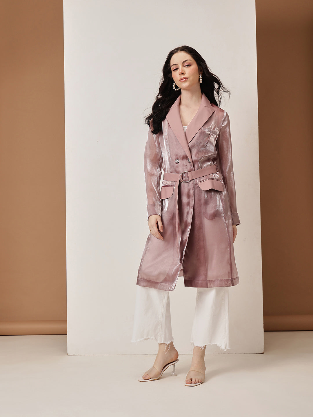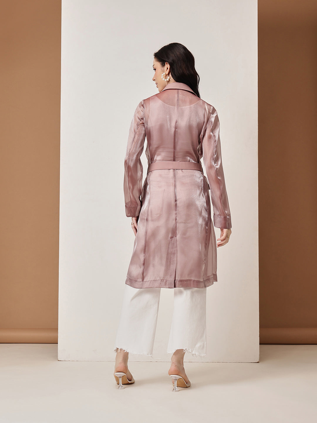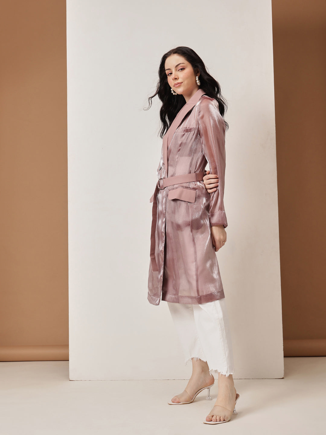 metallic sheen in a soft rose gold hue, exuding luxury and confidence. The tailored silhouette is enhanced with a structured lapel collar, a belted waist for a cinched look, and flap pockets that add a touch of practicality. The lightweight sheer fabric with a subtle shimmer makes it ideal for layering over both casual and formal ensembles. Whether you're stepping out for a chic evening event or looking to add glamour to your everyday look, this trench coat is a must-have wardrobe essential.