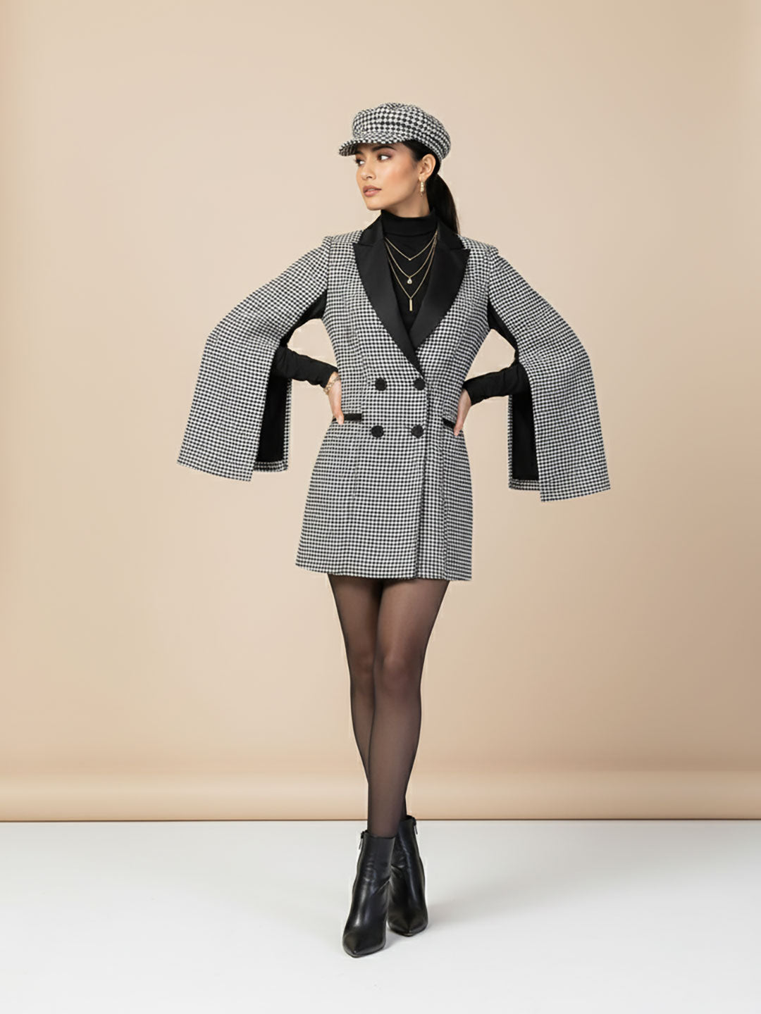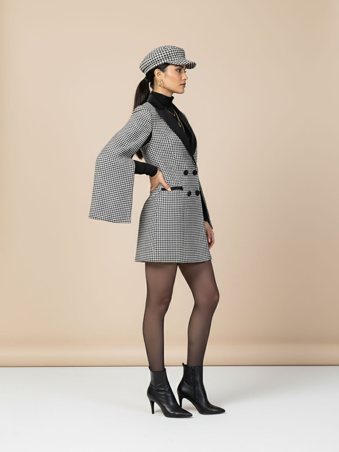Pretty in flush is her vibe! anyone wearing this checked blazer dress will have a fun-loving fashion vibe for the day. beautifully knitted, this dress can shape any body type, ensuring a flattering fit for everyone. crafted from cozy, warm fabric, it combines style and comfort effortlessly. the asymmetric neckline adds a unique touch of sophistication. Pair it with a nice handbag and formal boots for that extra flair and embrace the season with confidence. style it with signature earrings for a complete look. whether it's a casual outing, dinner party, or office party, this dress promises to keep you both stylish and snug throughout the winter festivities.