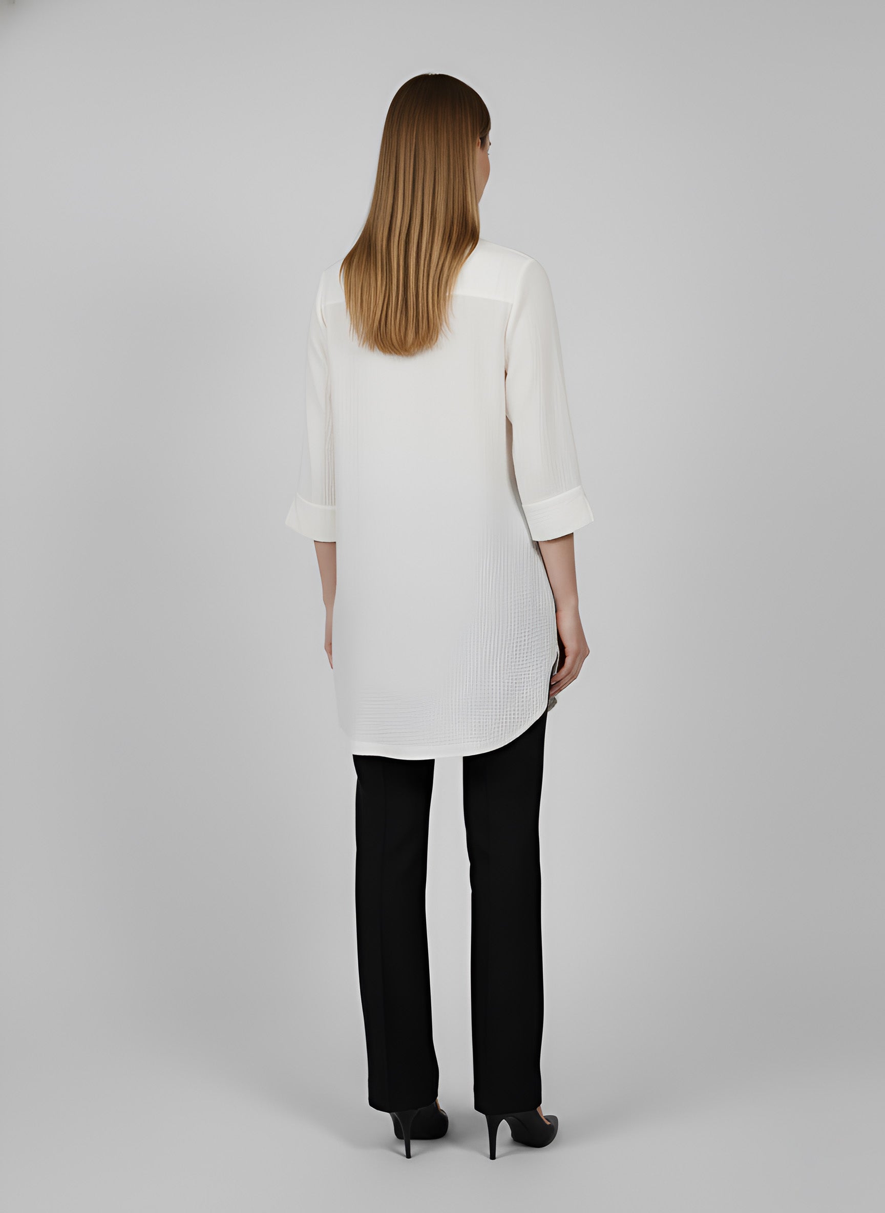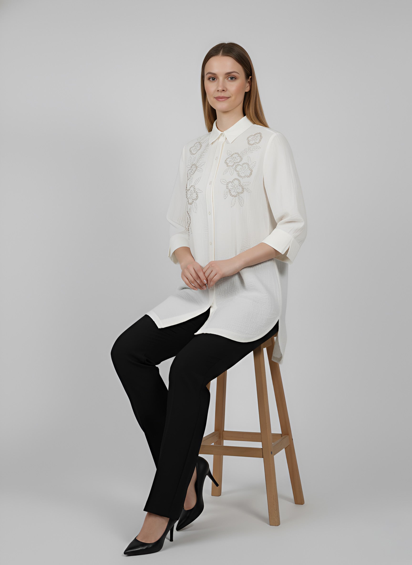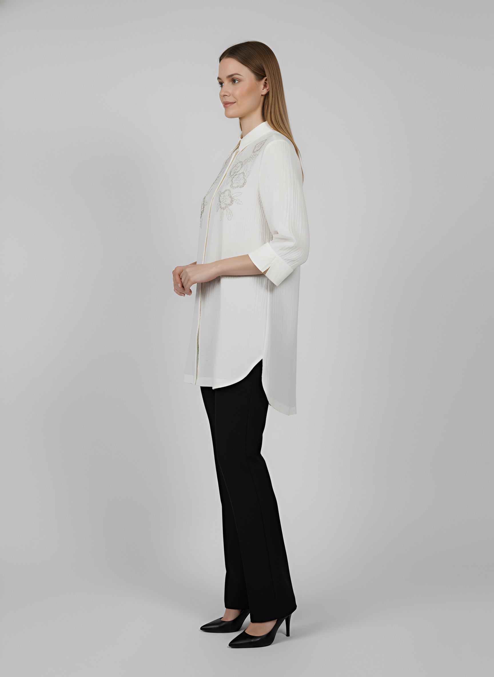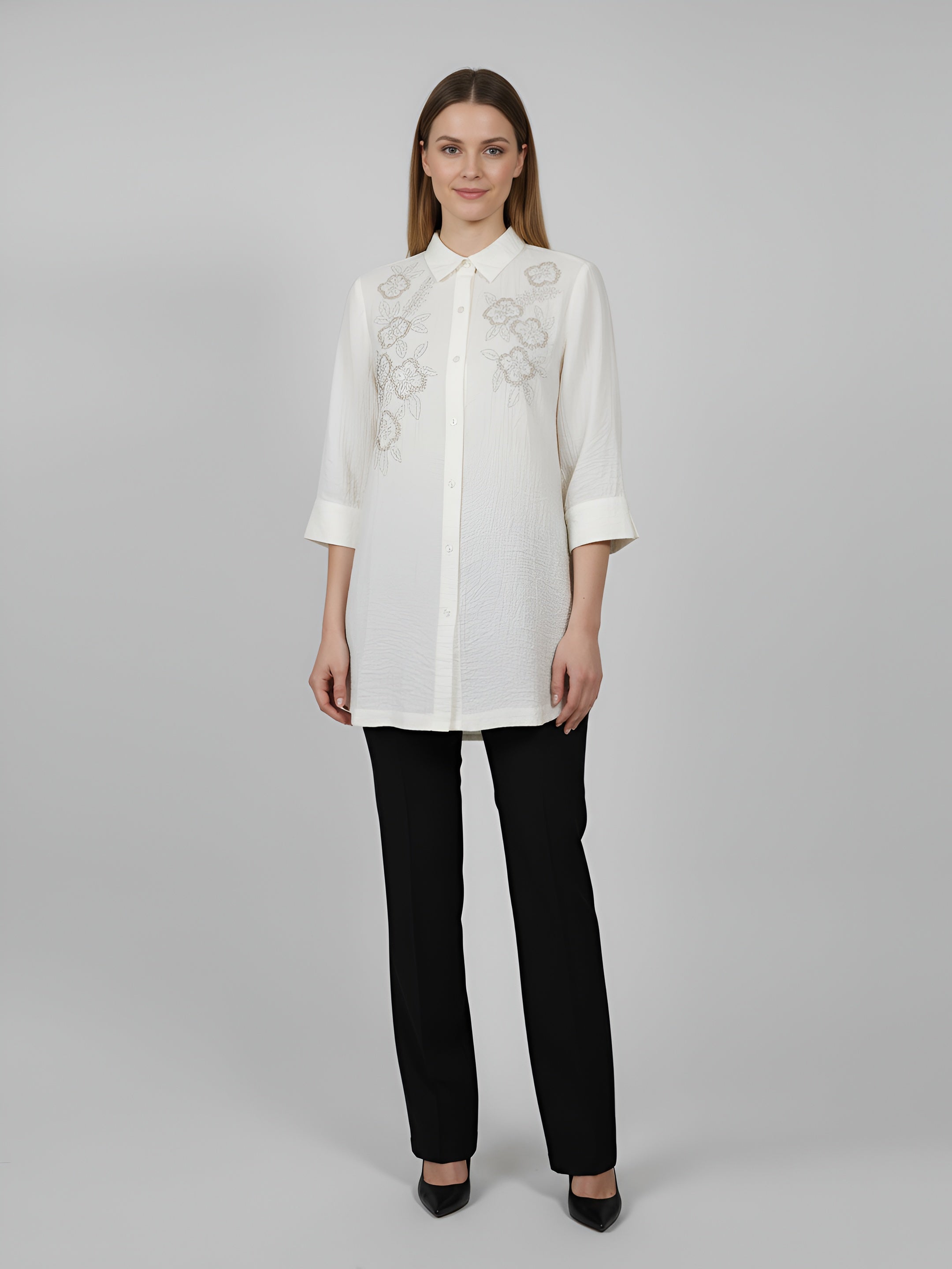 Classic meets contemporary in this ivory button-down shirt featuring delicate tonal floral embroidery across the chest. The tailored silhouette with a soft collar and three-quarter sleeves brings quiet sophistication, while the detailed threadwork adds a layer of texture and refinement. A versatile essential that elevates weekday and weekend looks alike.