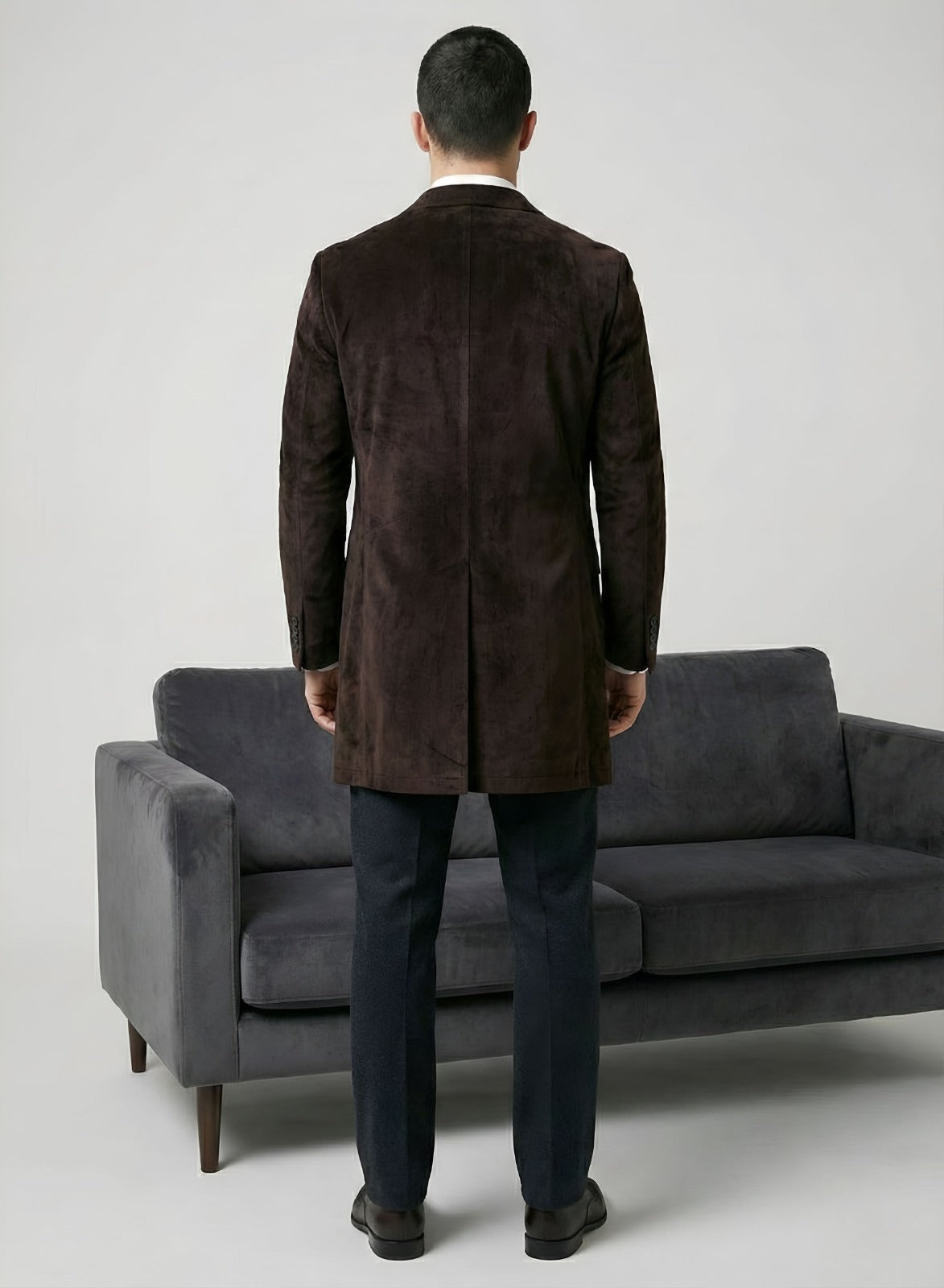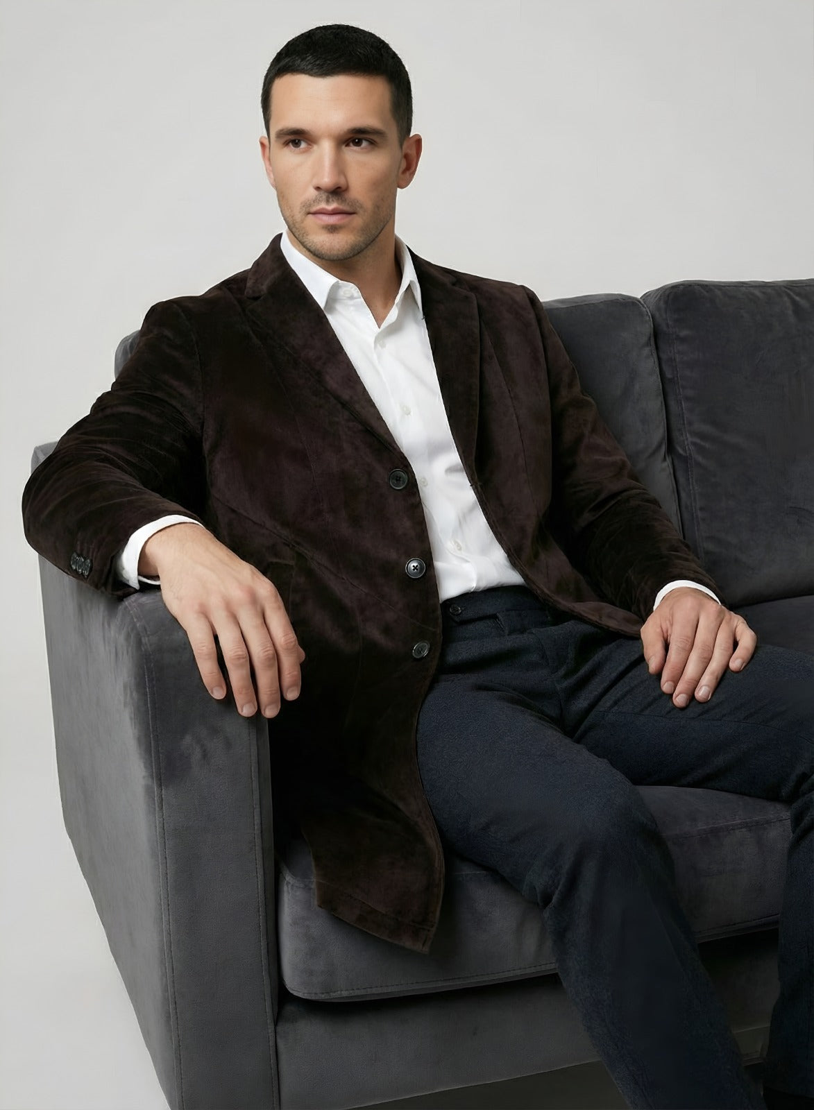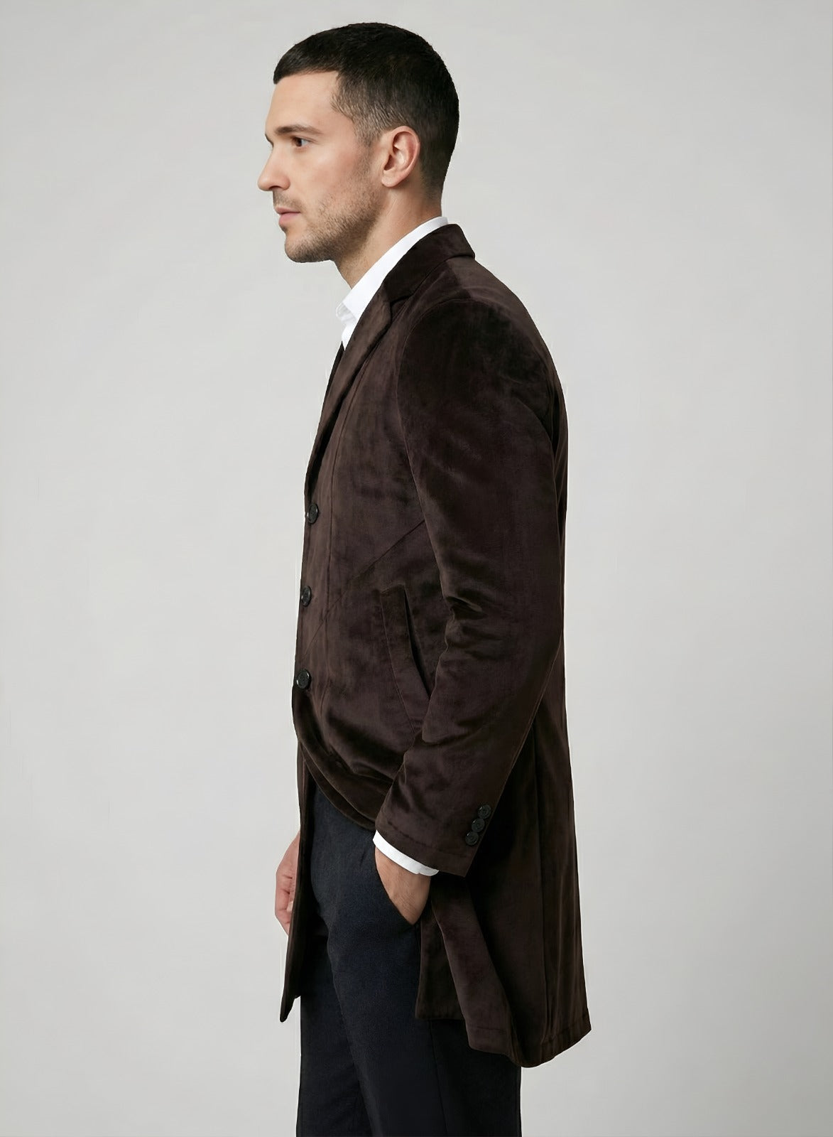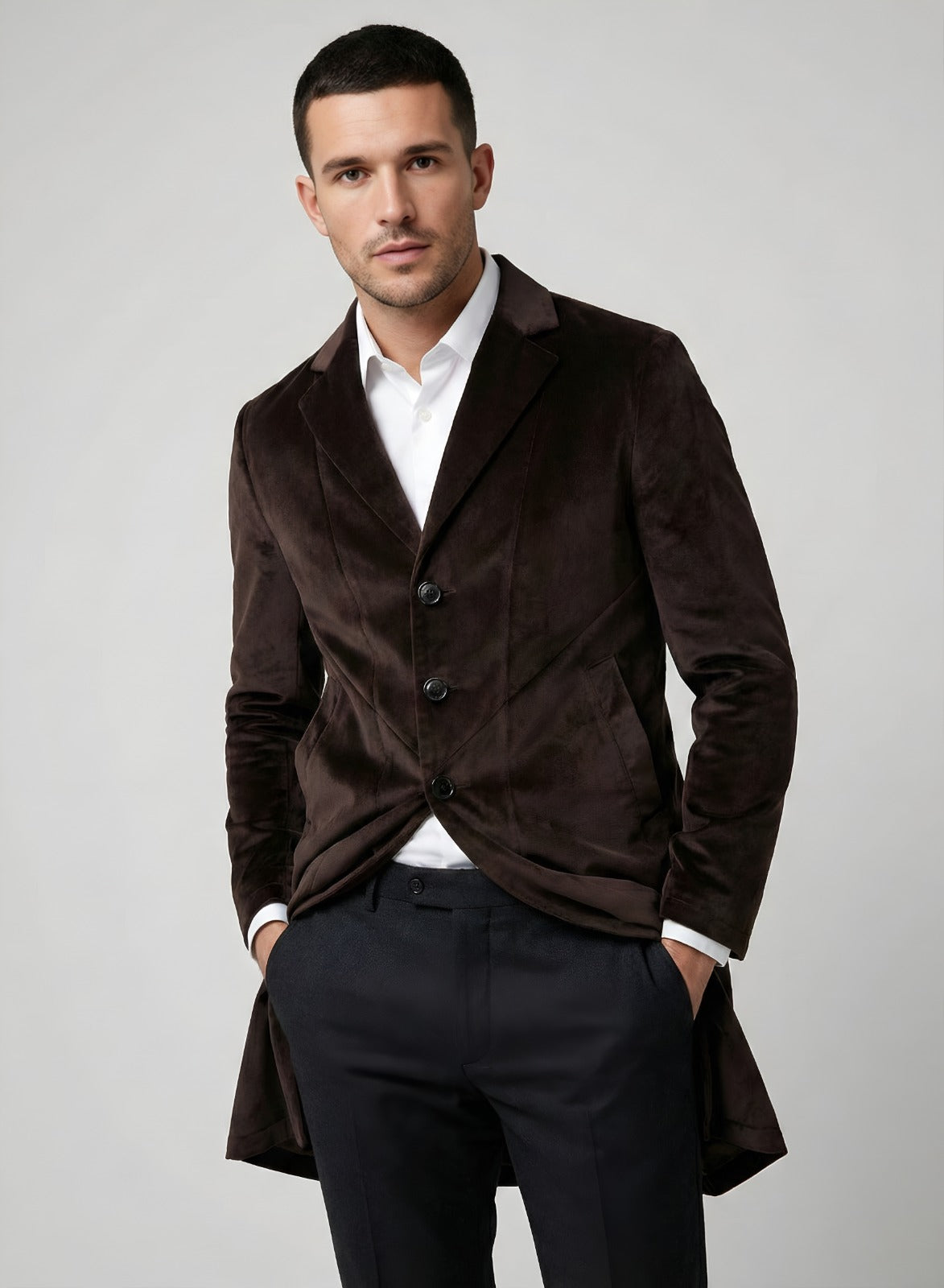 Elevate your style with this sophisticated men's brown velvet long blazer. This slim fit velvet blazer combines classic tailoring with modern flair, perfect for any formal or smart-casual event. Featuring a stylish peak lapel velvet jacket design and a single-breasted velvet coat front, this versatile piece in rich chocolate brown velvet blazer is ideal for winter velvet overcoat needs or as party wear velvet jacket men. Looking to buy men's brown velvet coat online? This elegant cotton velvet blazer men offers a timeless appeal for a wedding guest velvet coat outfit.