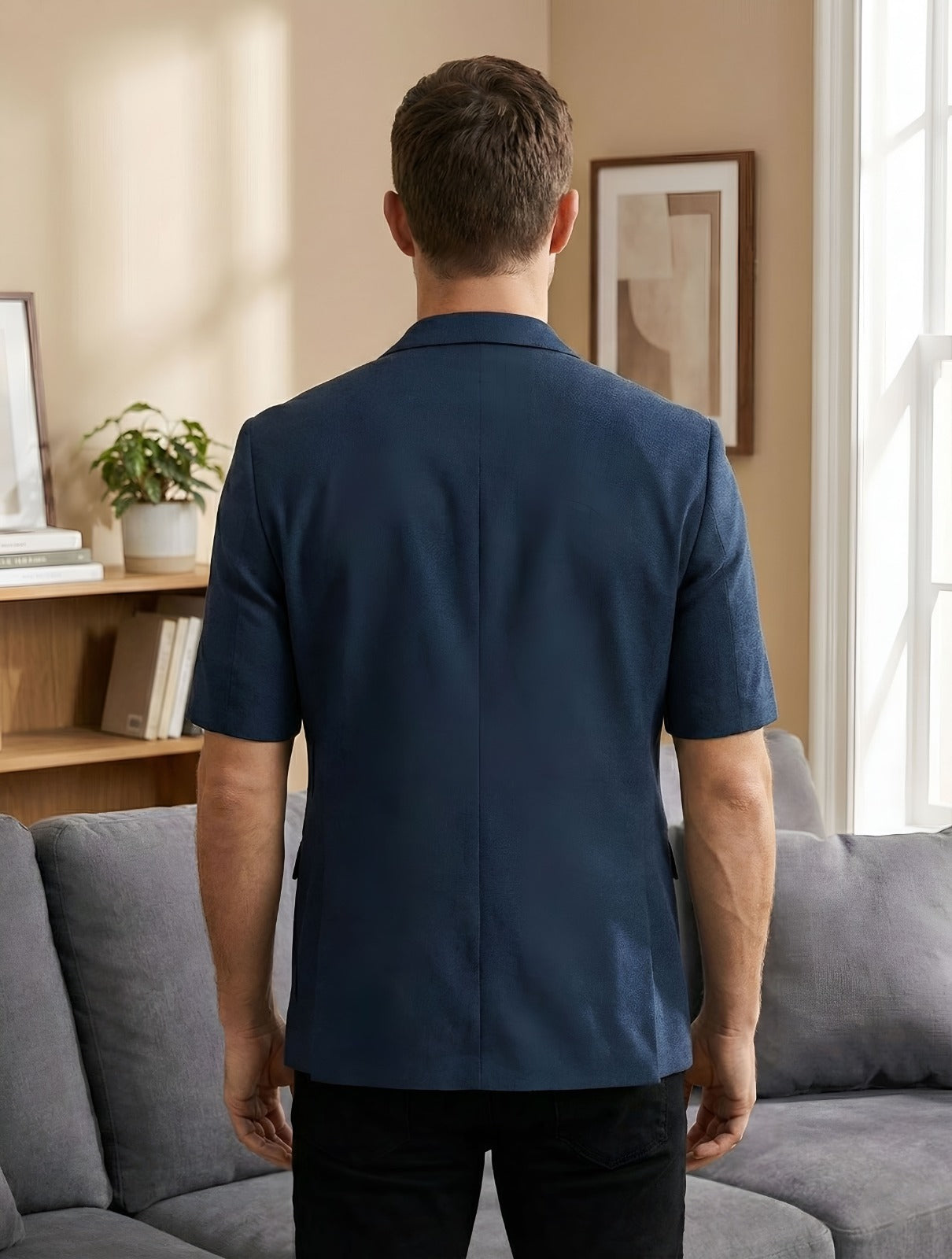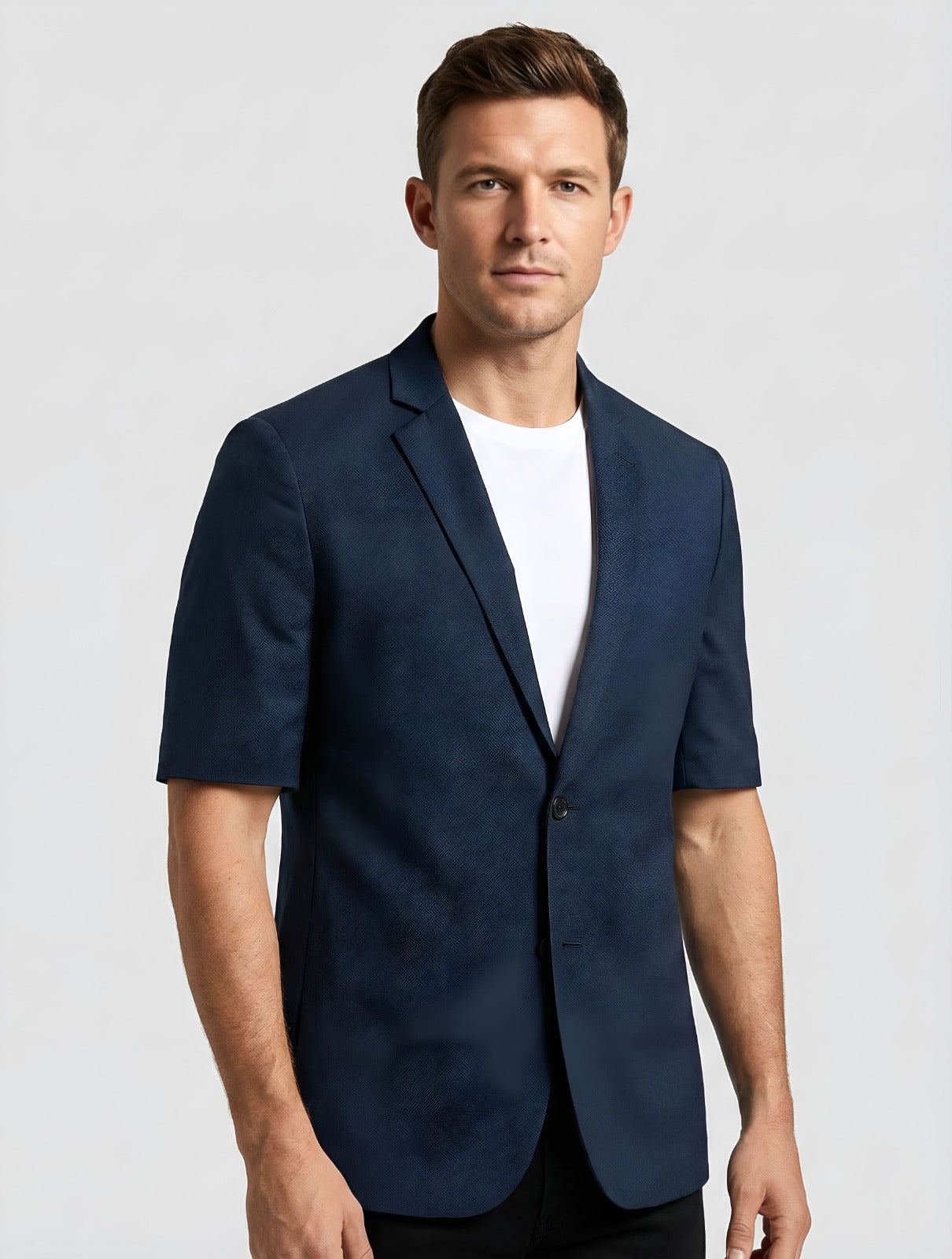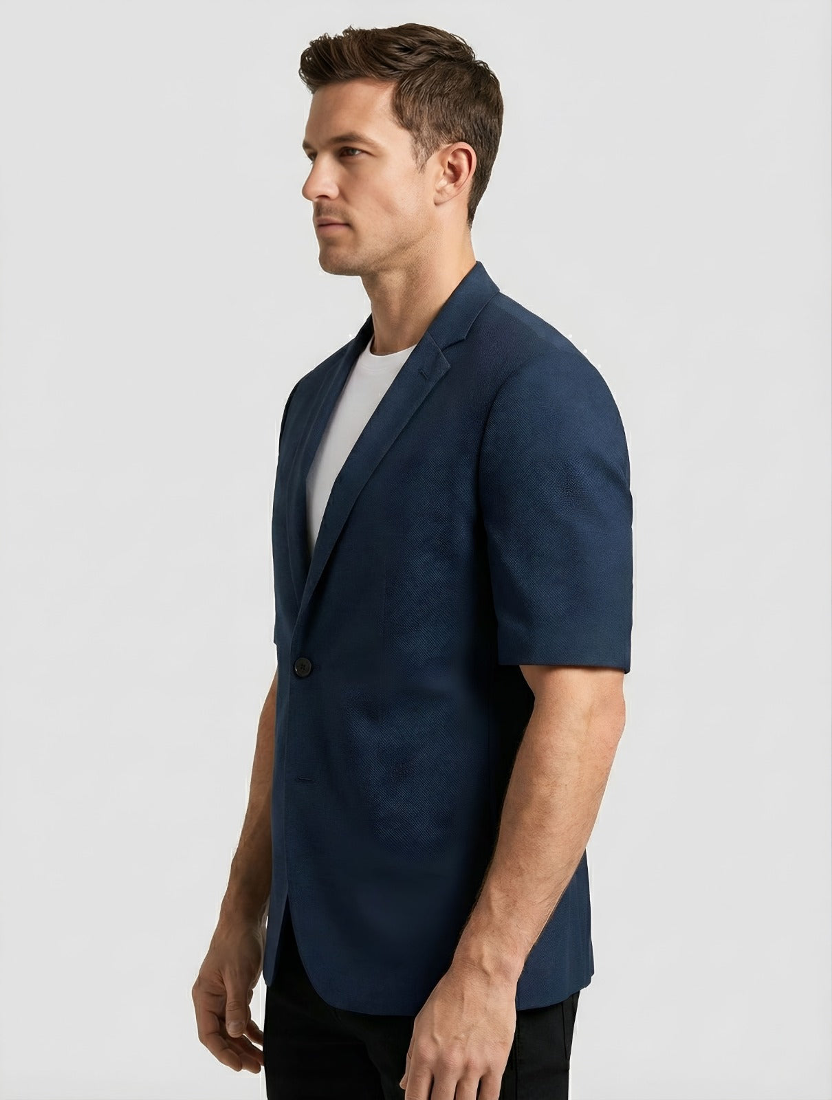 Discover the perfect blend of style and comfort with our men's navy blue short-sleeve blazer, designed to elevate your warm-weather wardrobe. This versatile casual blazer offers a modern, breathable option. The design is focused on smart functionality. Crafted from a high-quality, lightweight fabric a cotton blend short sleeve blazer material—it ensures maximum comfort and airflow, making it the ideal lightweight summer blazer men can rely on. The tailored fit aligns with the "slim fit casual blazer men" aesthetic. Pair it with a white t-shirt and dark jeans. An essential piece for smart casual menswear, addressing all your needs for a smart, adaptable jacket.