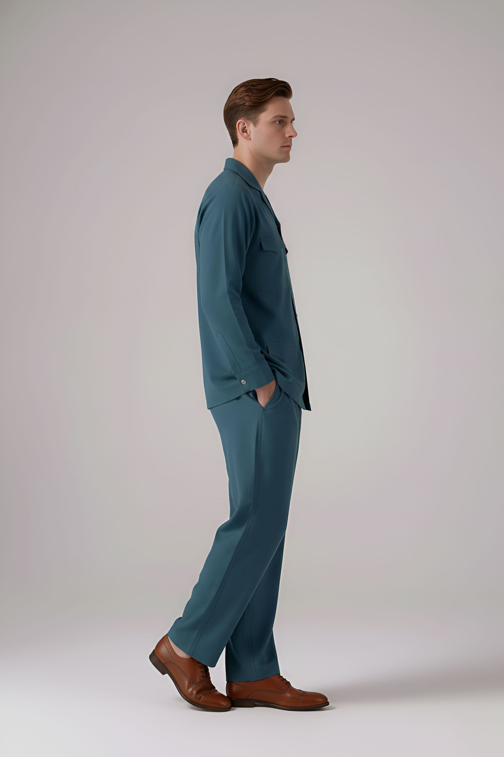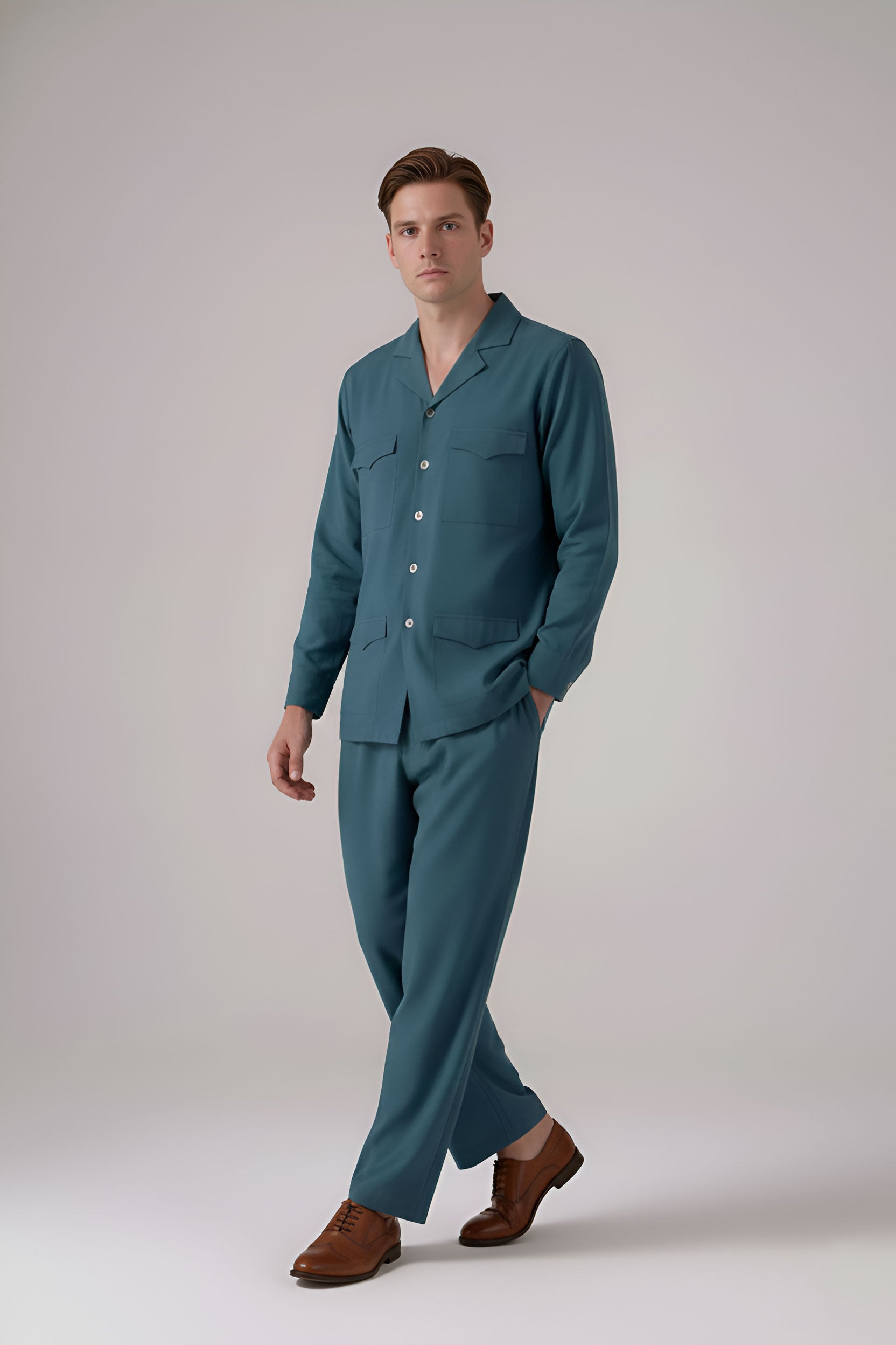 Experience effortless elegance with the Deep Teal Cuban Collar Power Suit, a perfect blend of comfort and sophistication. This set features a structured yet relaxed silhouette, crafted from premium fabric in a rich teal hue. The top is designed with a stylish Cuban collar, full sleeves, and a button-down front, while four functional flap pockets add a touch of utility and modern charm. The matching loose-fit trousers offer ease of movement, making this Power Suit ideal for casual outings, travel, or evening gatherings.