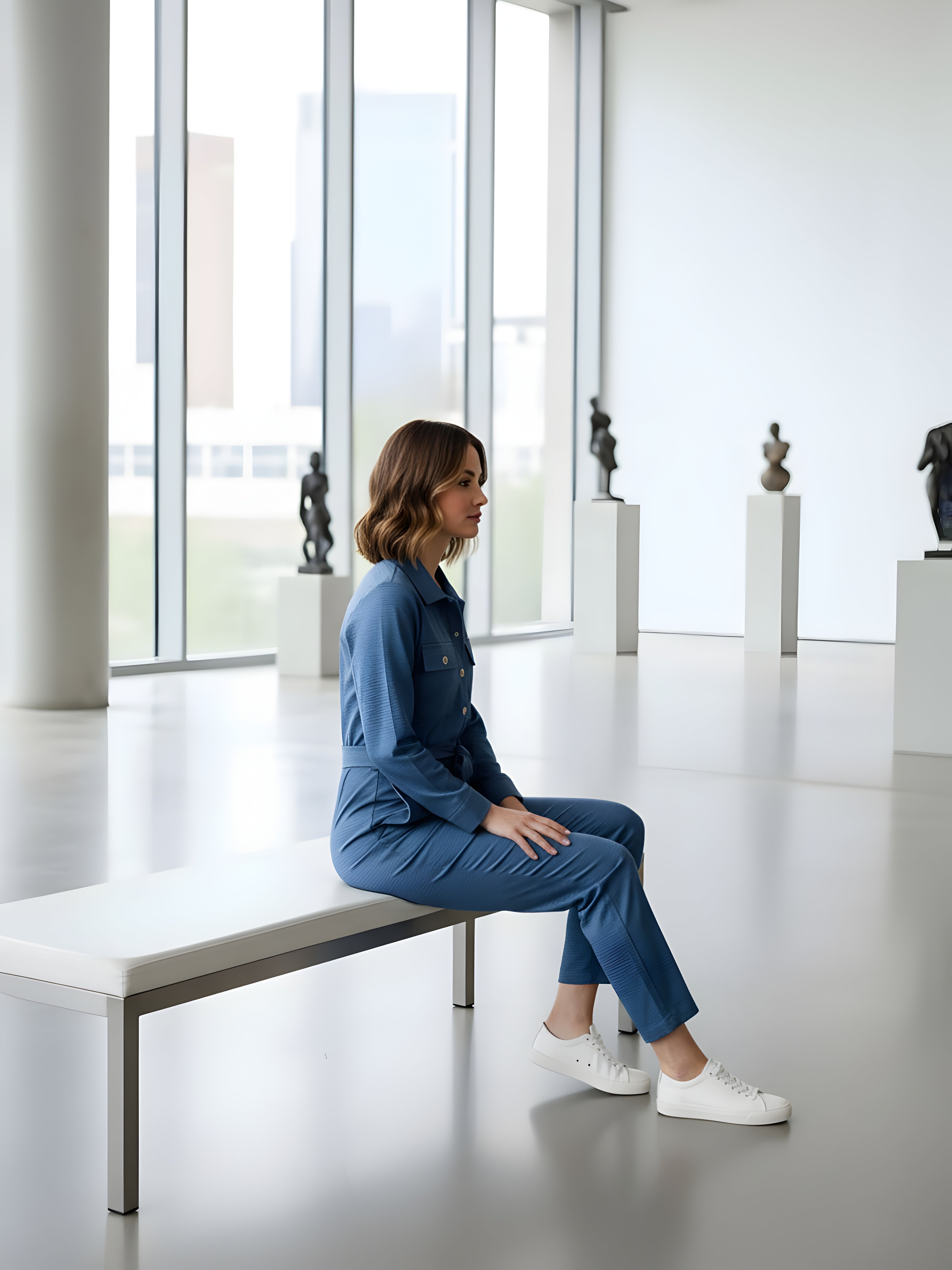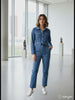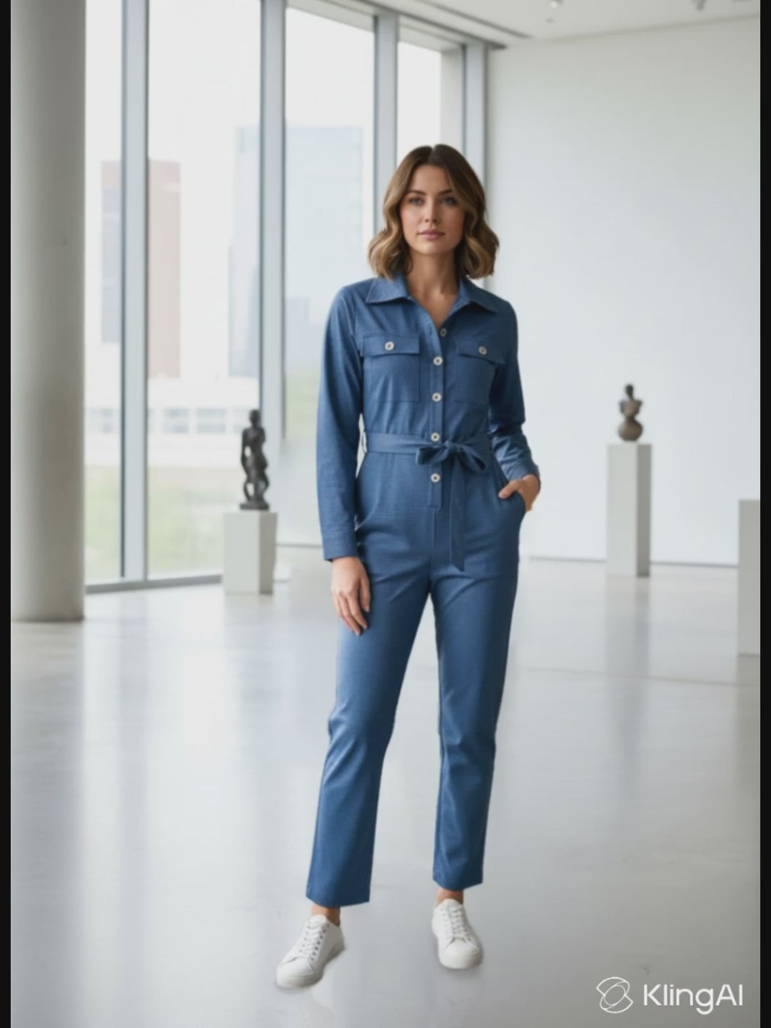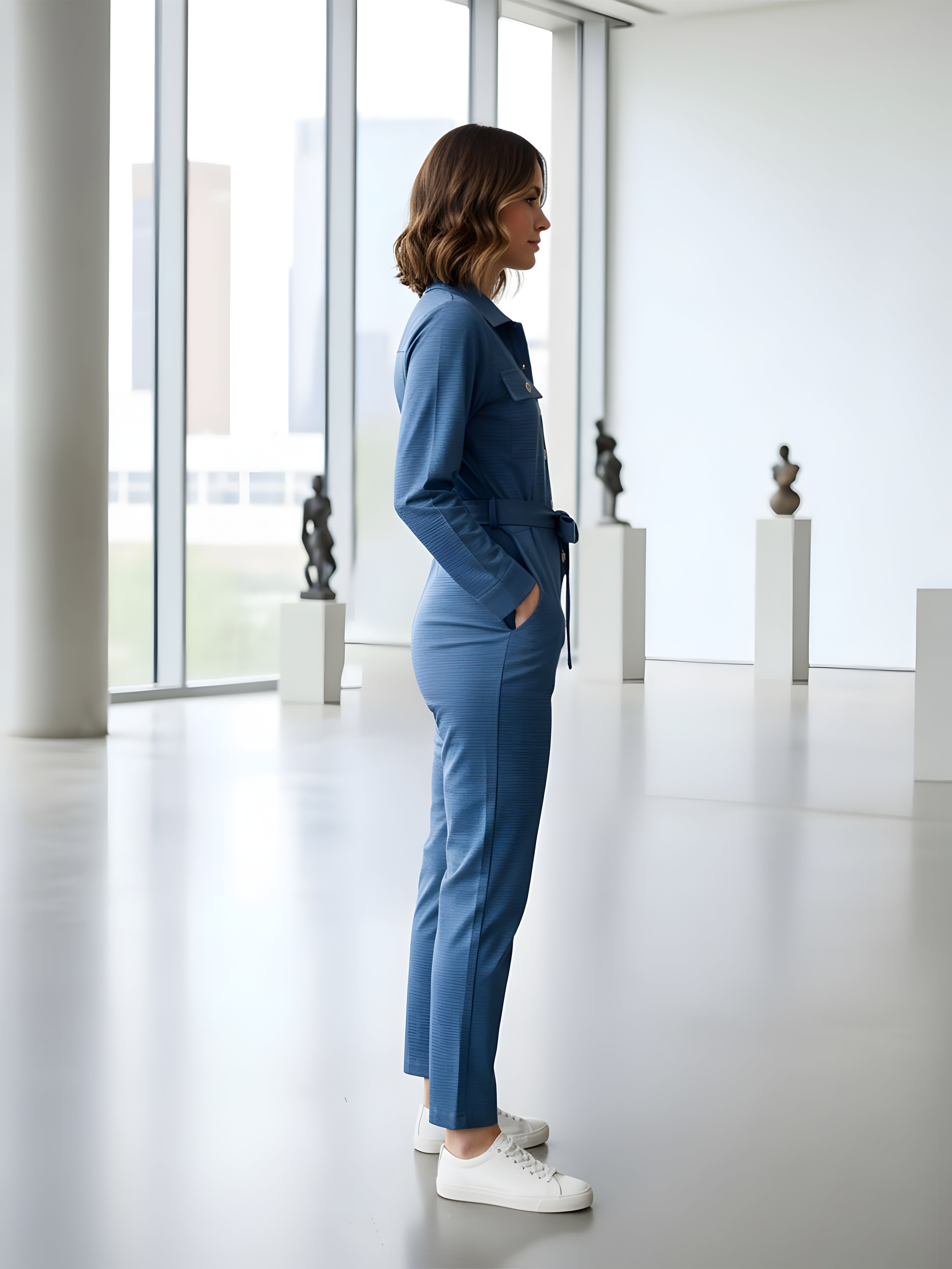 This blue self-textured basic jumpsuit has a collar style straight body along with a belt which makes it an absolute fit for a formal outfit or casual wear. it’s a must-have in your everyday wear collection.