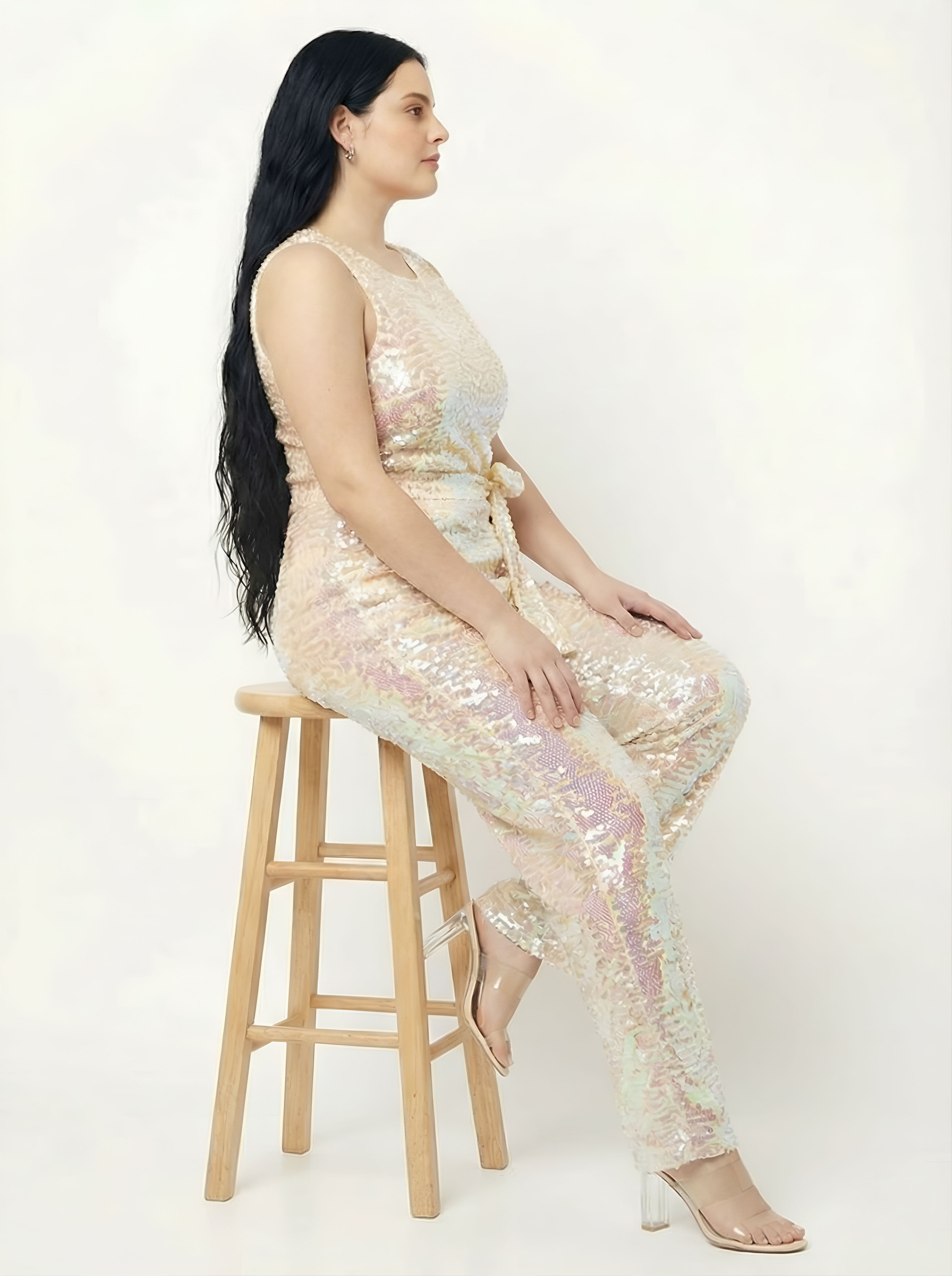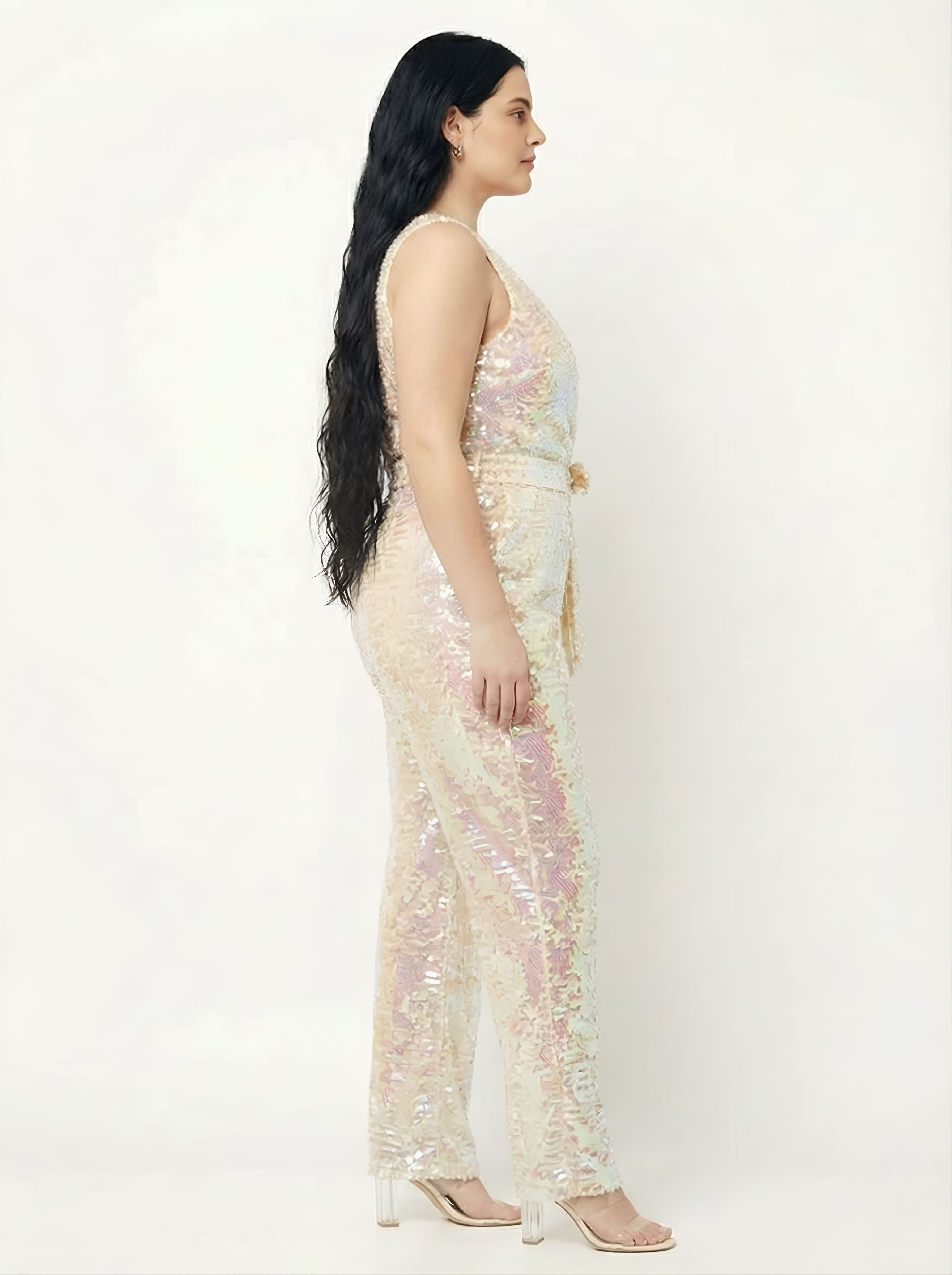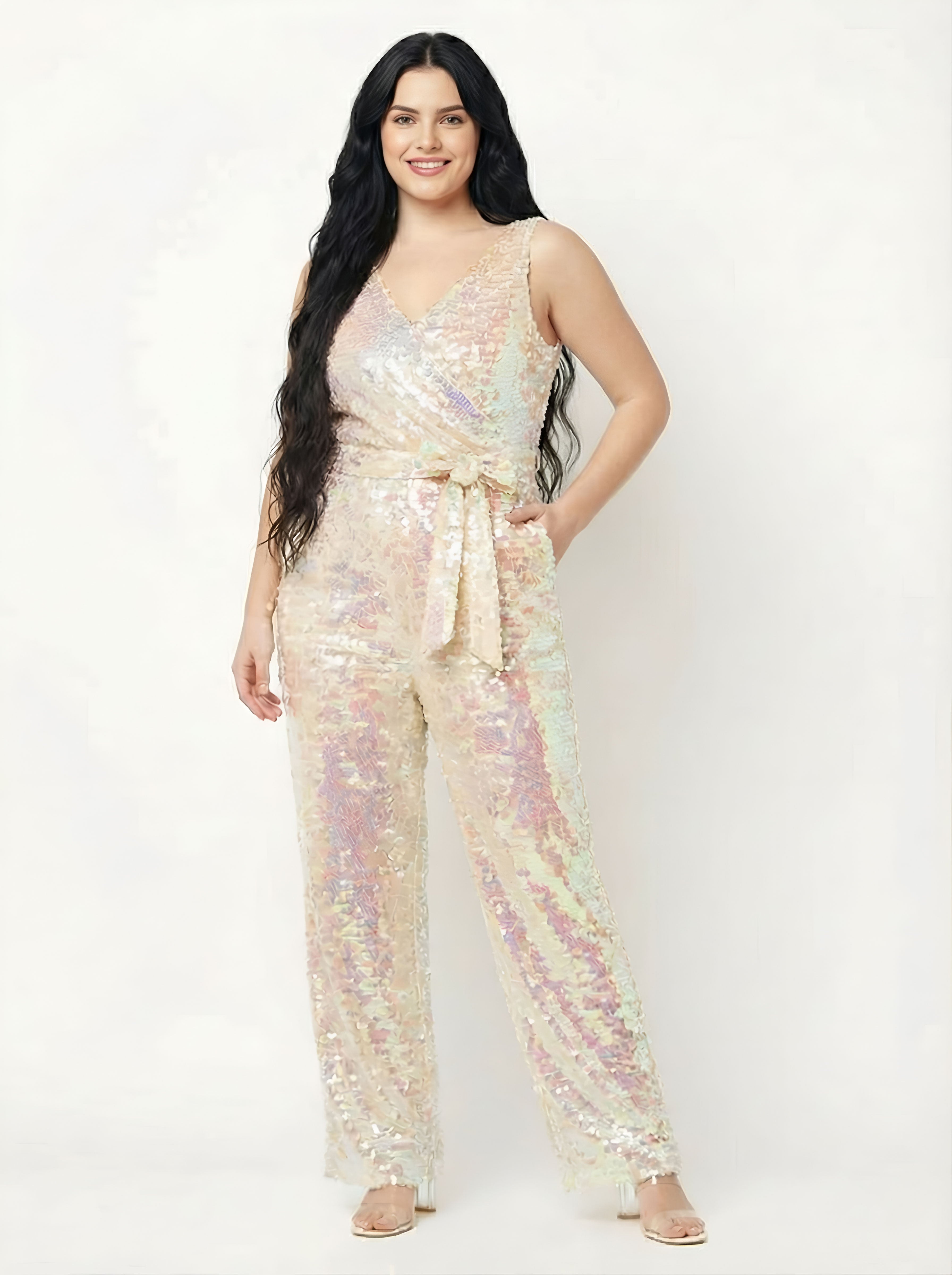 Look stunning and amazing in this unique sequence jumpsuit with rainbow color effects. It has a v-neckline and matching belt.t is suitable for a night out, cocktail party evening, holiday, or any special occasion.