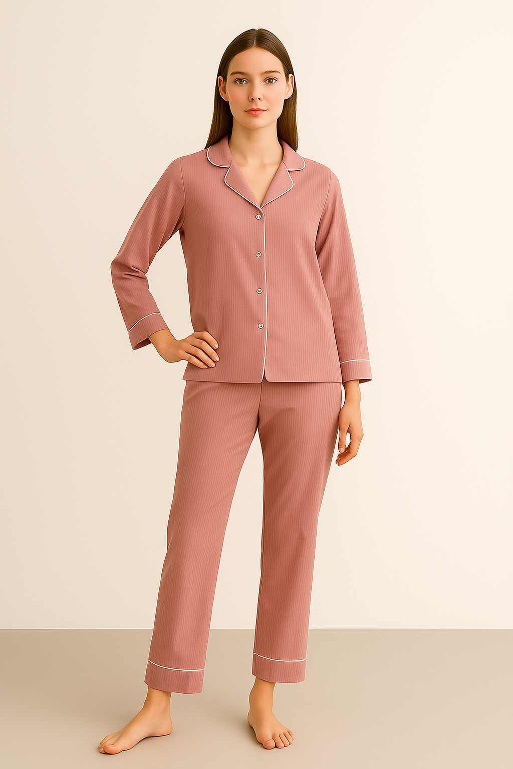 Elegant and inviting, this dusty pink pyjama set is made from a soft, breathable fabric designed for ultimate comfort through the night. The button-down shirt features white contrast piping along the collar, cuffs, and placket, adding a touch of timeless charm. Paired with matching straight-fit trousers, it offers ease of movement for both lounging and sleeping.