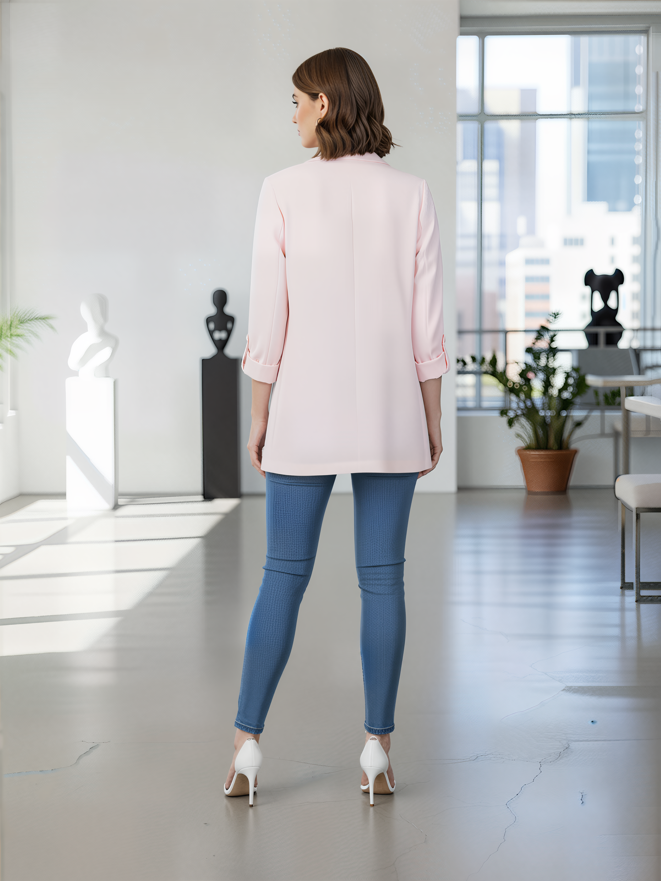Introducing the elegance cascade blazer from Artistfy western, a sophisticated addition to any fashion-forward wardrobe. this blazer features a soft pastel pink hue that exudes femininity and grace. the design showcases a flowing, open-front silhouette that adds a touch of effortless chic to the overall look. The blazer is adorned with subtle embroidery along the edges, providing an exquisite detail that elevates the garment’s elegance.