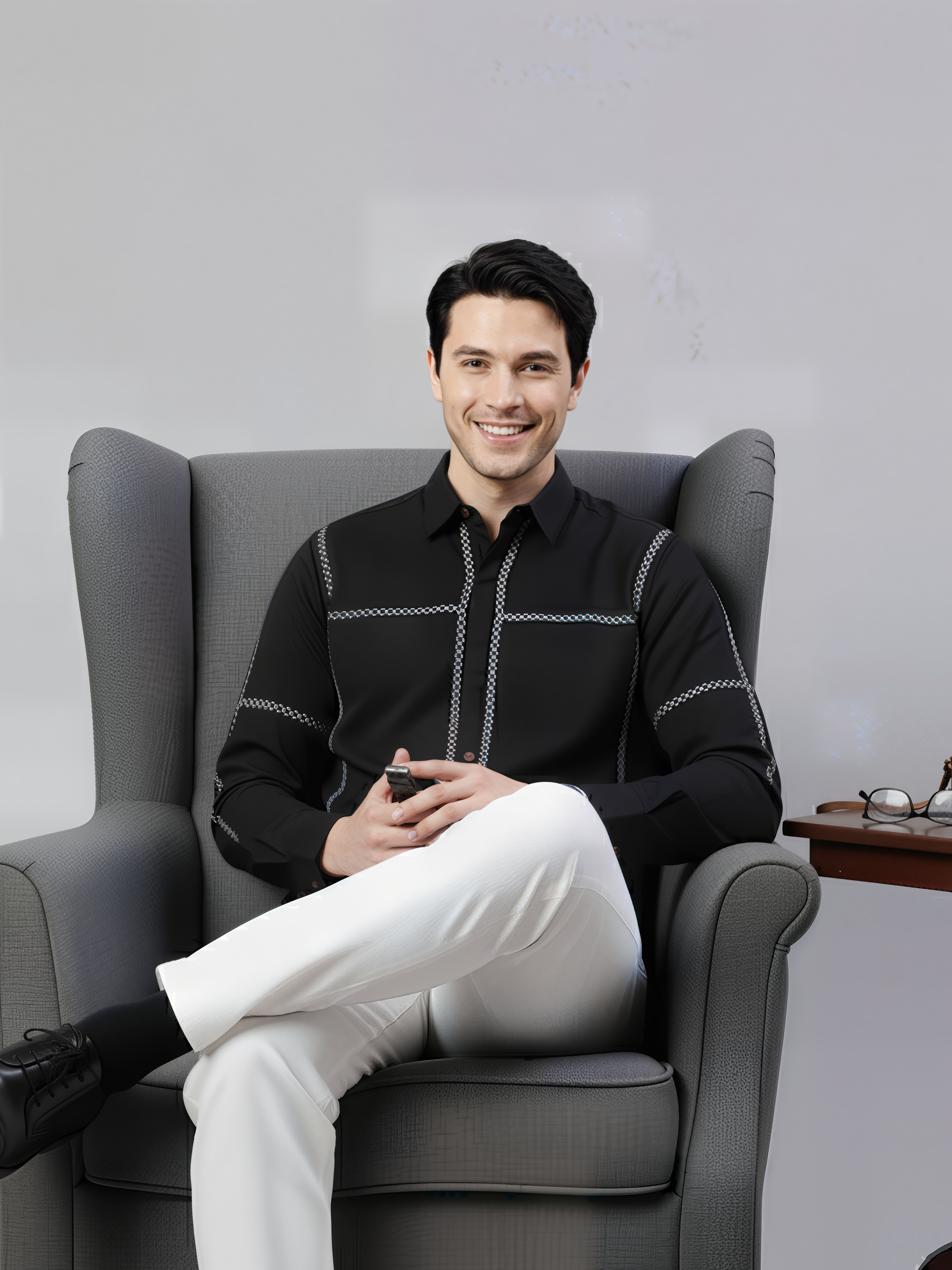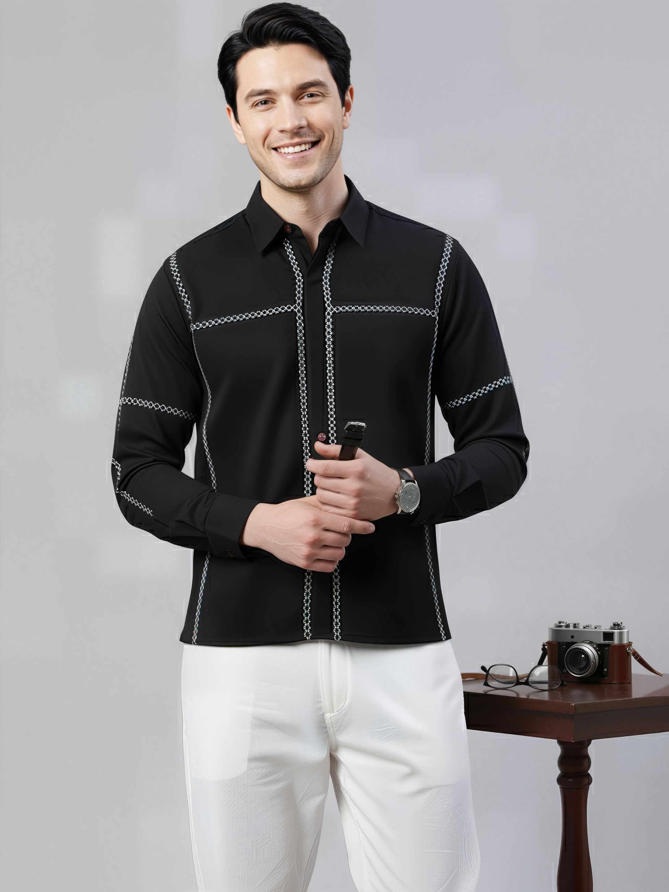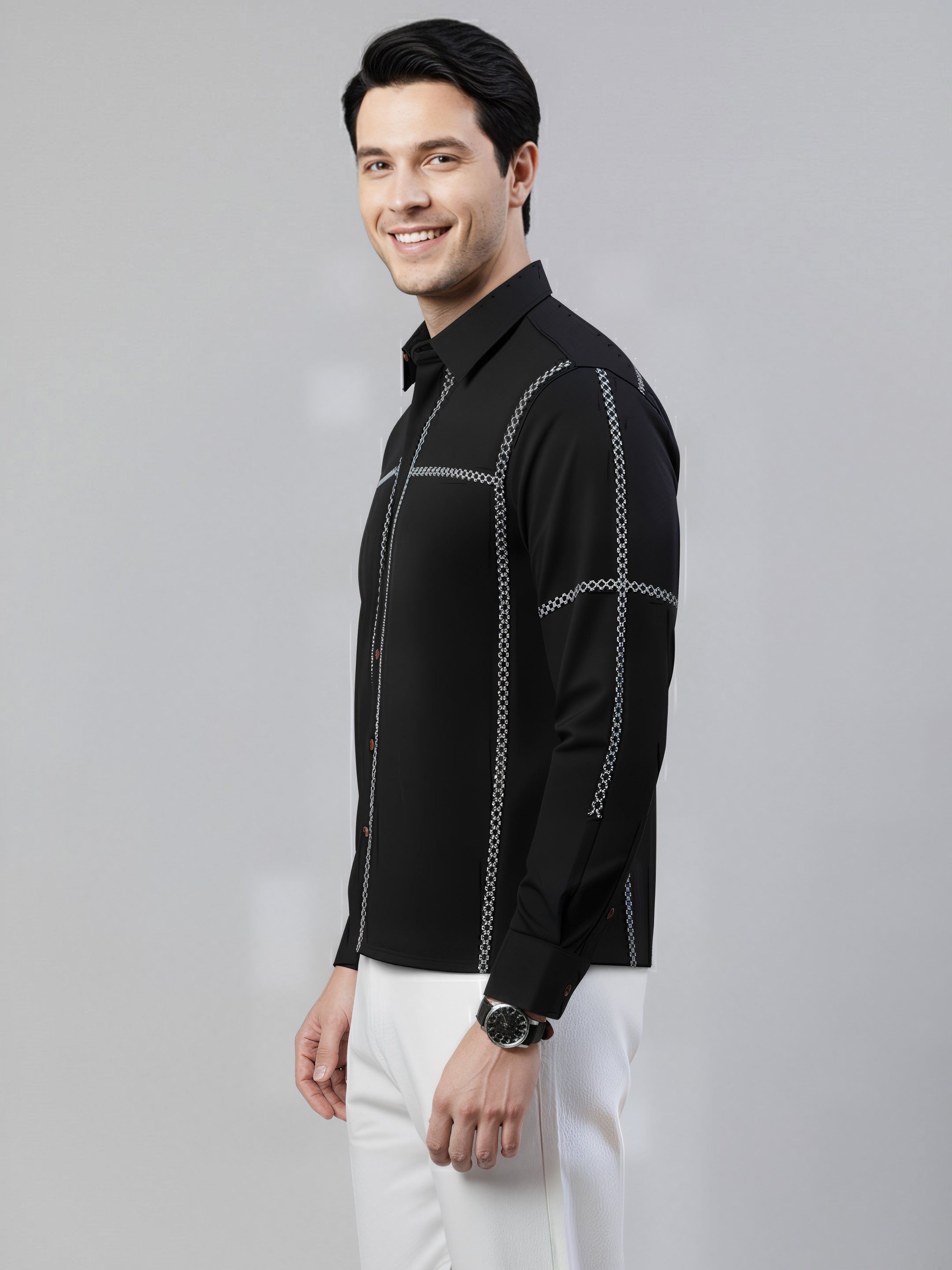 This classy black shirt with cross–stitch embroidery has a simple yet elegant look. The comfortable and durable cotton fabrics make it more reliable for every occasion.